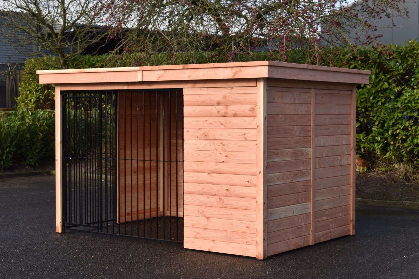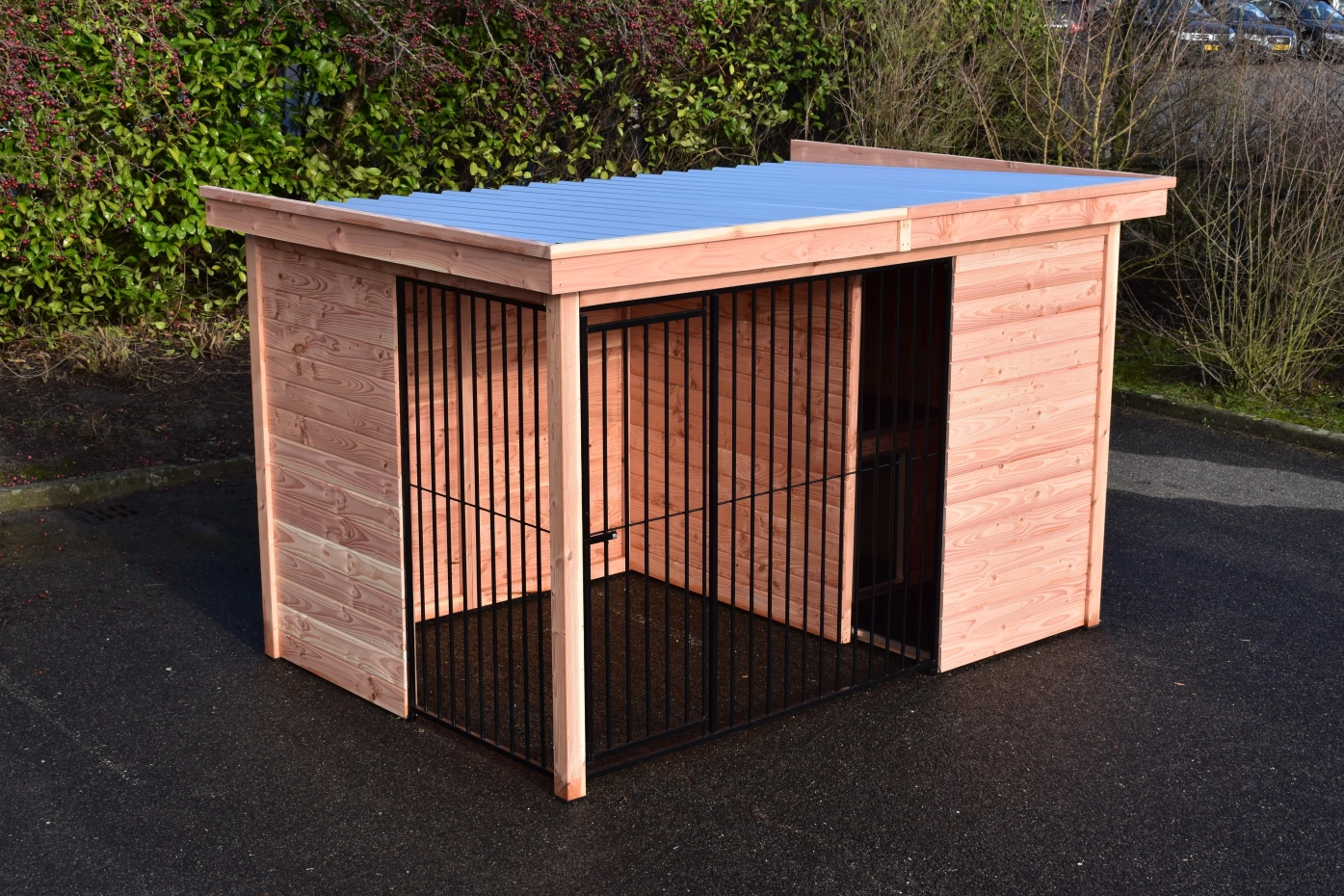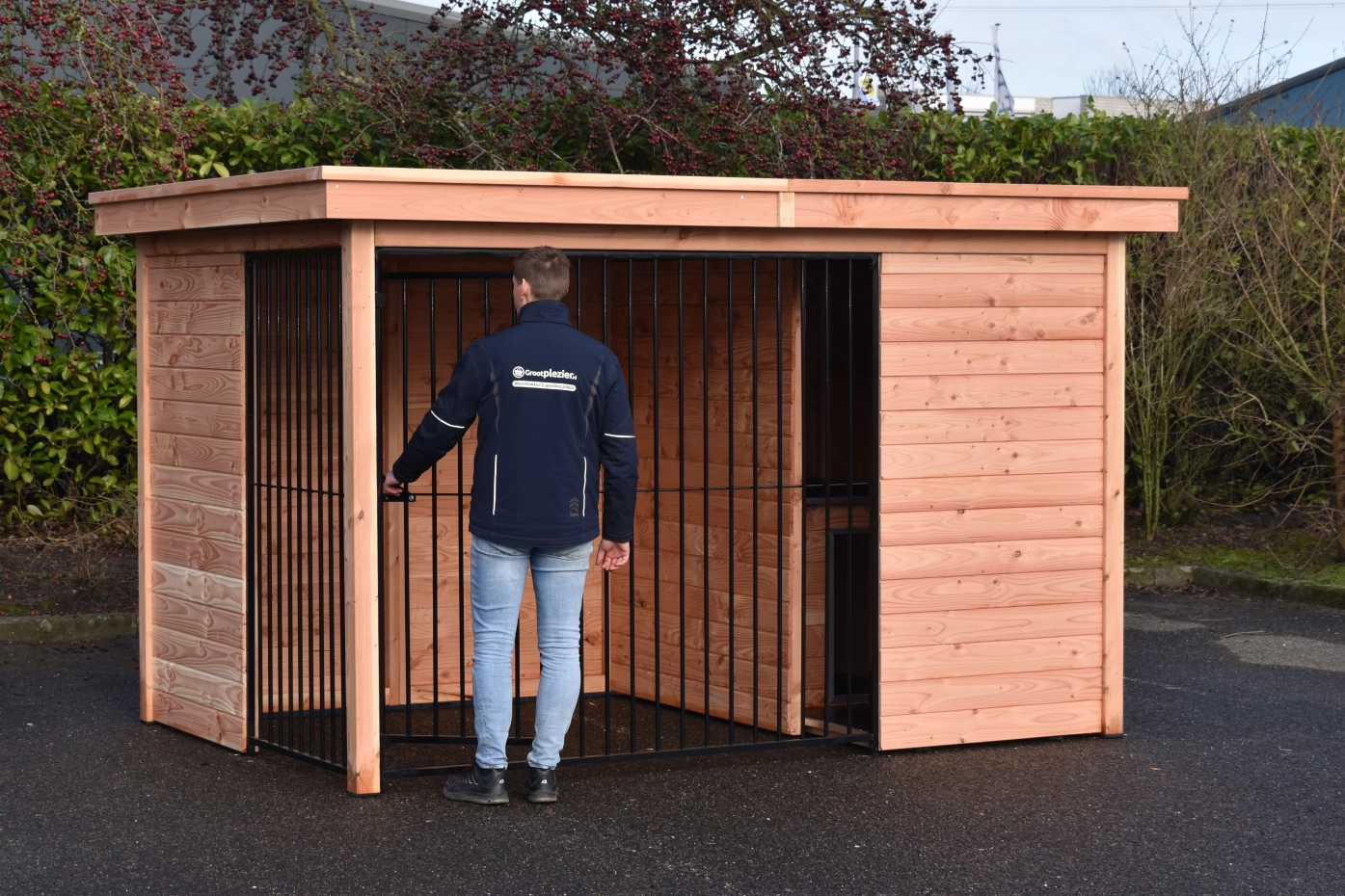 Diese Douglas Hundezwinger Modul Forz ist eine luxuriöse, langlebige Wahl, kombiniert mit dem Hundehaus Easy. Der Zwinger besteht aus robusten Douglasienholzplatten und einem stabilen Holzrahmen. Das geräumige Schlafhaus Easy verfügt über ein aufklappbares Dach, was die Reinigung erleichtert. Die Wände des Zwingers bestehen aus Holzrahmen mit Nut- und Federbrettern, was für eine stabile und gut geschlossene Unterkunft sorgt. Das schwarze Stahlgitter harmoniert stilvoll mit dem Douglasienholz. Ausgestattet mit Stahlblechdachplatten mit einer Filzunterlage, um Kondensbildung zu verhindern. Douglasienholz hat eine lange Lebensdauer und muss nicht behandelt werden. Es wird jedoch mit der Zeit vergrauen; wenn Sie dies vermeiden möchten, empfehlen wir, den Zwinger zu lasieren.