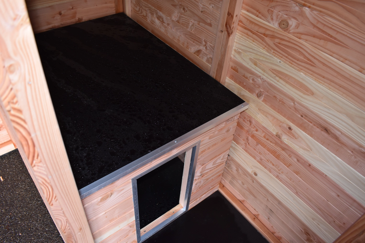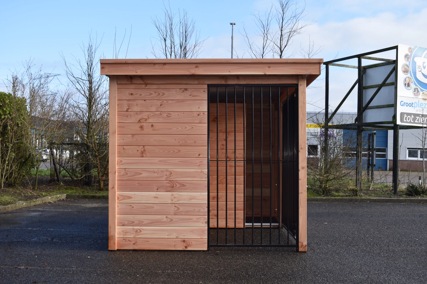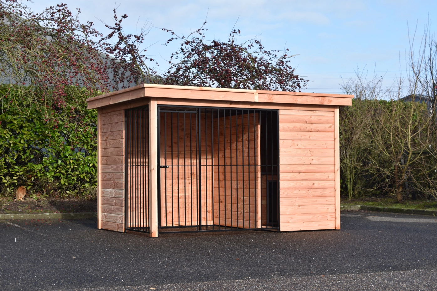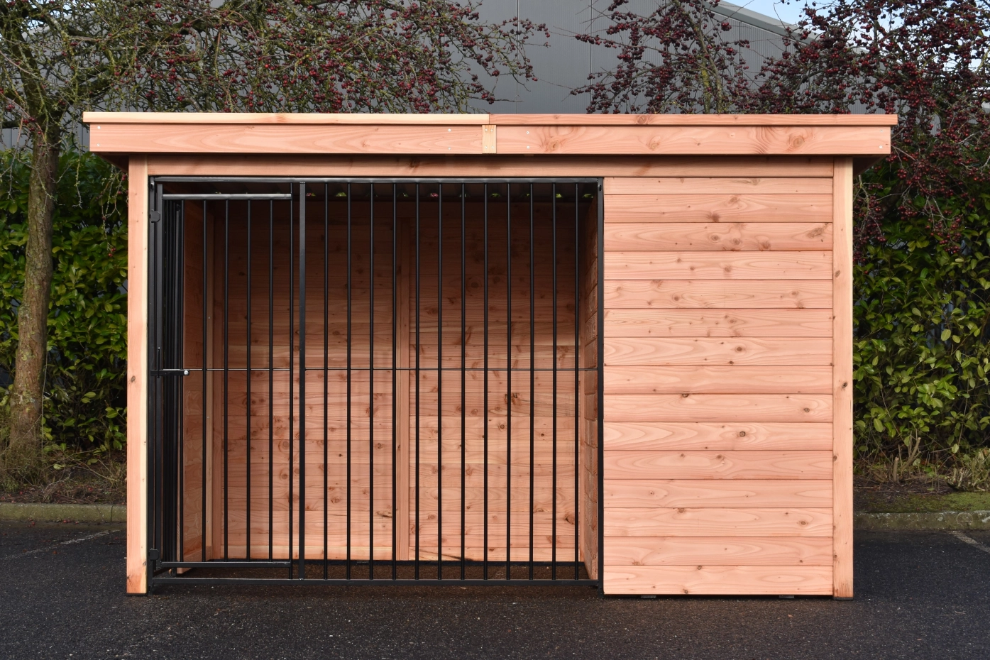 Diese Douglas Hundezwinger Modul Forz ist eine luxuriöse, langlebige Wahl, kombiniert mit dem Hundehaus Easy. Der Zwinger besteht aus robusten Douglasienholzplatten und einem stabilen Holzrahmen. Das geräumige Schlafhaus Easy verfügt über ein aufklappbares Dach, was die Reinigung erleichtert. Die Wände des Zwingers bestehen aus Holzrahmen mit Nut- und Federbrettern, was für eine stabile und gut geschlossene Unterkunft sorgt. Das schwarze Stahlgitter harmoniert stilvoll mit dem Douglasienholz. Ausgestattet mit Stahlblechdachplatten mit einer Filzunterlage, um Kondensbildung zu verhindern. Douglasienholz hat eine lange Lebensdauer und muss nicht behandelt werden. Es wird jedoch mit der Zeit vergrauen; wenn Sie dies vermeiden möchten, empfehlen wir, den Zwinger zu lasieren.