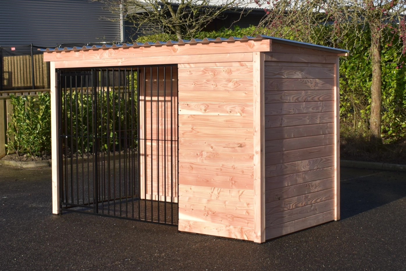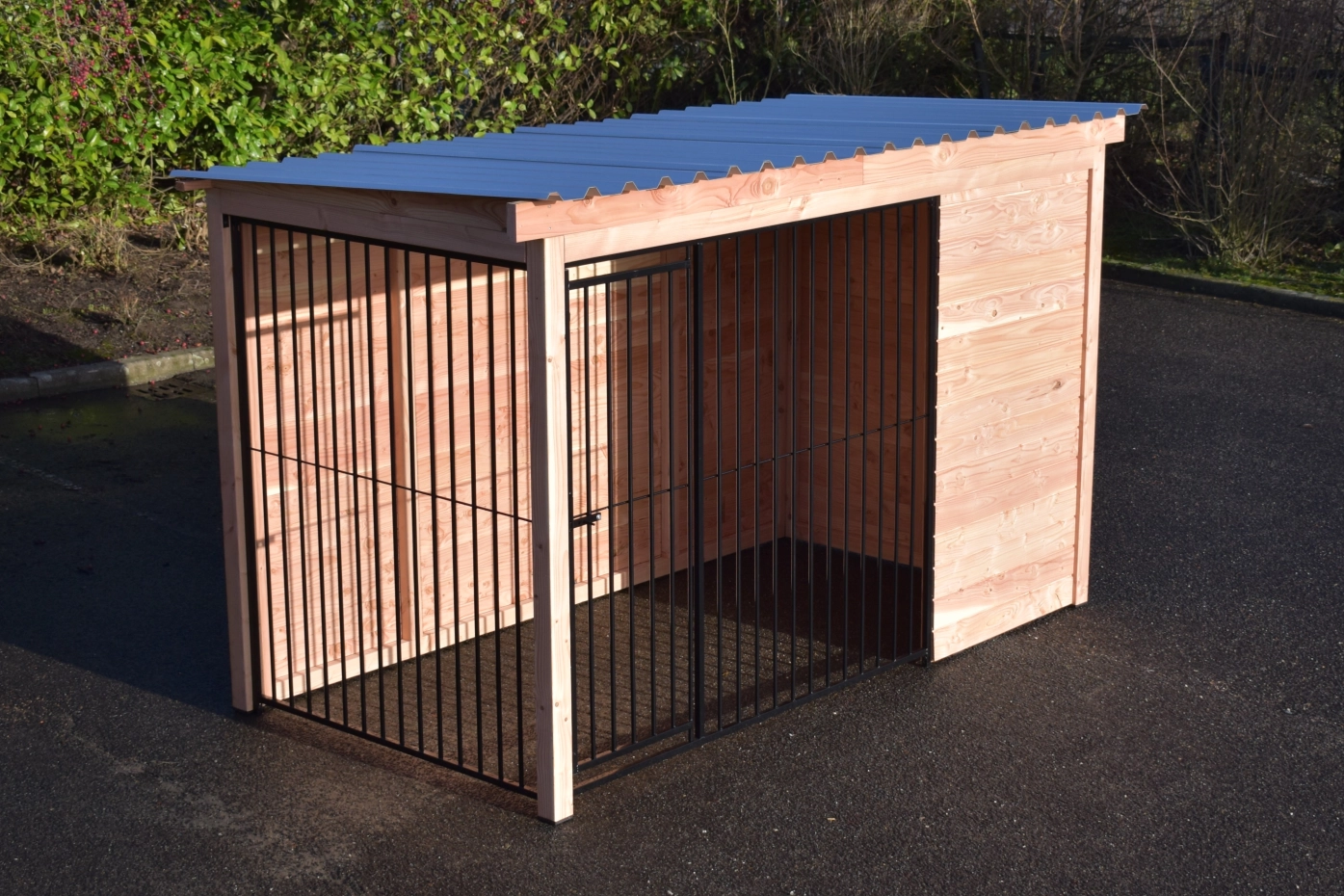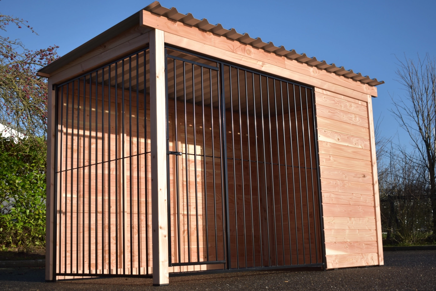 Der Hundezwinger Modul FORZ hat ein Douglasien Holzrahmen. Mit der Holzpaneele aus Douglasienholz und der schwarze Paneele, ist es ein schöne Zwinger. Um die Farbe des Holzes zu erhalten, können Sie es mit Douglasöl behandeln. Auch ohne weitere Behandlung ist Douglasie sehr dauerhaft. Das Dach ist ausgestattet mit Wellbleche.