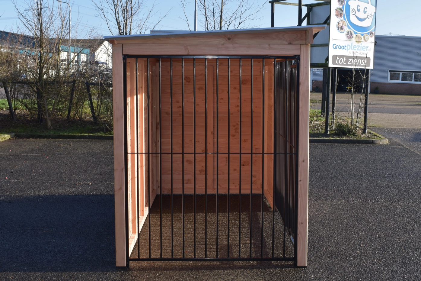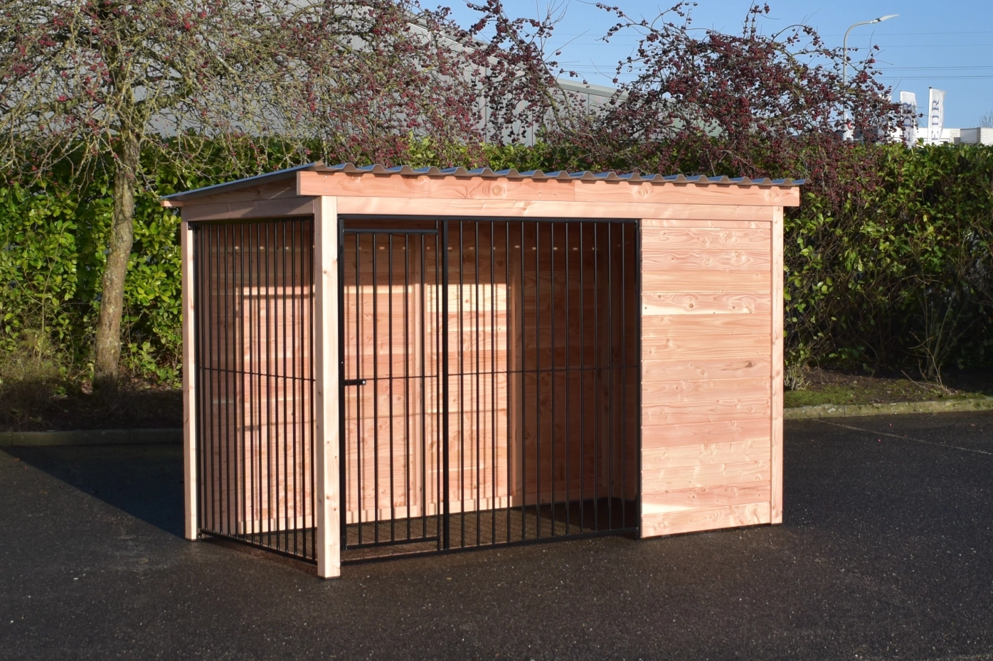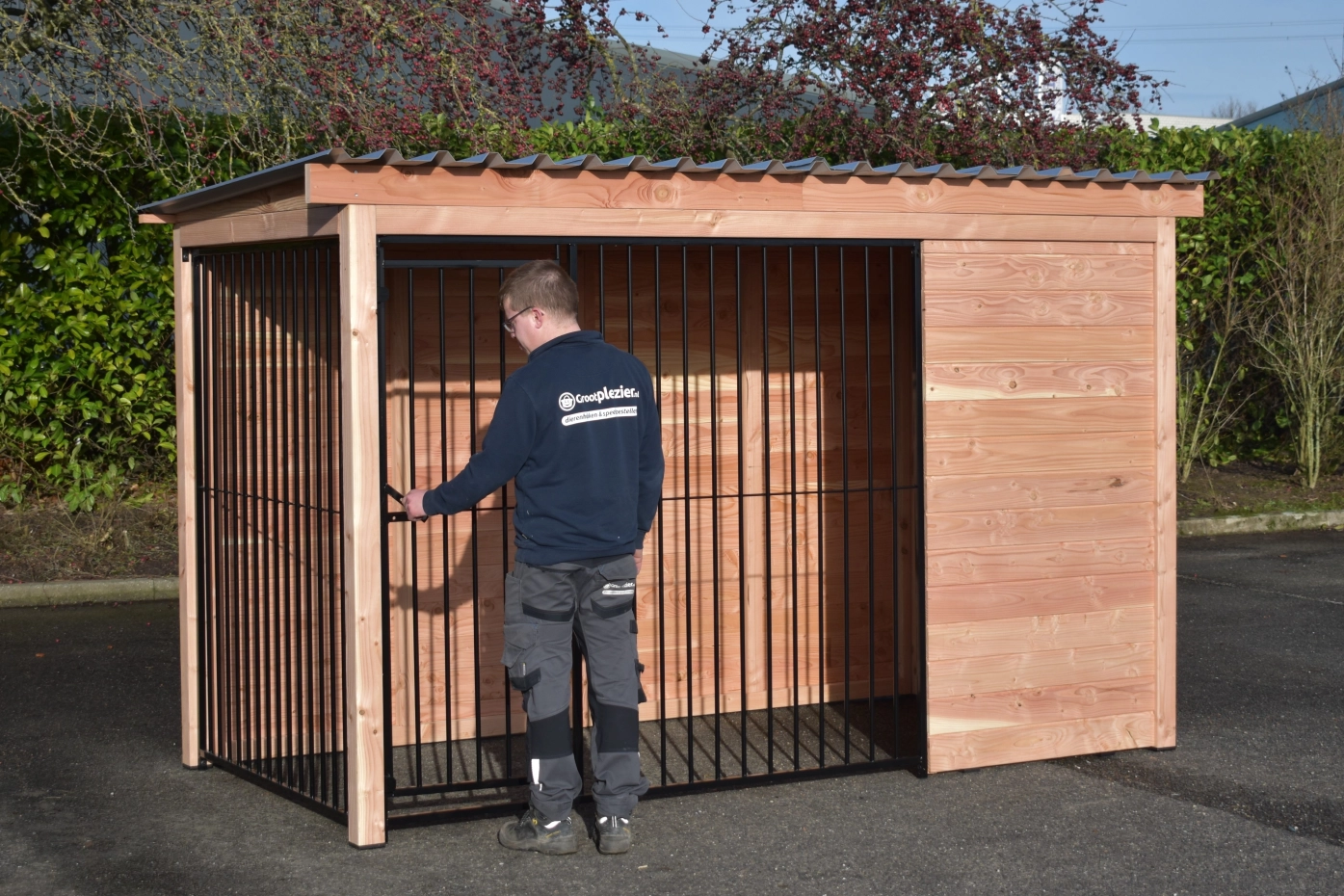 Der Hundezwinger Modul FORZ hat ein Douglasien Holzrahmen. Mit der Holzpaneele aus Douglasienholz und der schwarze Paneele, ist es ein schöne Zwinger. Um die Farbe des Holzes zu erhalten, können Sie es mit Douglasöl behandeln. Auch ohne weitere Behandlung ist Douglasie sehr dauerhaft. Das Dach ist ausgestattet mit Wellbleche.