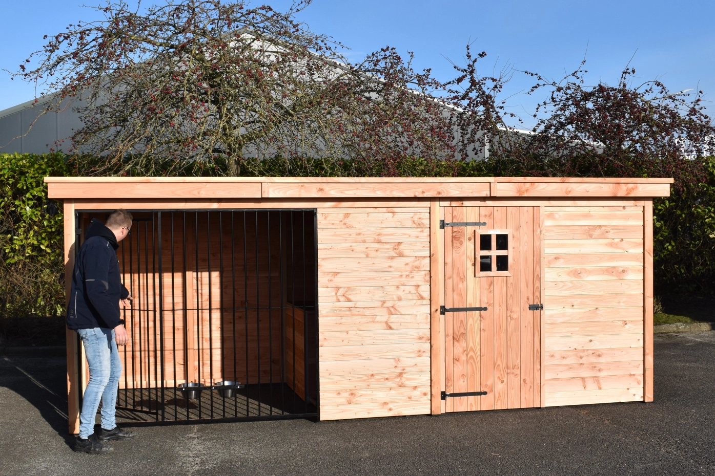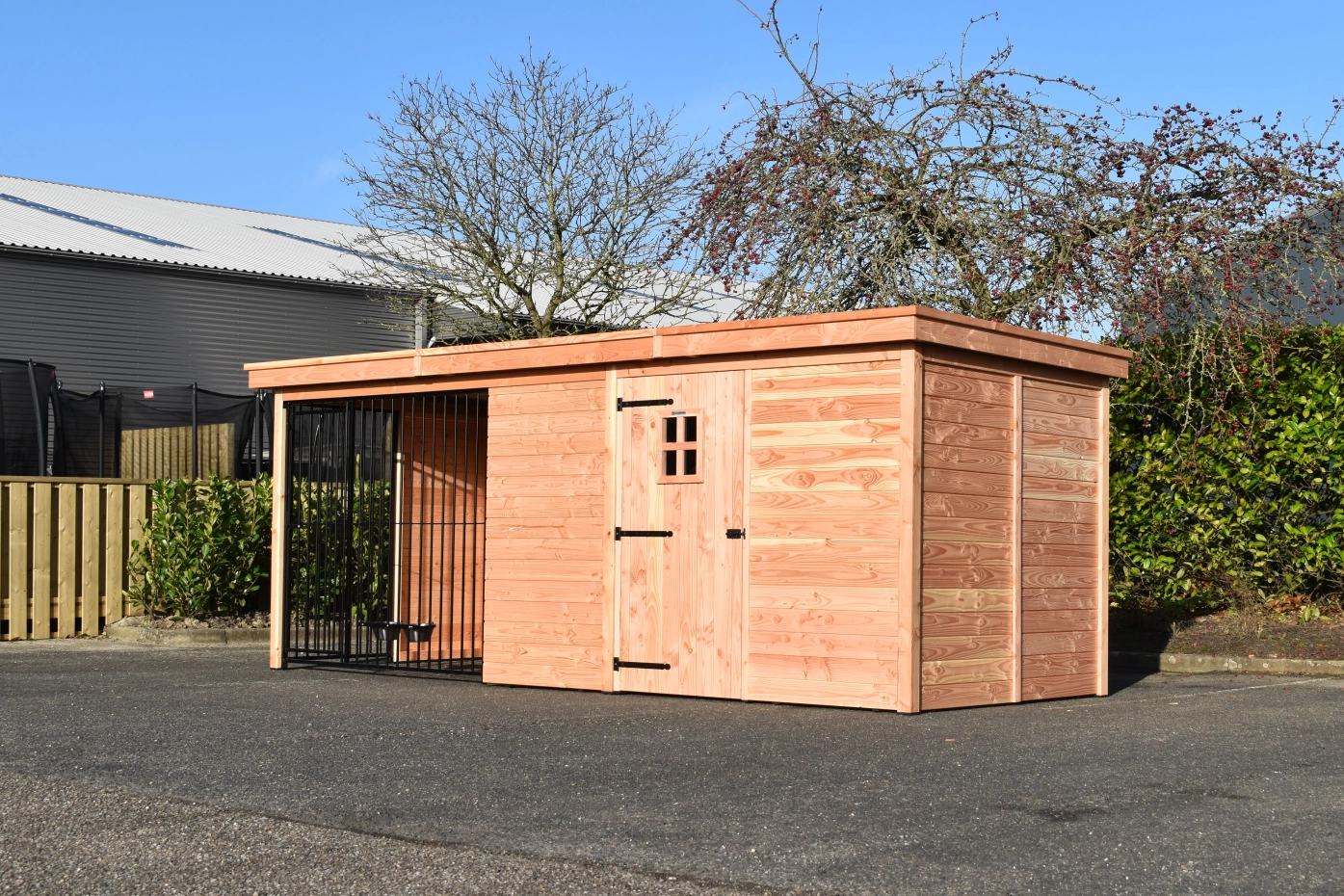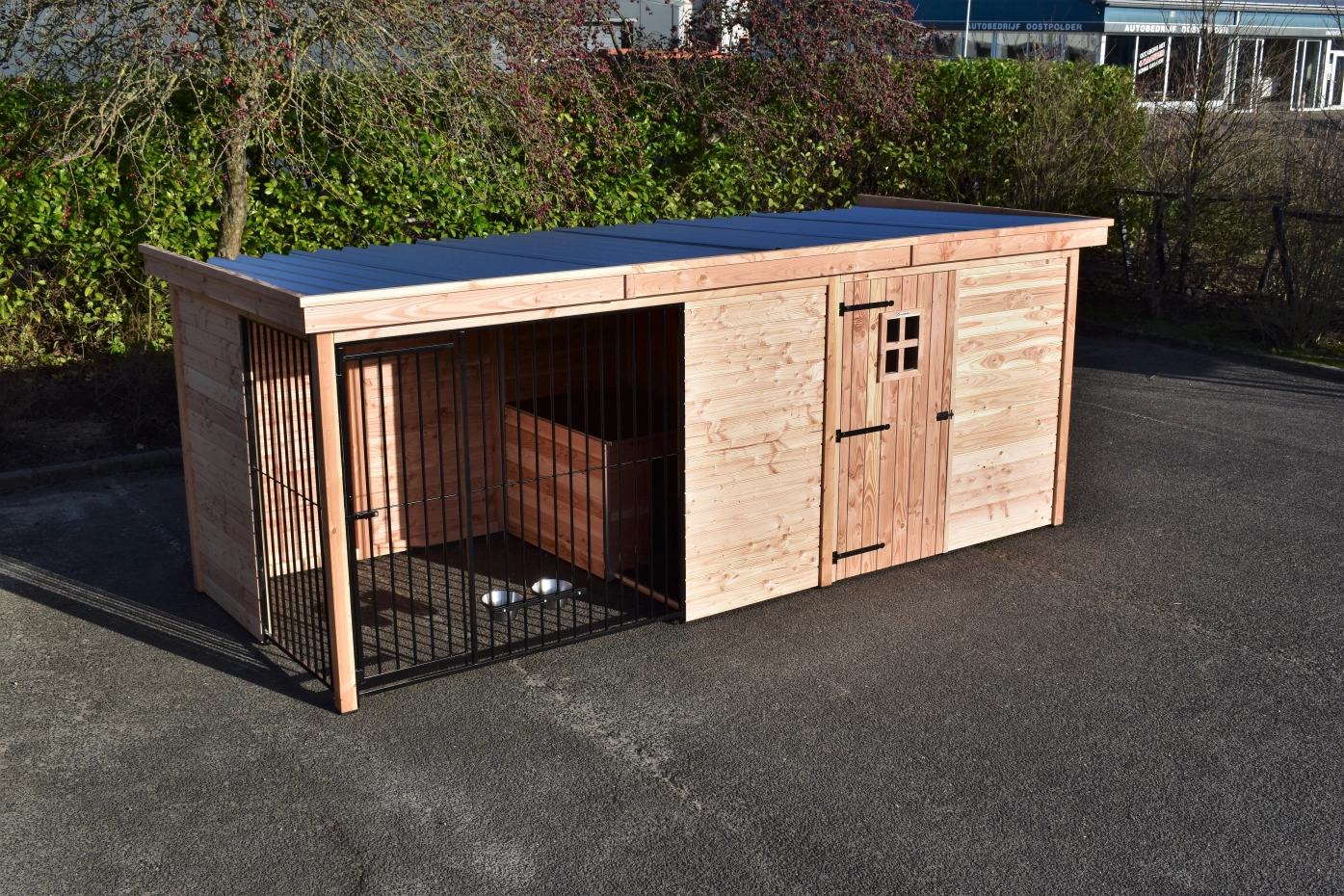 Hundezwinger Modul FORZ mit luxuriösem Schlafplatz und Schuppen. Wunderschöne Kombination: Schuppen und Hundehütte unter einem Dach! Gefertigt aus langlebigem Douglasienholz mit stabilen Pfosten von 9x9 cm. Mit einem schönen Überstand versehen, sodass die Dachplatten nicht sichtbar sind. Die Stahl-Dachplatten haben eine Filzunterseite, die Kondensation reduziert und Regen auf dem Dach dämpft. Die Hundehütte hat ein klappbares Dach für eine besonders einfache Reinigung! Ein beeindruckender Zwinger mit langer Lebensdauer. Ein Highlight für Ihren Garten!