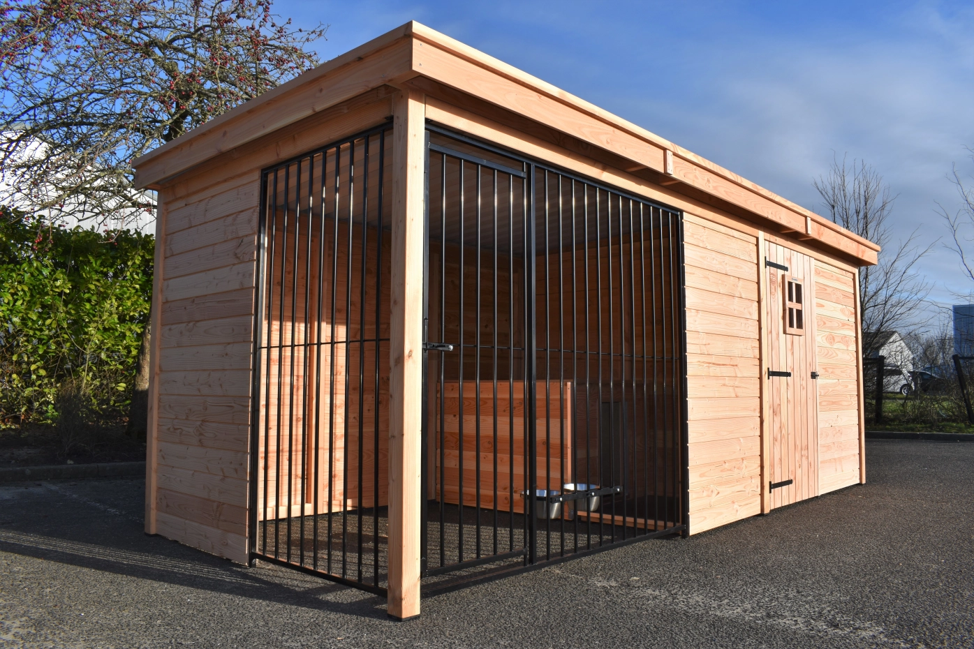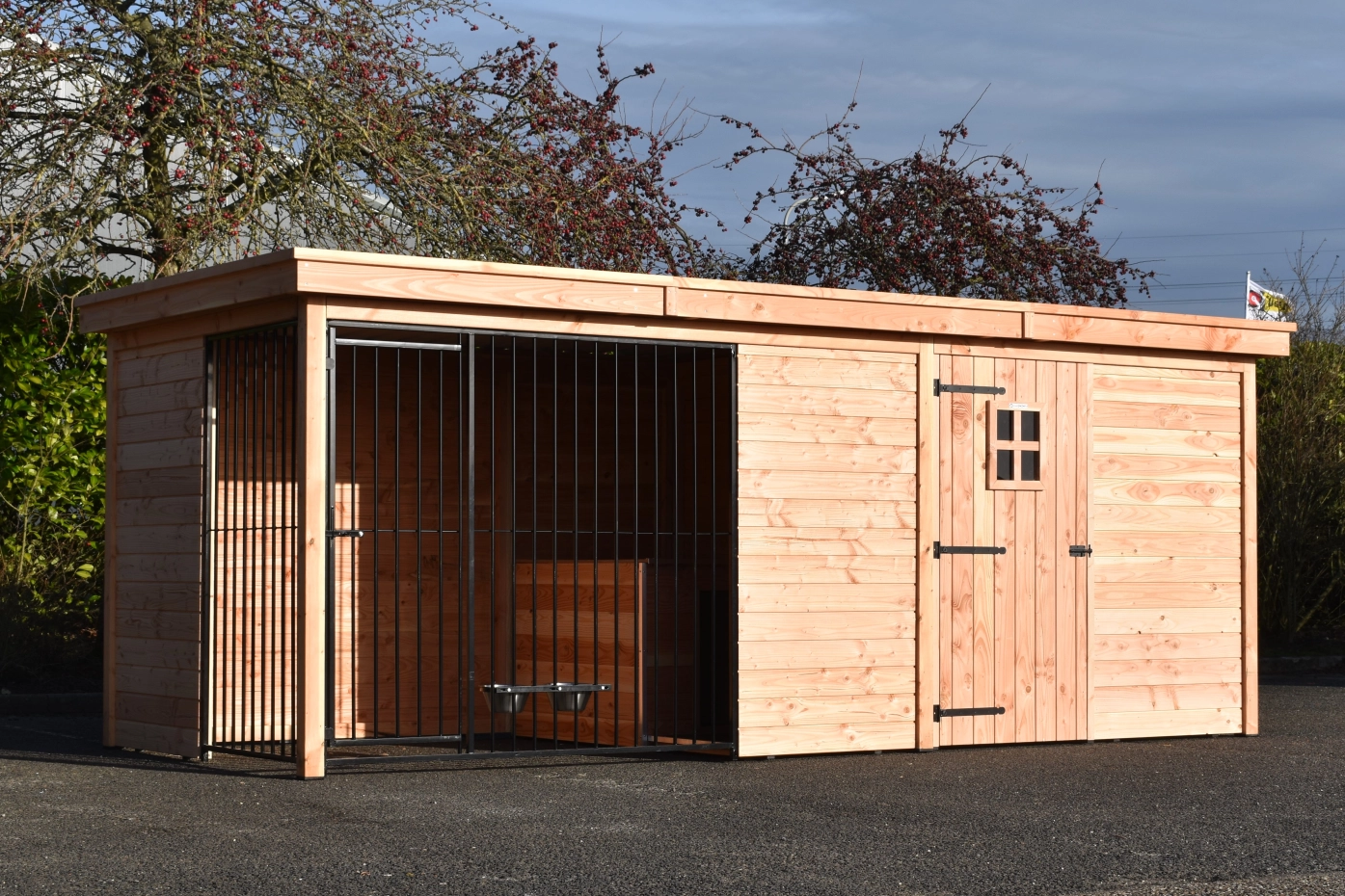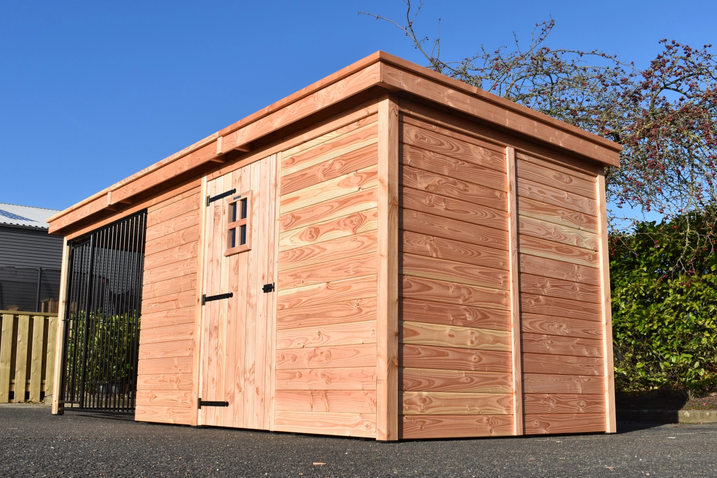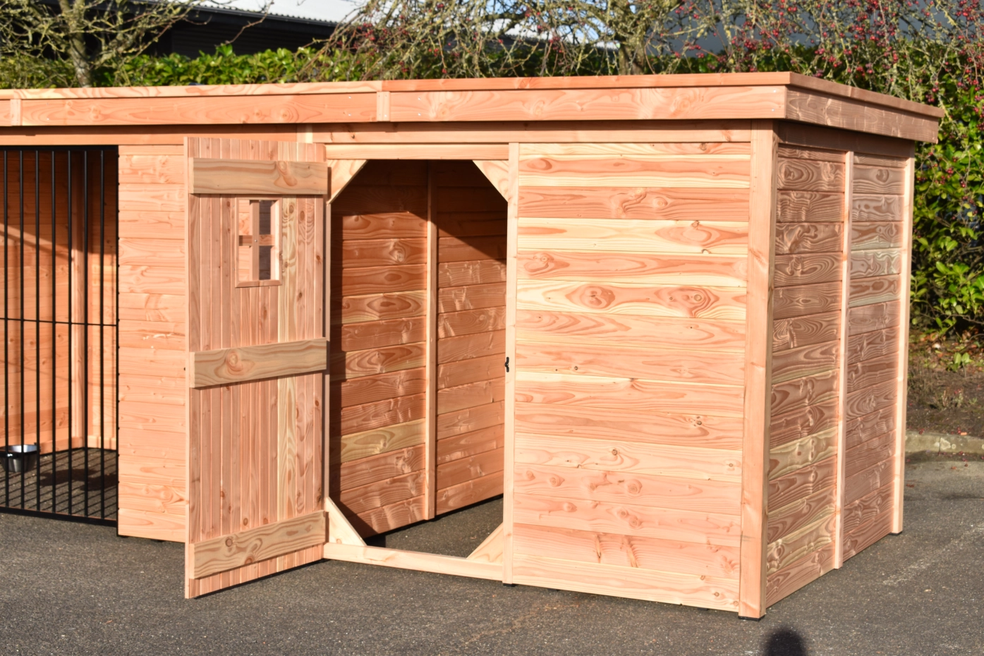 Hundezwinger Modul FORZ mit luxuriösem Schlafplatz und Schuppen. Wunderschöne Kombination: Schuppen und Hundehütte unter einem Dach! Gefertigt aus langlebigem Douglasienholz mit stabilen Pfosten von 9x9 cm. Mit einem schönen Überstand versehen, sodass die Dachplatten nicht sichtbar sind. Die Stahl-Dachplatten haben eine Filzunterseite, die Kondensation reduziert und Regen auf dem Dach dämpft. Die Hundehütte hat ein klappbares Dach für eine besonders einfache Reinigung! Ein beeindruckender Zwinger mit langer Lebensdauer. Ein Highlight für Ihren Garten!