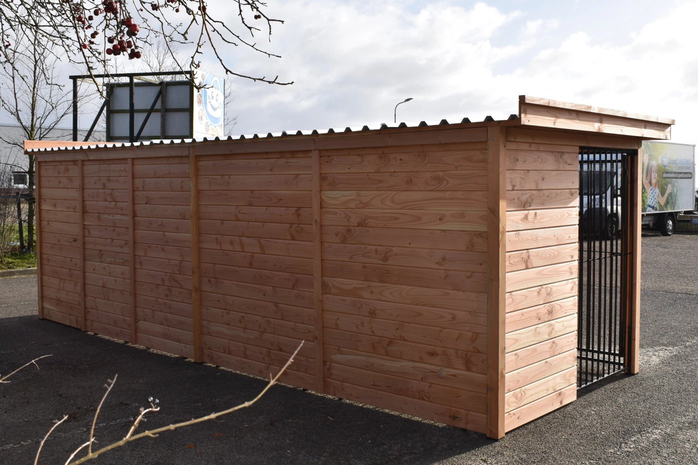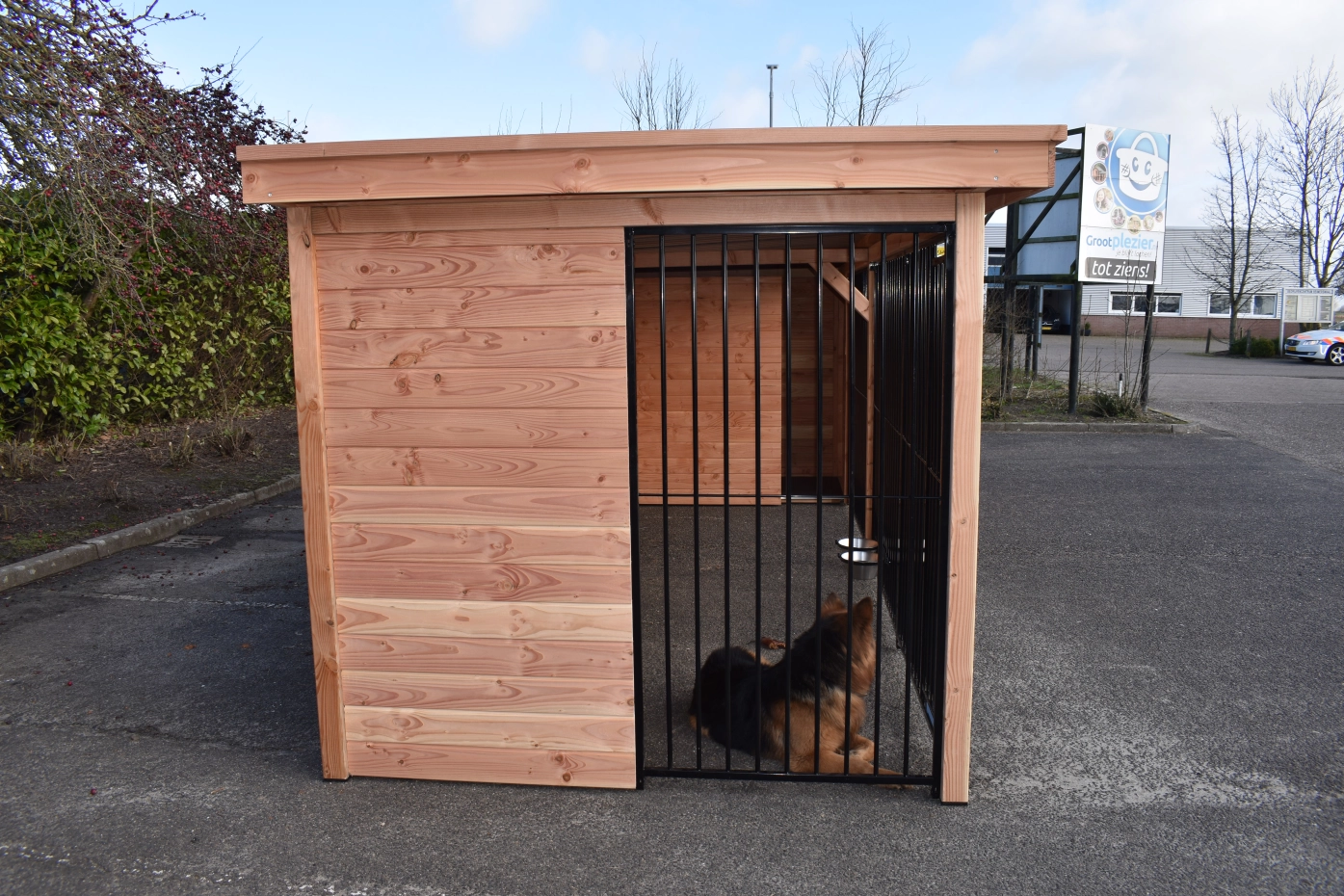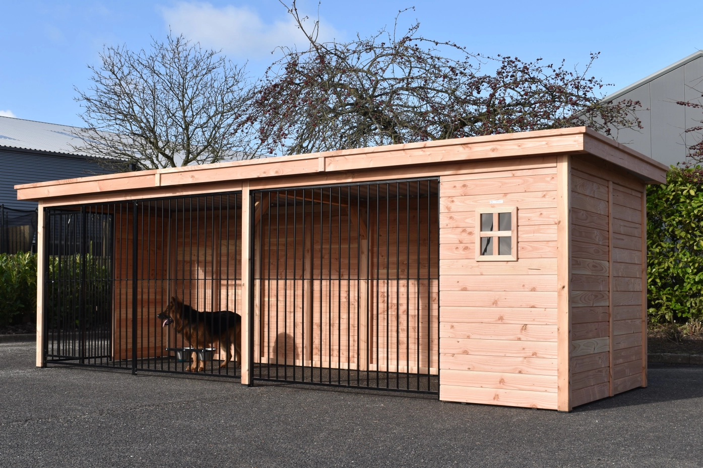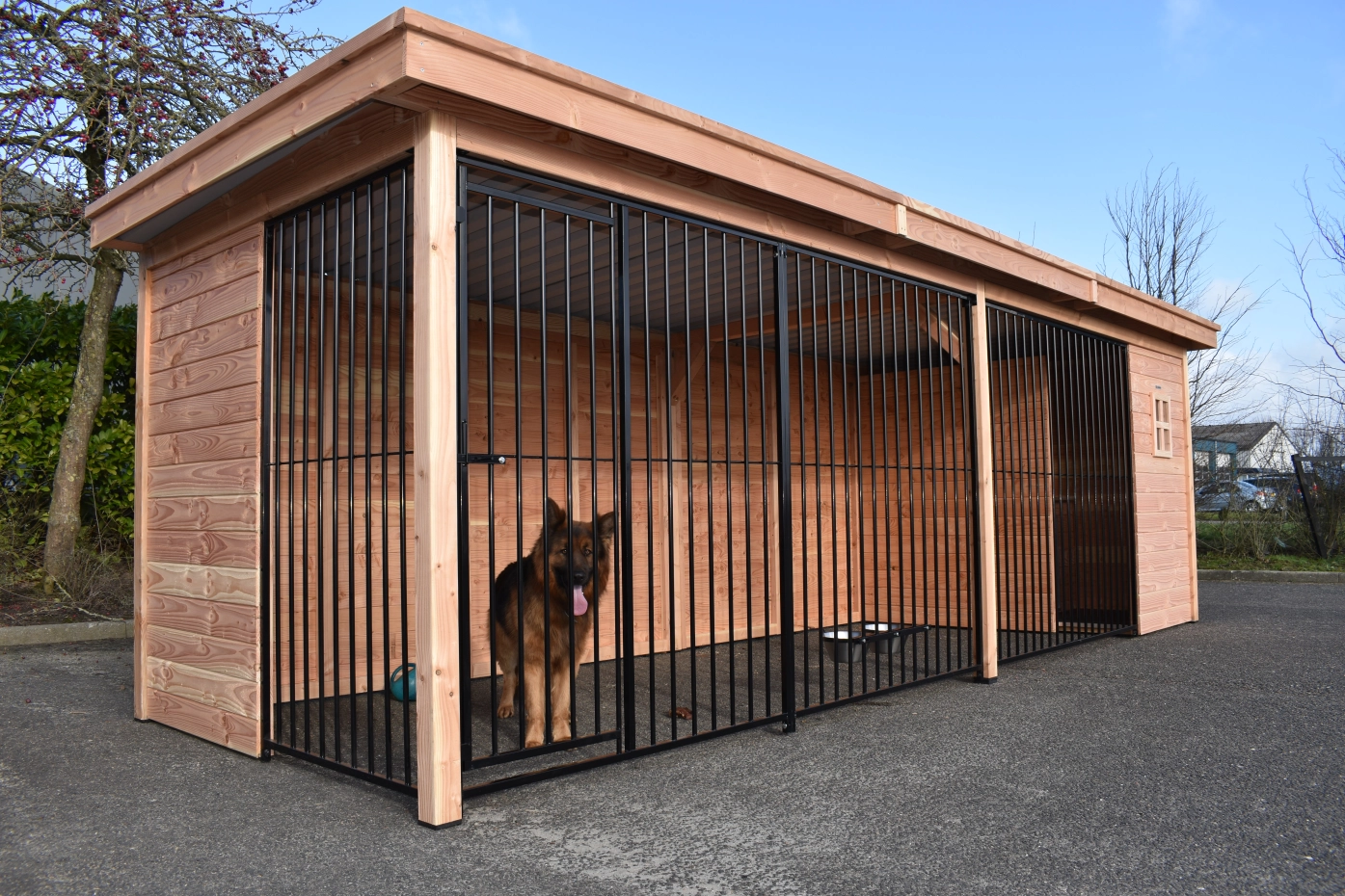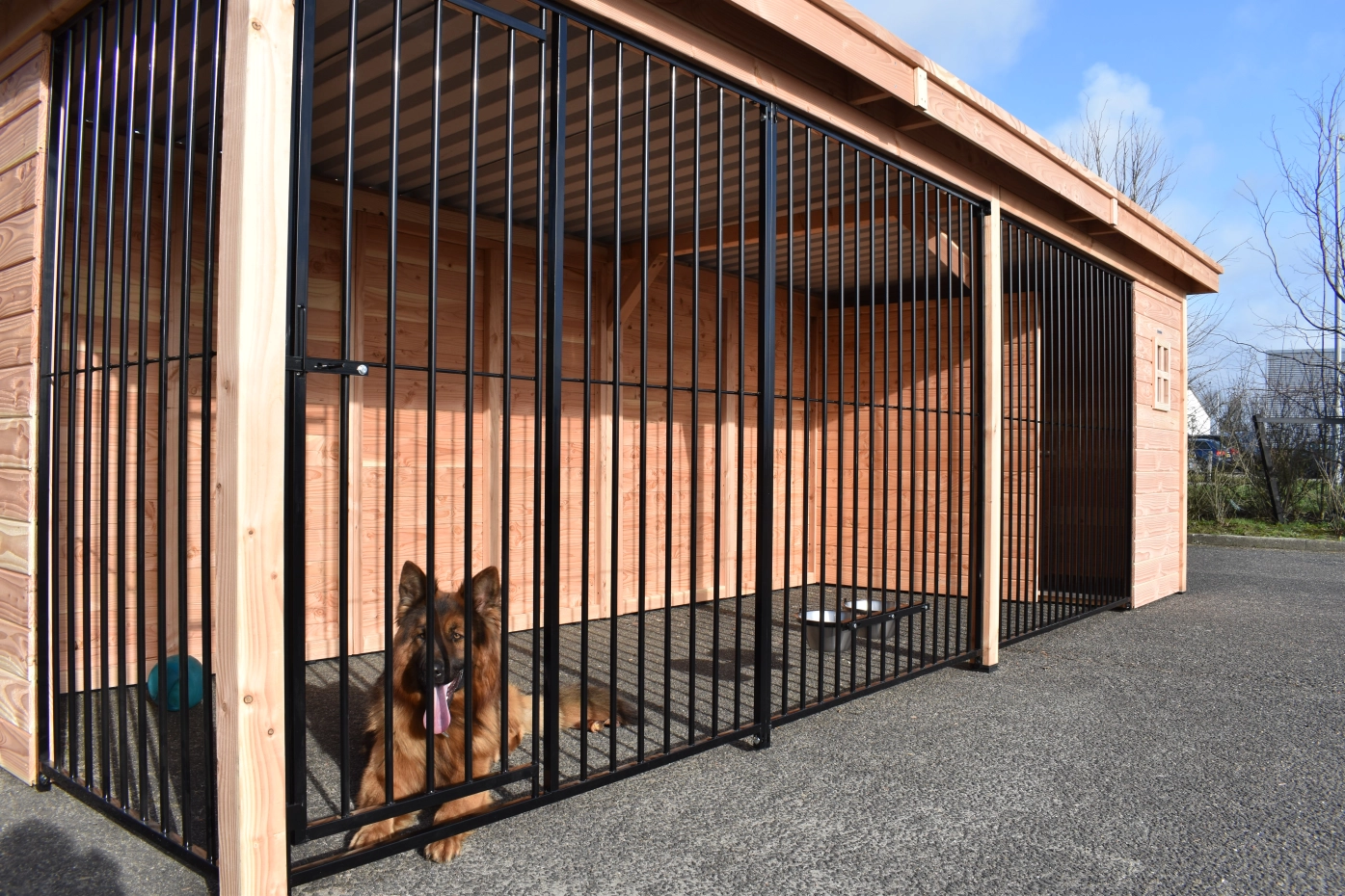 Großer Hundezwinger mit viel Platz für größere Hunde. Wunderschön und solide gebaut mit Pfosten von 9x9 cm. Mit den schwarz beschichteten Gitterpaneelen und dem Douglasienholz erhalten Sie eine wunderschöne Kombination. Die Dachplatten bestehen aus Stahl mit einer Filzschicht an der Innenseite; diese verhindert Kondensbildung und dämpft den Schall. Dieser Zwinger bietet Ihren Hunden einen herrlichen Aufenthalt und dank seiner schönen Verarbeitung sieht er auch in Ihrem Garten großartig aus! Mit dem 3D-Design-Tool können Sie zudem ganz einfach die Größe und Tiefe anpassen oder eine Schlafhütte hinzufügen.