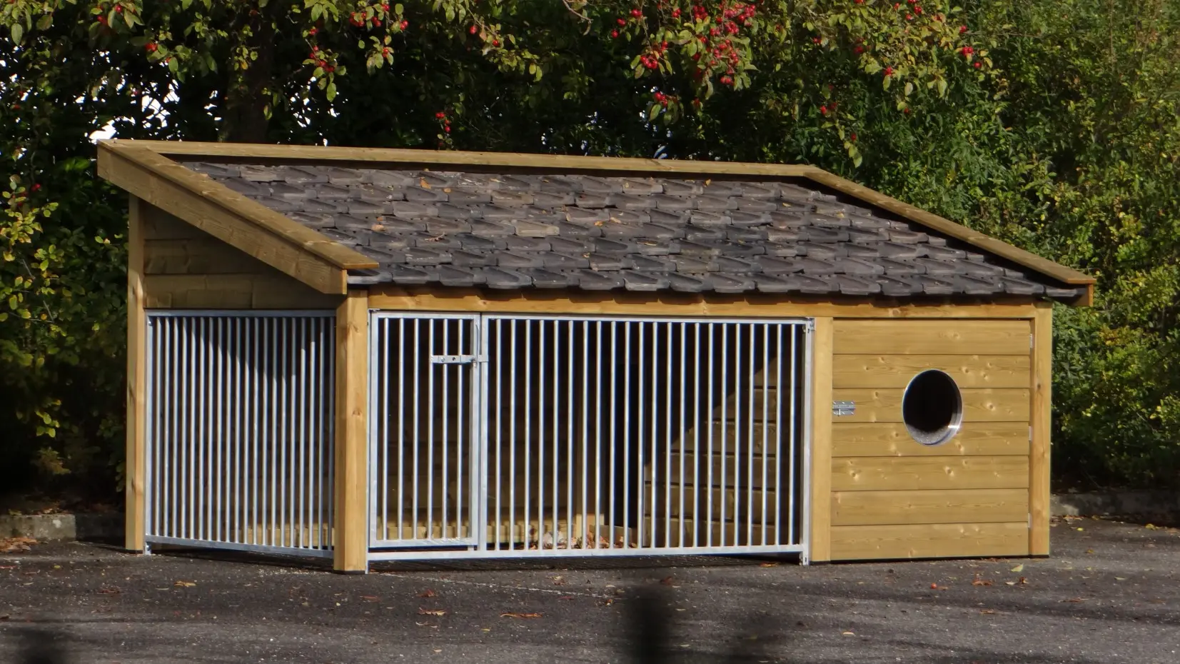 - Diese Version 2 ist versehen mit 2 Zwingerpaneele: 1 an der Vorseite (mit Tür) und 1 an der Seite.