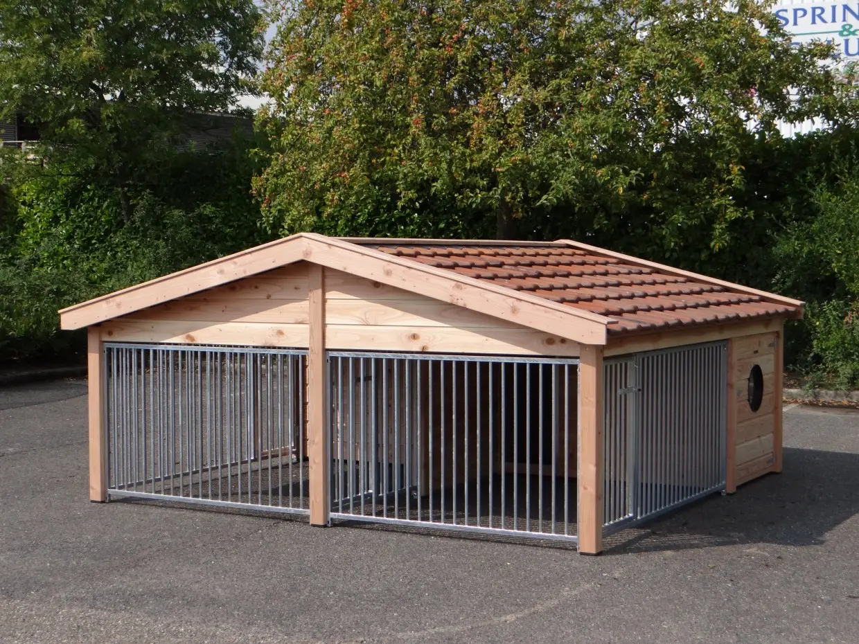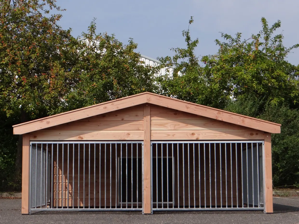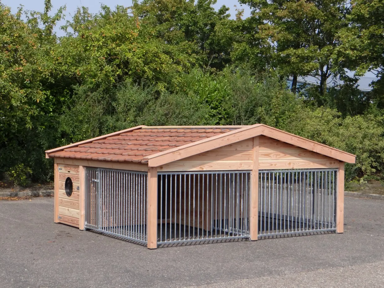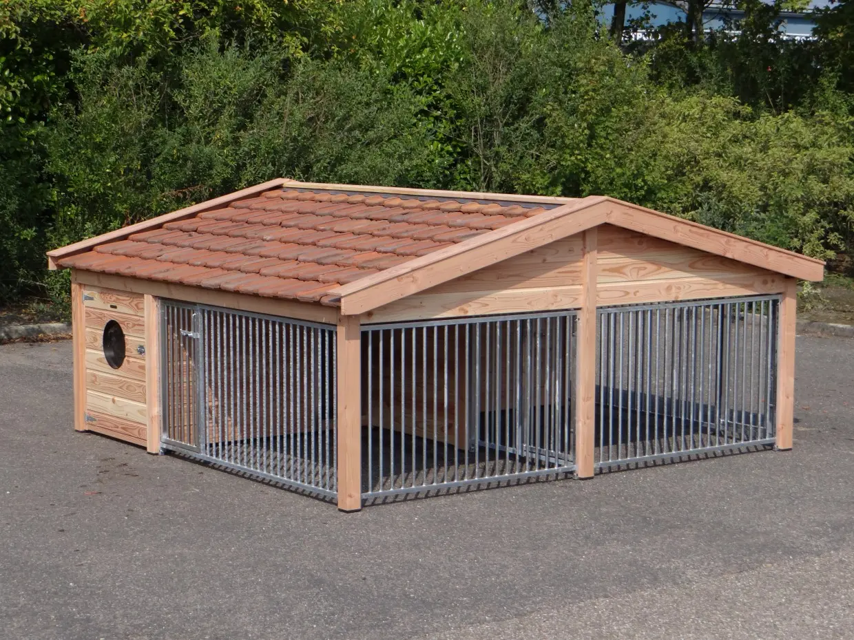 Der Hundezwinger Rex 2 Compart ist aus Douglasie gefertigt und mit gebrauchten Keramikdachziegeln ausgestattet. Die Hundehütte Rex 2 Compart ist ideal für die Unterbringung von 2 Hunden, die jedoch voneinander getrennt sind. Der Hundeauslauf wird nicht standardmäßig mit einem schwenkbaren Futtergestell geliefert, dieses ist jedoch optional erhältlich. Der Hundezwinger Rex Compart Douglas verfügt über 2 große Schlafplätze mit einem Boden aus Betonsperrholz. Der Zwinger ist mit verzinkten Paneelen ausgestattet. Es können sogar 4 Hunde darin untergebracht werden.