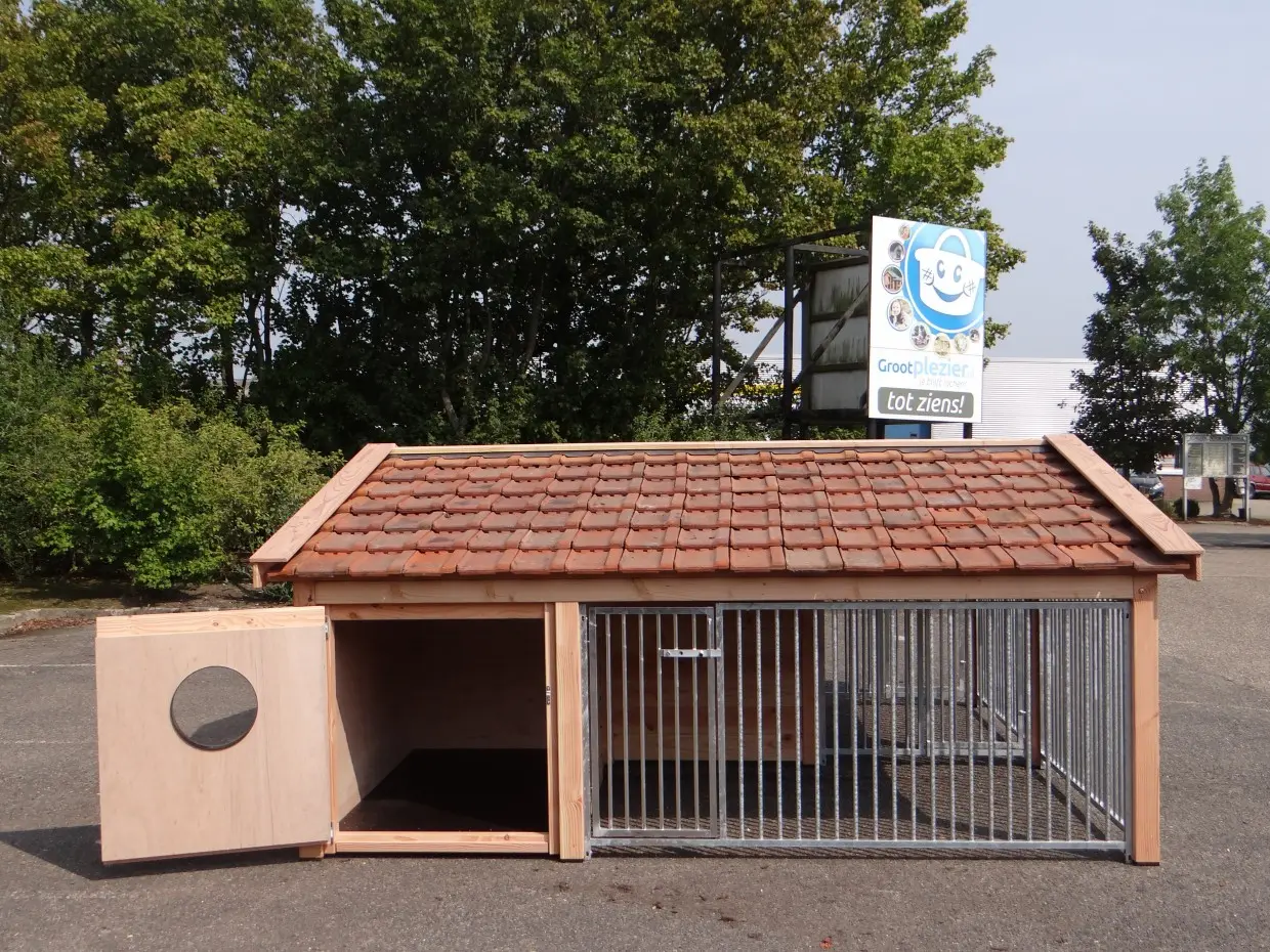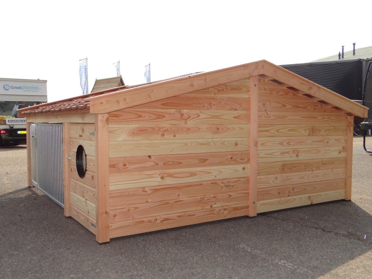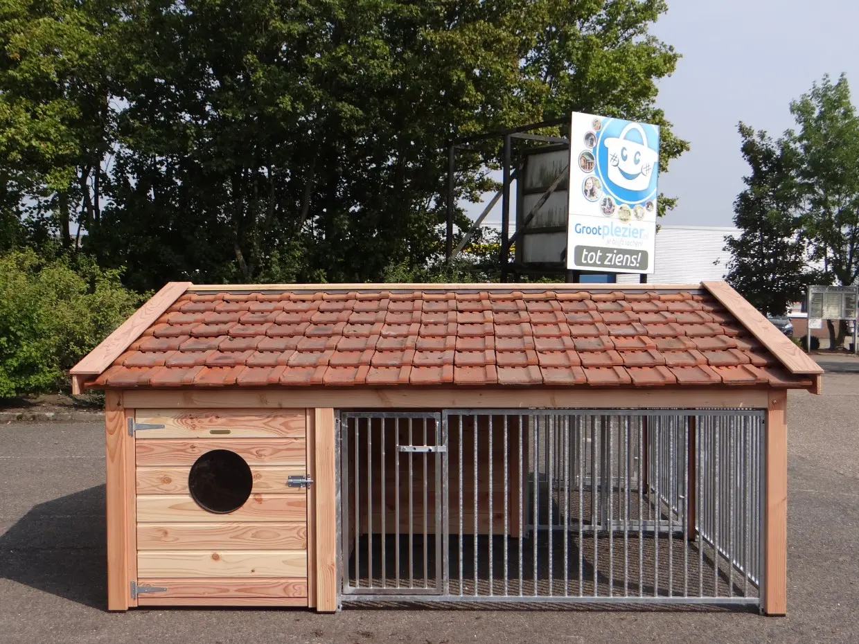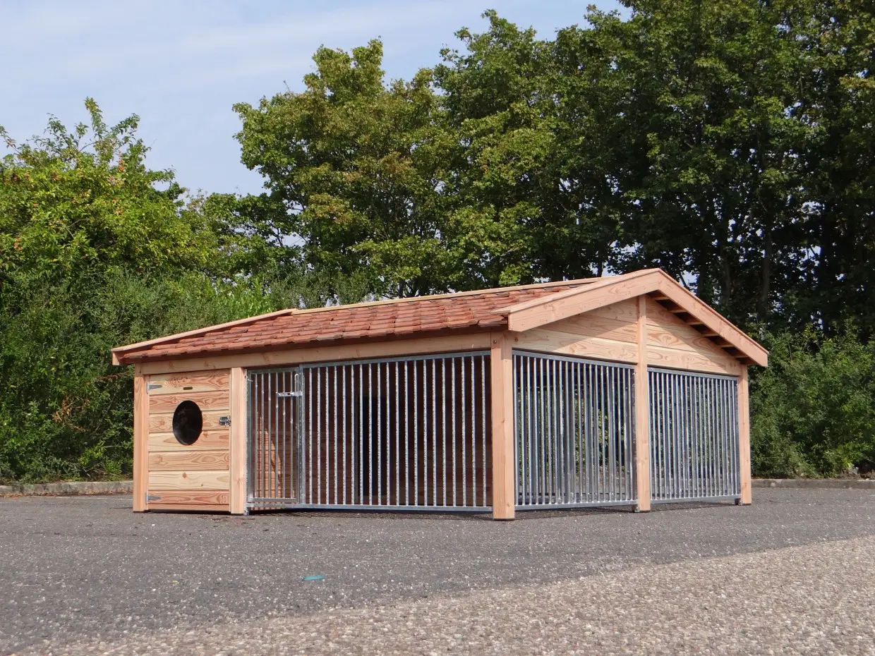 Der Hundezwinger Rex 2 Compart ist aus Douglasie gefertigt und mit gebrauchten Keramikdachziegeln ausgestattet. Die Hundehütte Rex 2 Compart ist ideal für die Unterbringung von 2 Hunden, die jedoch voneinander getrennt sind. Der Hundeauslauf wird nicht standardmäßig mit einem schwenkbaren Futtergestell geliefert, dieses ist jedoch optional erhältlich. Der Hundezwinger Rex Compart Douglas verfügt über 2 große Schlafplätze mit einem Boden aus Betonsperrholz. Der Zwinger ist mit verzinkten Paneelen ausgestattet. Es können sogar 4 Hunde darin untergebracht werden.