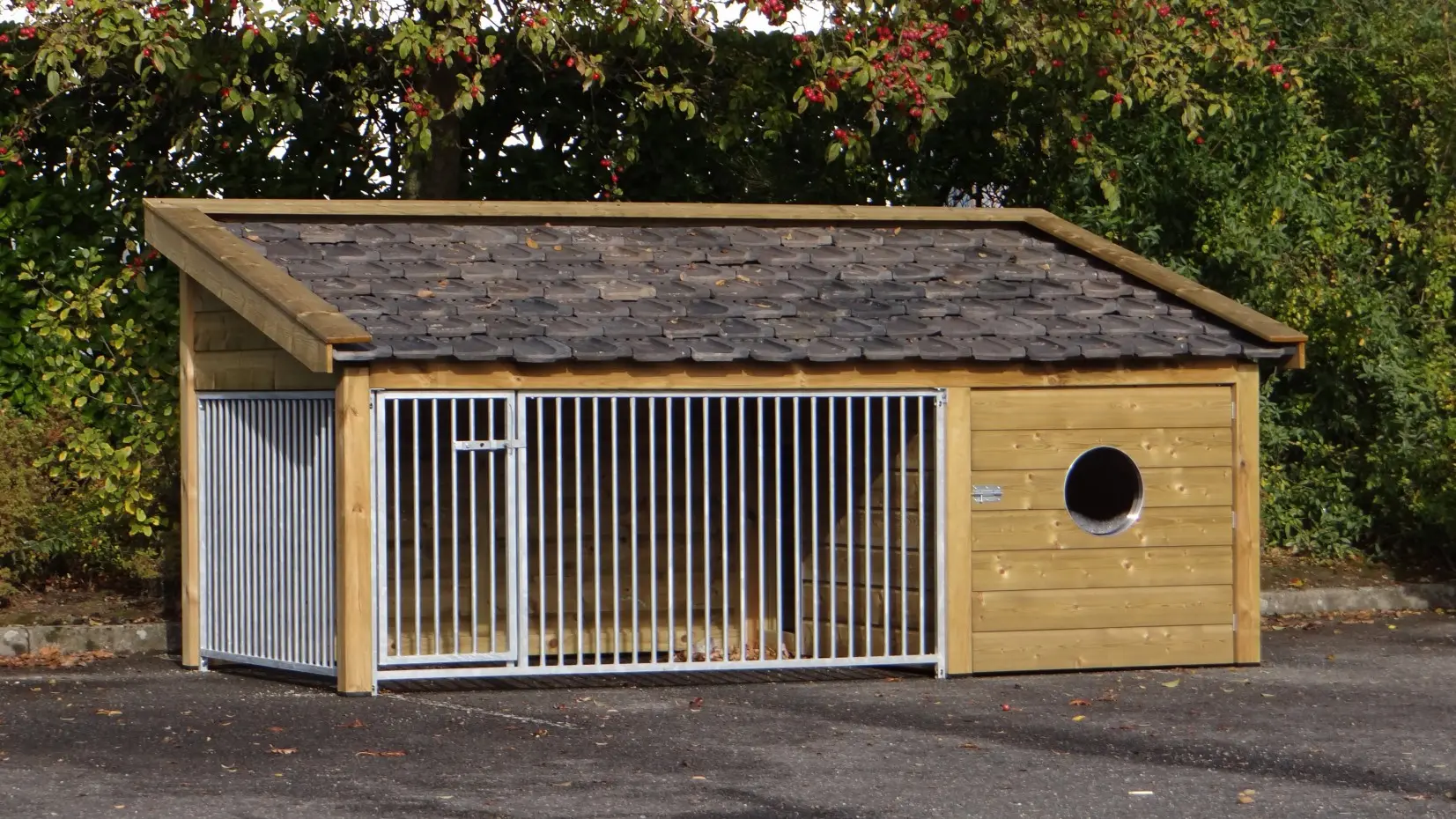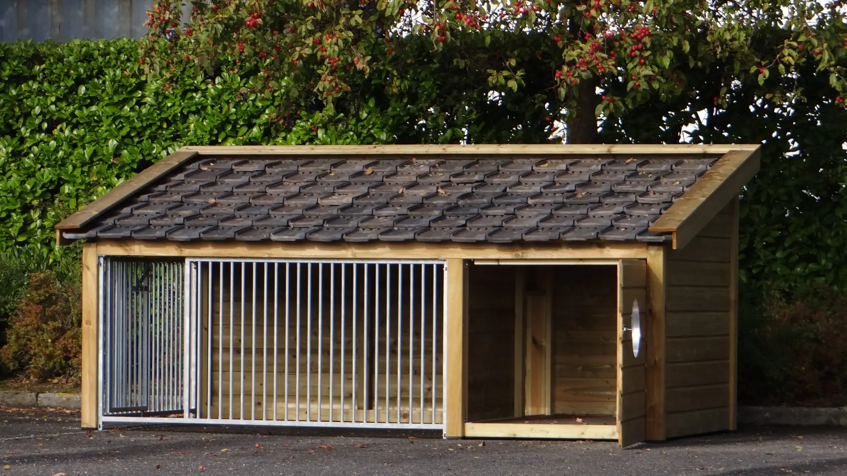 - Diese Version 2 ist versehen mit 2 Zwingerpaneele: 1 an der Vorseite (mit Tür) und 1 an der Seite.