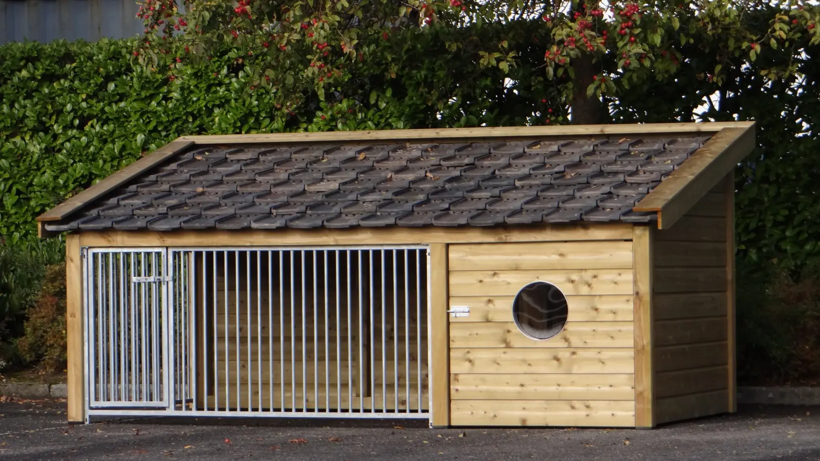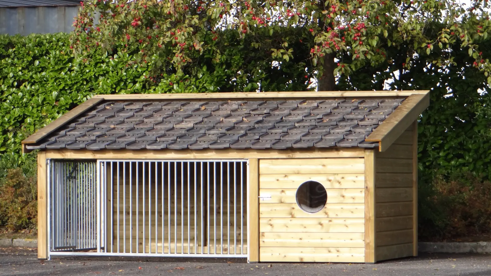Hundezwinger Rex 2 ist herstellt aus imprägniertes Fichtenholz und ist ausgestattet mit gebrauchte Dachziegeln. Der Zwinger hat ein groß Schlafraum mit ein Boden aus Sperrholz. Der Hundehütte ist ausgestattet mit 2 galvanisierte Gitterpaneele. Der Zwinger hat ein isoliert Schlafraum, dadurch kann Ihre Hund während das ganze Jahr draußen bleiben.