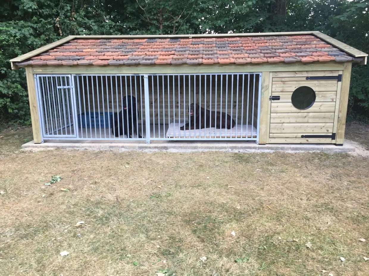 - Diese Version 2 ist versehen mit 2 Zwingerpaneele: 1 an der Vorseite (mit Tür) und 1 an der Seite.