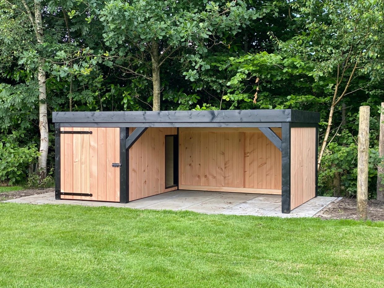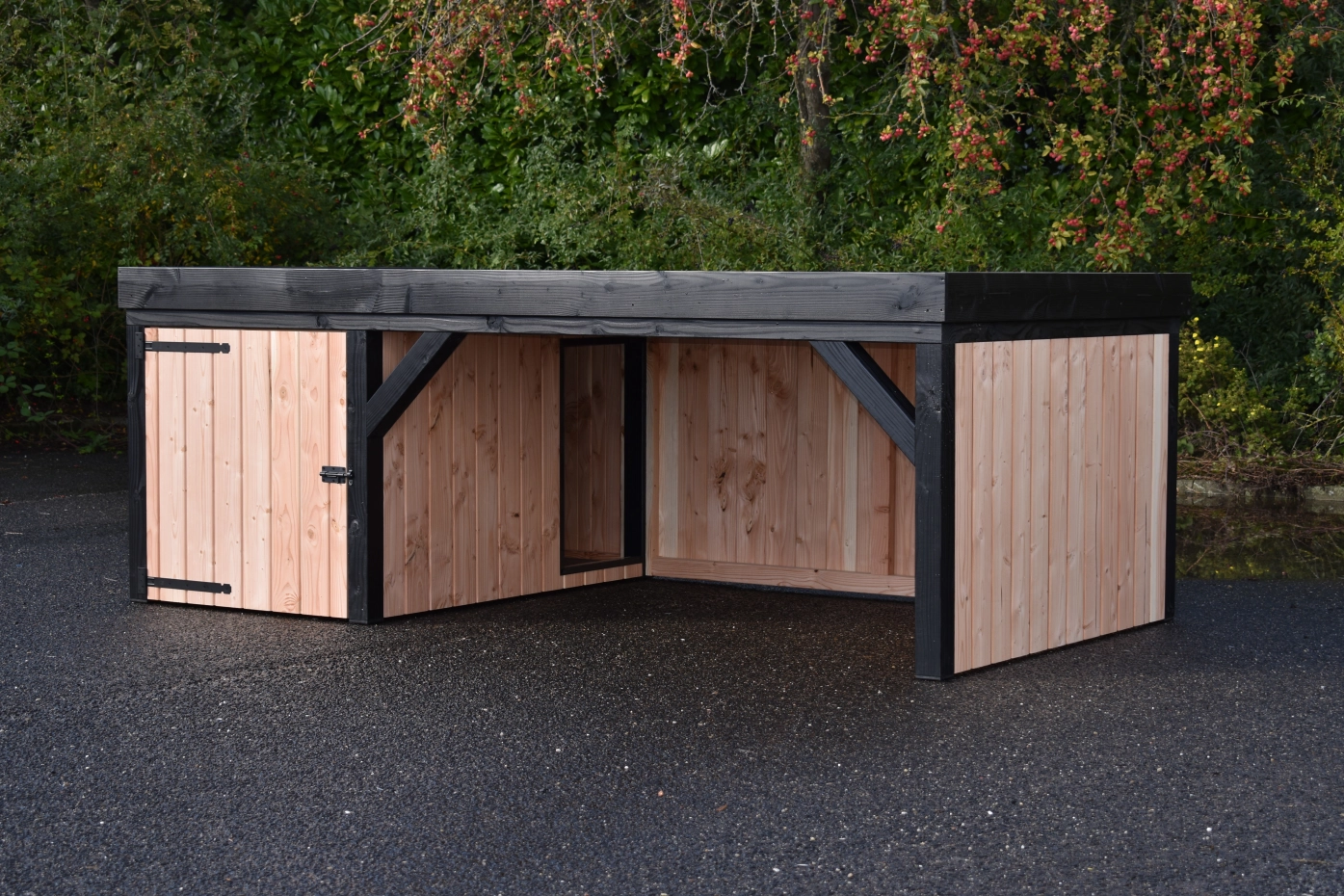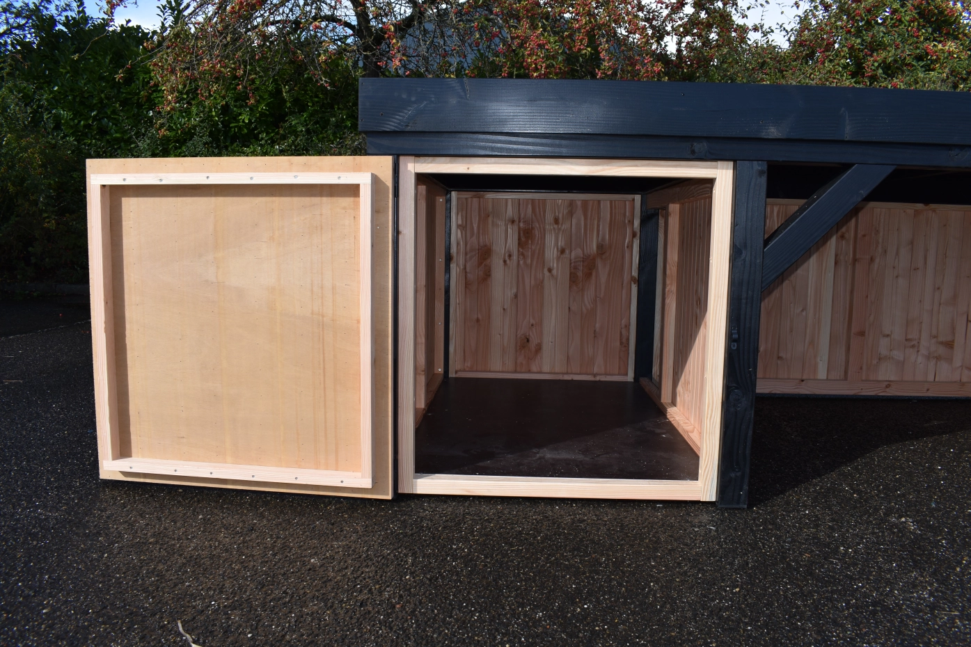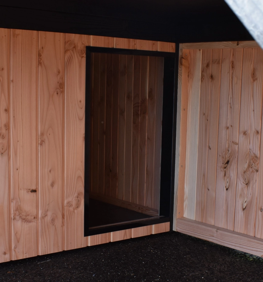 Schutzhütte Frenkie mit Überdachung ist mit stehenden Profilbrettern und schwarz lackierten Pfosten ausgestattet. Ein wunderschönes Design-Hundehütte mit Veranda. Die Hütte verfügt über eine geräumige Schlafkabine (90x150cm) mit einem herausnehmbaren Boden. Dank des Betonplex-Dachs haben Sie ein flaches, glatt verarbeitetes Dach.