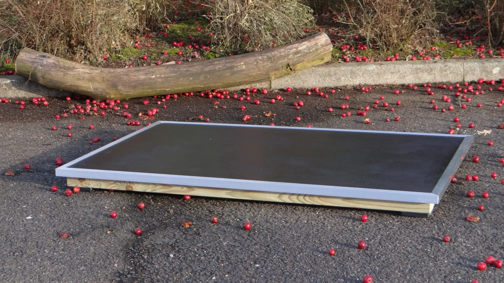 Die Solide Large Terrasse hat eine Größe von 125x83cm. Es ist eine wunderschöne und extrem robuste Terrasse, die häufig genutzt wird. Unsere eigenen Tischler fertigen die Terrassen mit höchster Präzision an. Der Boden besteht aus 15mm dickem Betonmultiplex mit Anti-Rutsch-Beschichtung. Rundherum ist die Terrasse mit einer Anti-Beiß-Kante aus Aluminium versehen. An der Unterseite befinden sich 15mm Kunststoffblöcke. Die Gesamthöhe der Terrasse beträgt 8cm.