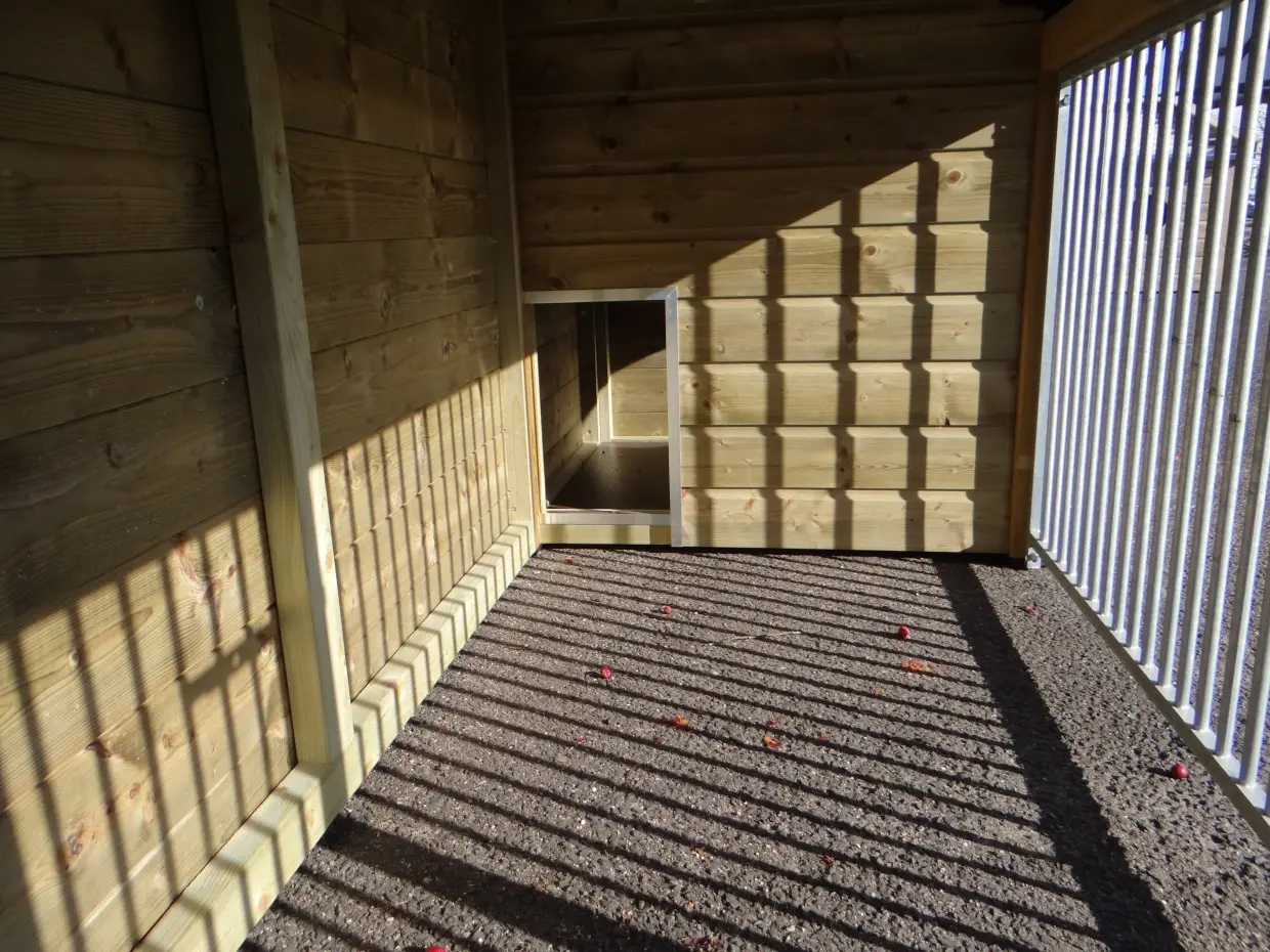 - Wenn draußen eine hohe Luftfeuchtigkeit herrscht, ist es auch im Inneren eines Stalls feucht. Die Innenseite von der Käfig können Sie lasieren um Schimmelbildung zu verhindern.