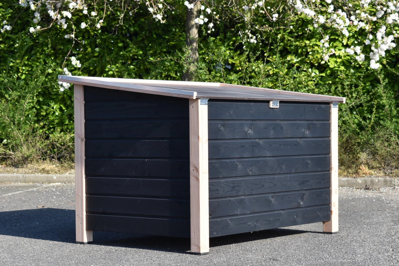 - Die Hundehütte hat schwarze Kunststofffüße, die das Bewegen erleichtern und die Hütte vor Feuchtigkeit schützen