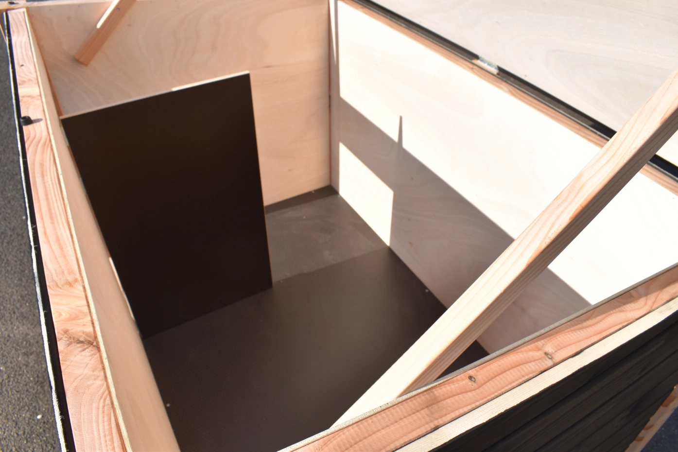 - Das Innere ist mit hartem Sperrholz ausgekleidet.