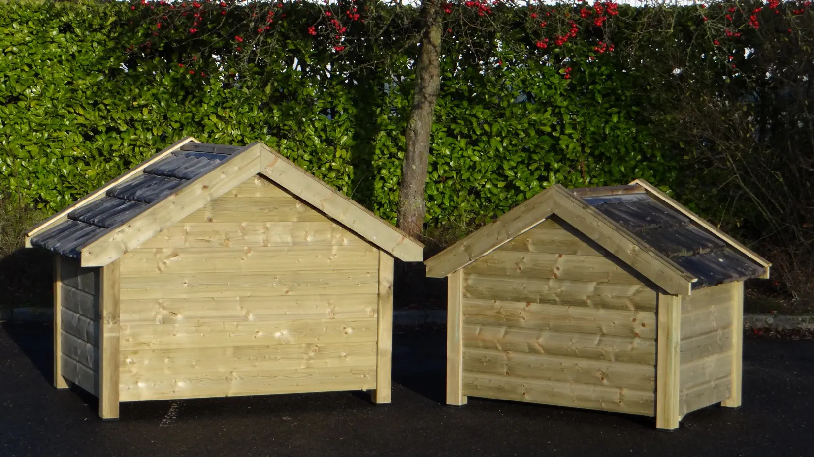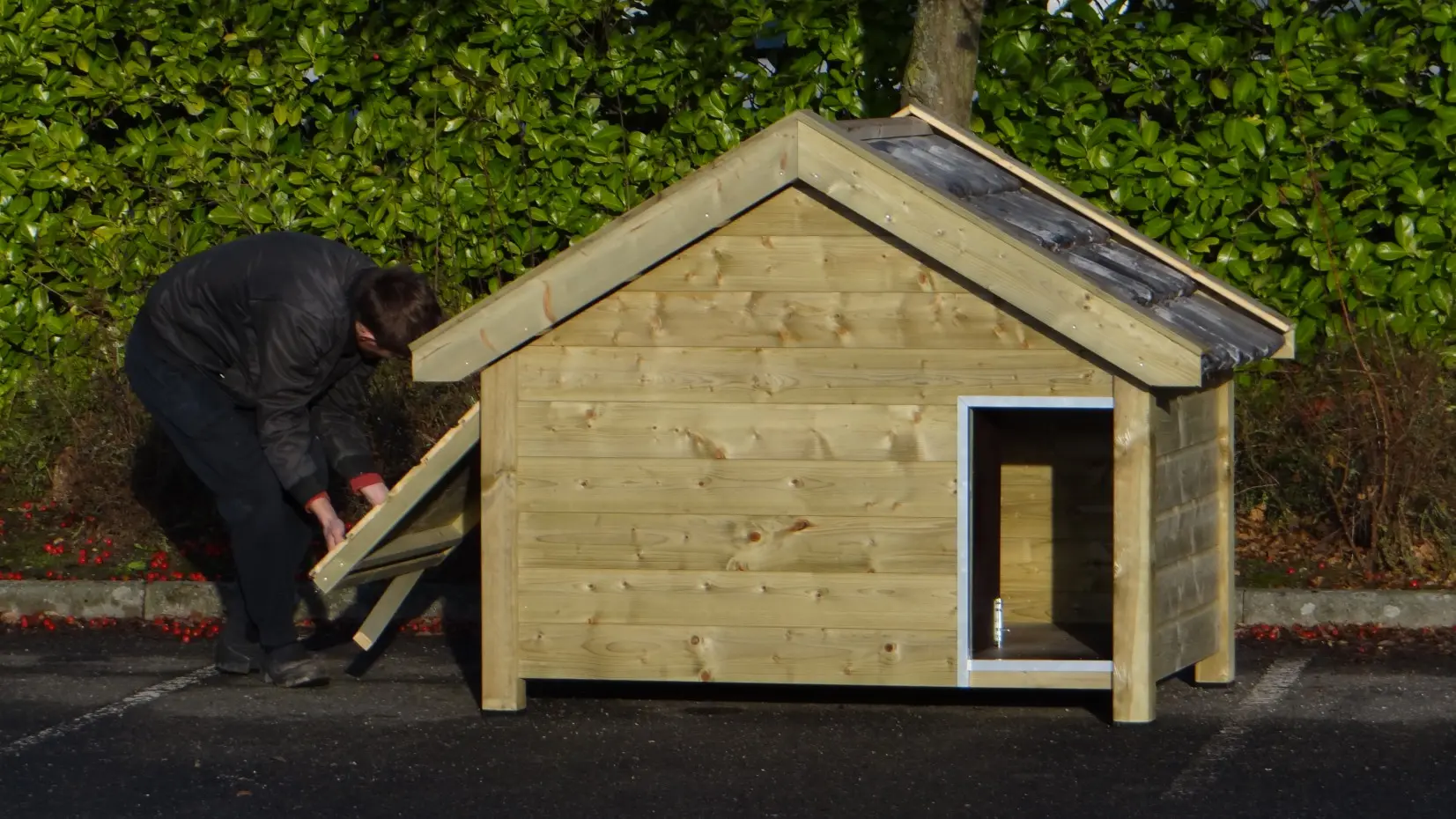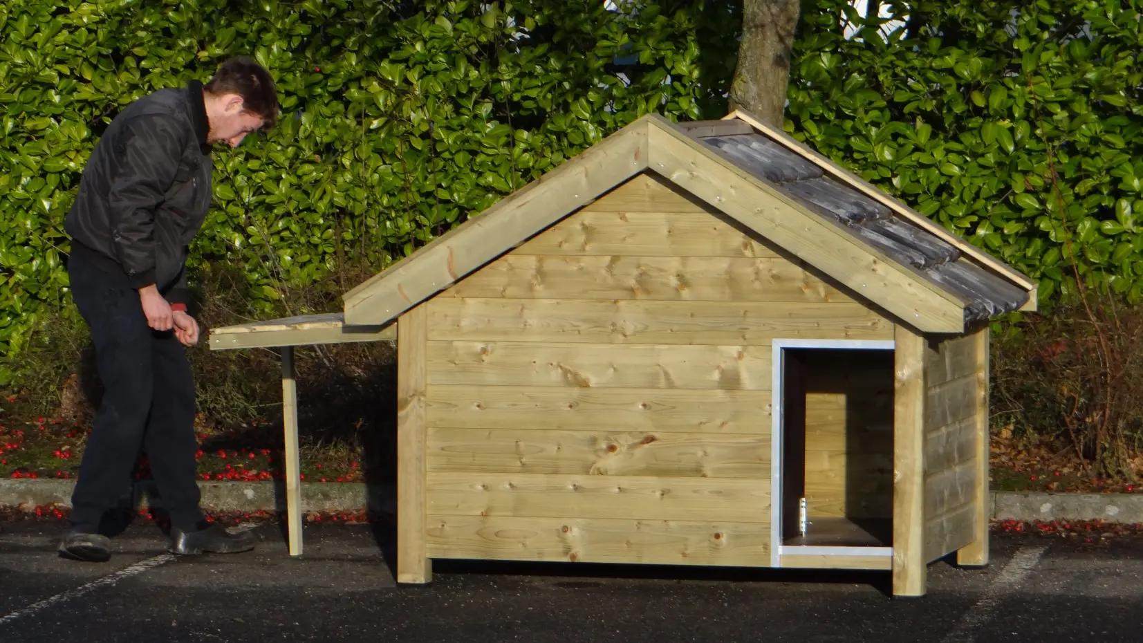 Das isolierte Hundehaus Snuf ist ein großes Hundehaus. Es besteht aus imprägniertem Fichtenholz in Kombination mit Betonplex und echten Dachziegeln. Sehr praktisch und komfortabel! Die isolierten Wände sind ganze 7 cm dick. Außenmaße ca.: 193 × 134 × 143 cm (B × T × H). Isoliertes Hundehaus aus Holz in Top-Qualität!