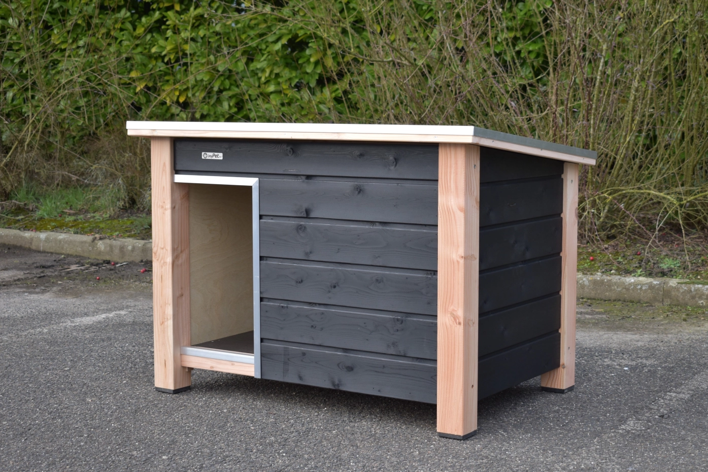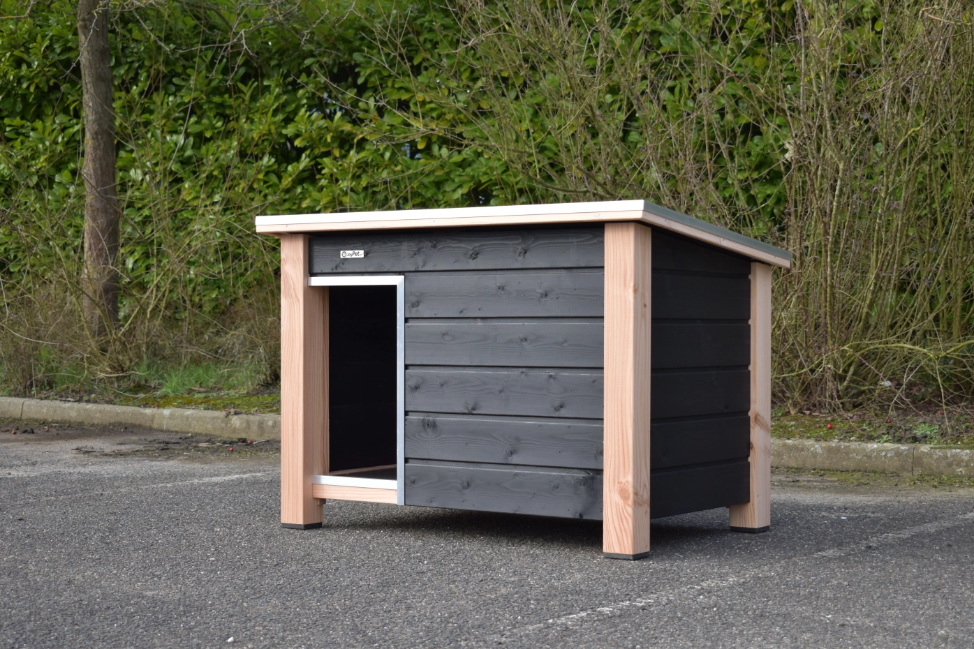 - Die Hundehütte hat schwarze Kunststofffüße, die das Bewegen erleichtern und die Hütte vor Feuchtigkeit schützen