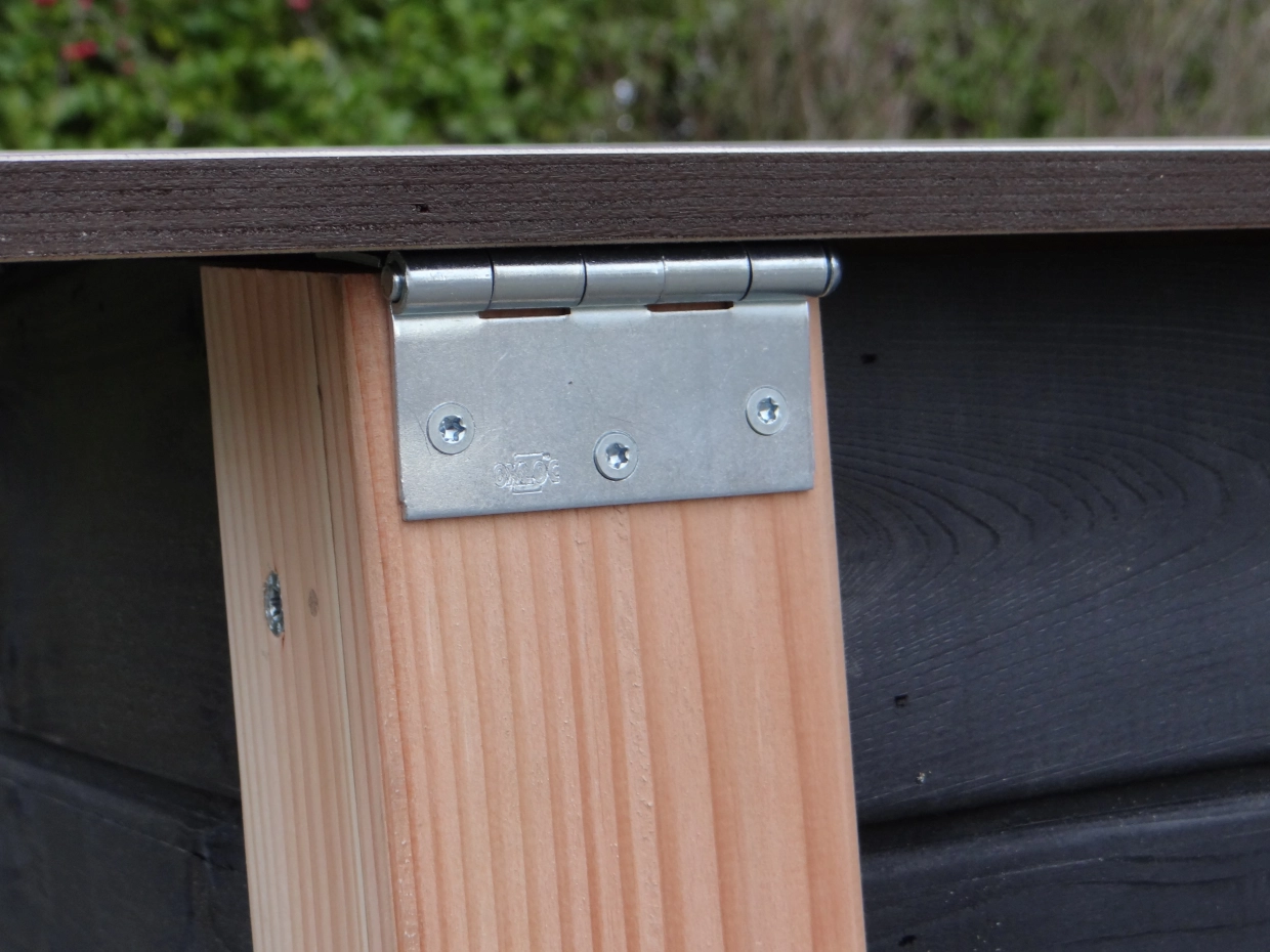 - Ungeschützte Holzkanten können mit Aluminiumstreifen versehen werden, um das Nagen zu verhindern. Sie können dies per E-Mail anfordern. Der Preis beträgt € 9,00 pro Meter (inkl. Montage).