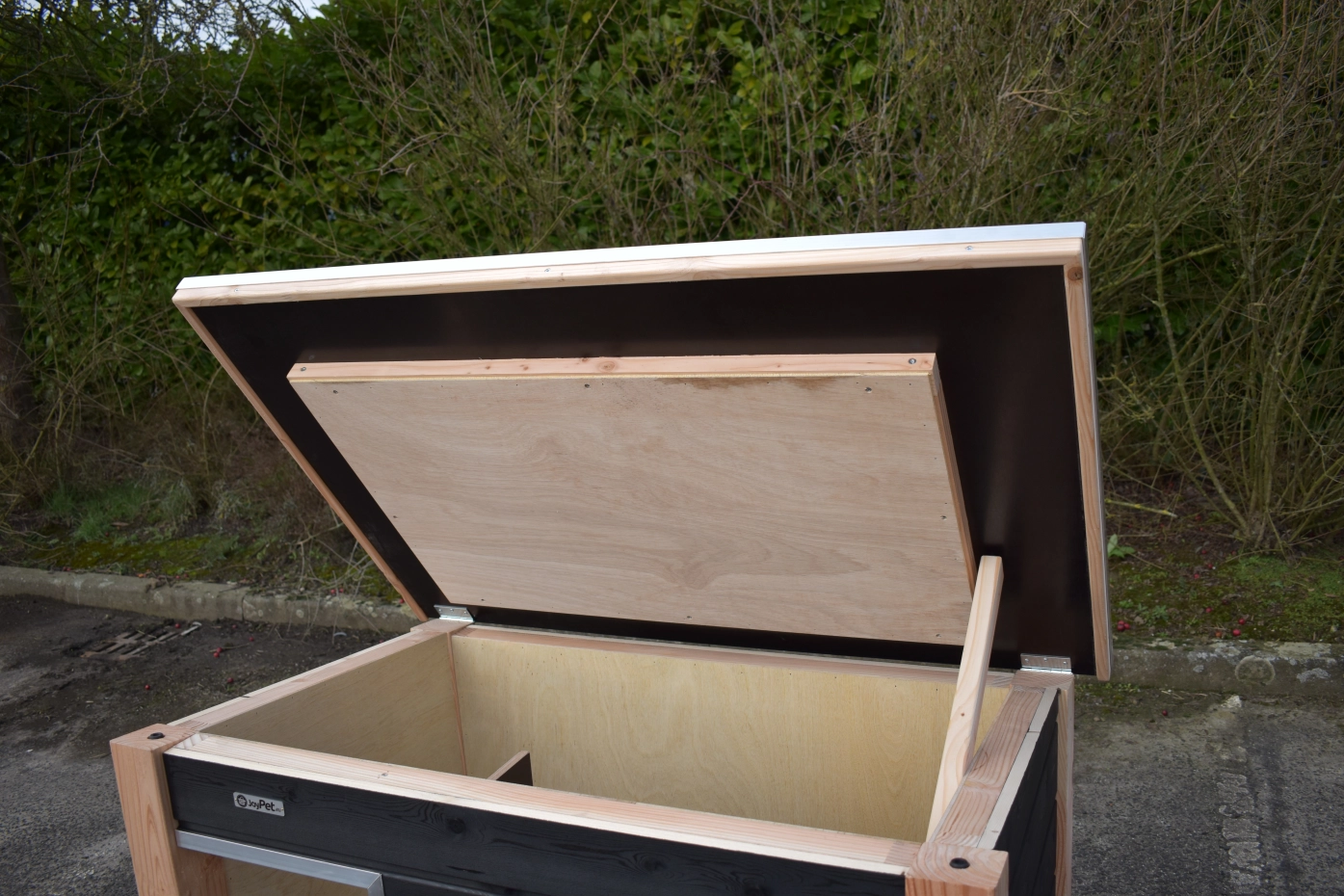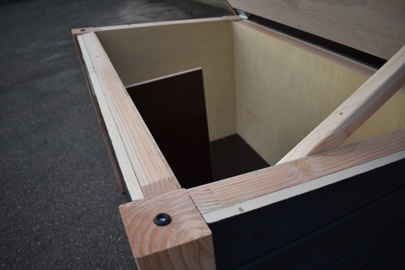 - Das Innere ist mit hartem Sperrholz ausgekleidet.