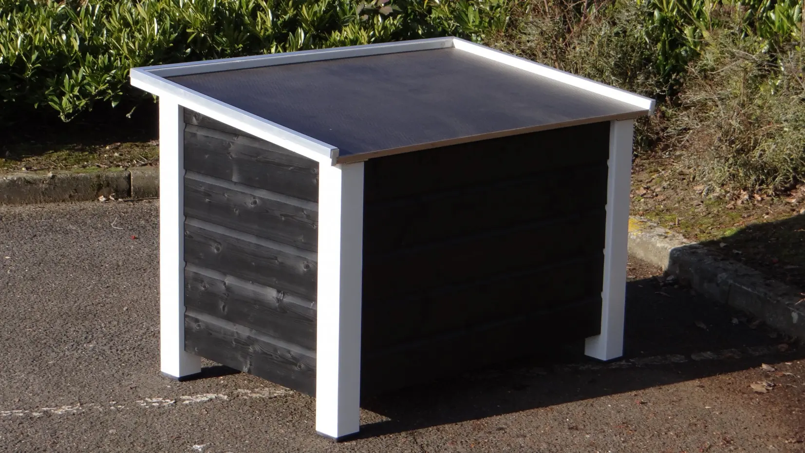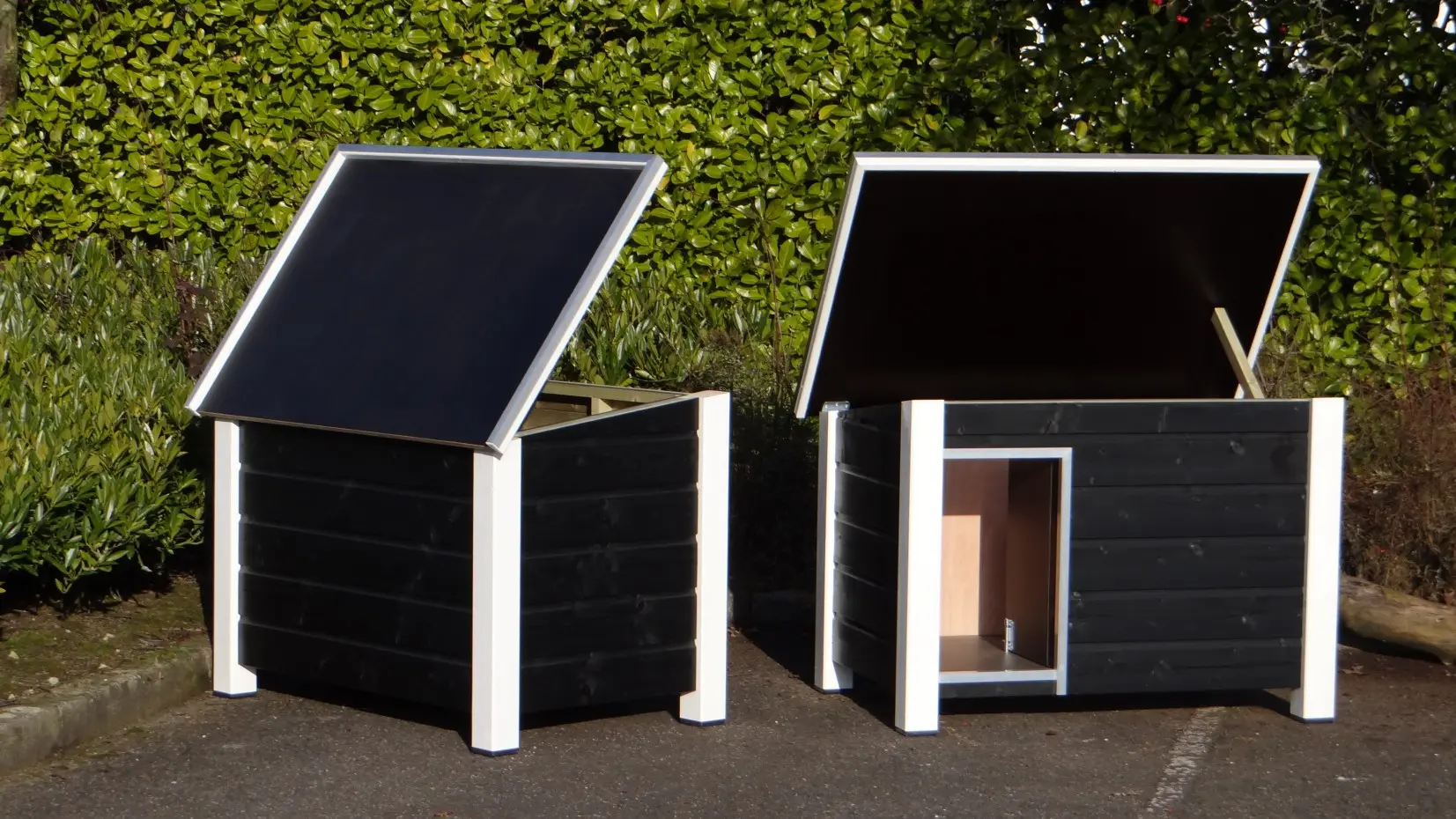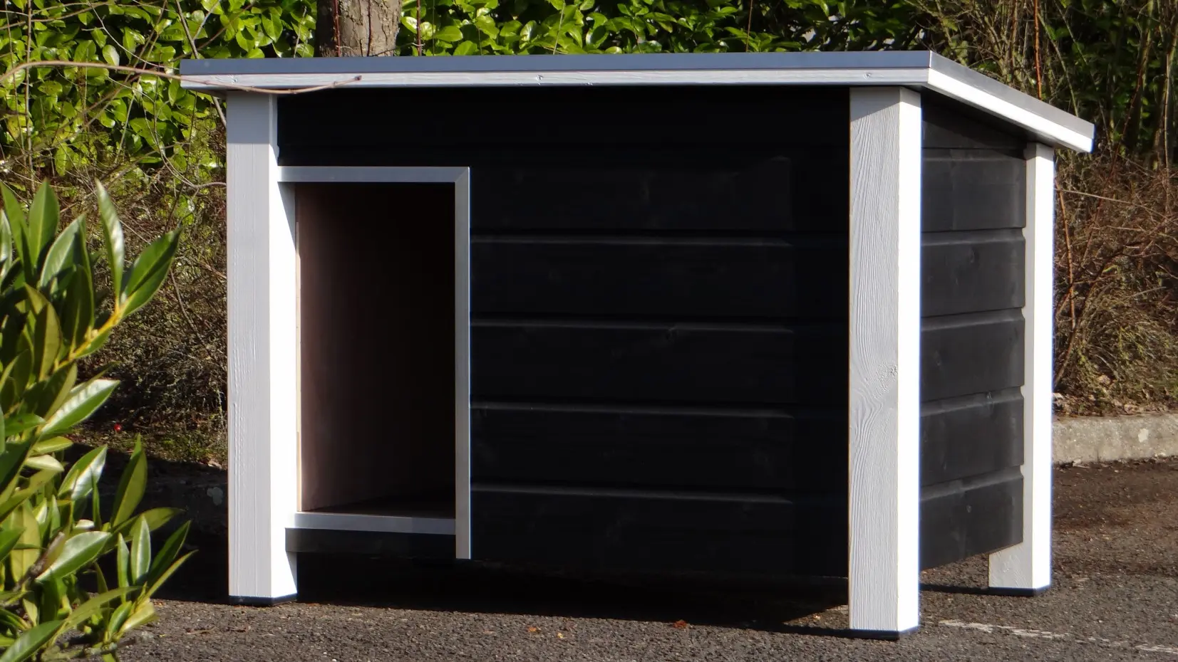 - Die Hundehütte hat schwarze Kunststofffüße, die das Bewegen erleichtern und die Hütte vor Feuchtigkeit schützen