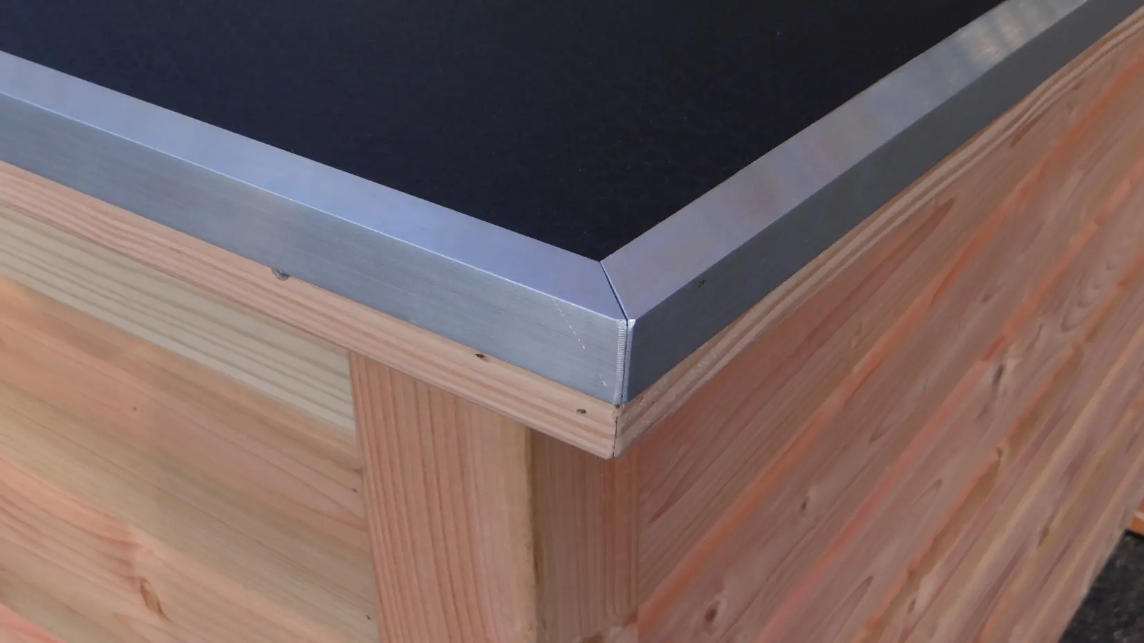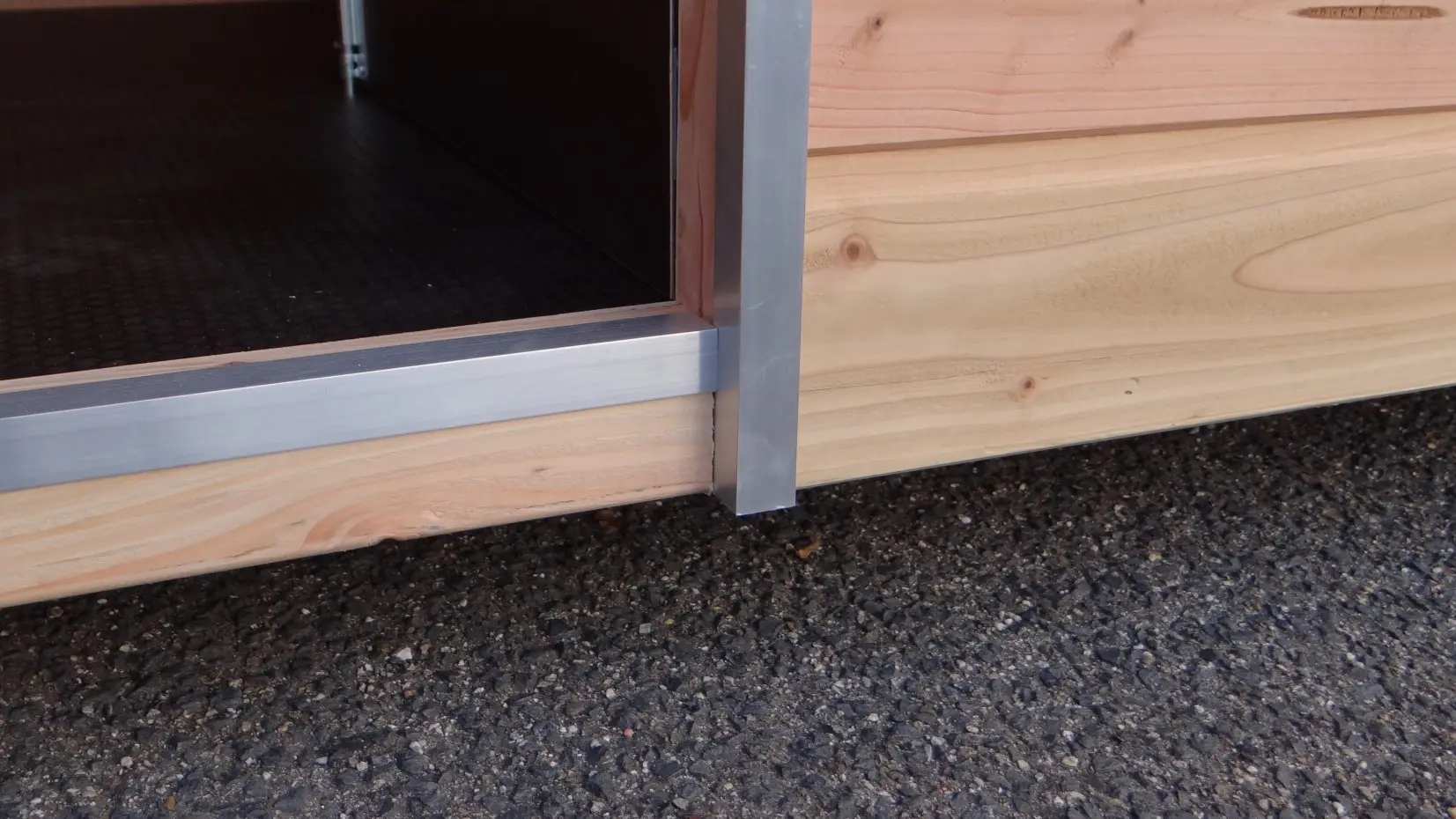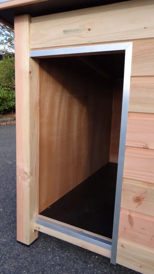 - Ungeschützte Holzkanten können mit Aluminiumstreifen versehen werden, um das Nagen zu verhindern. Sie können dies per E-Mail anfordern. Der Preis beträgt € 9,00 pro Meter (inkl. Montage).