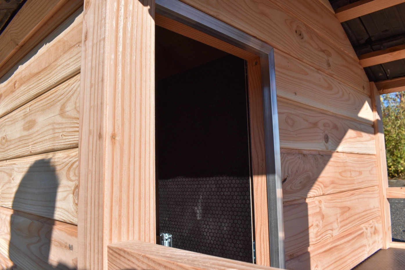 - Die Hütte ist mit einer Seitenklappe ausgestattet.