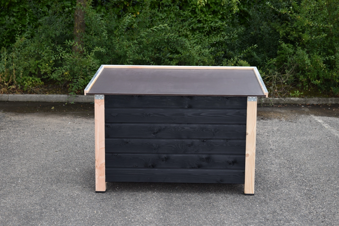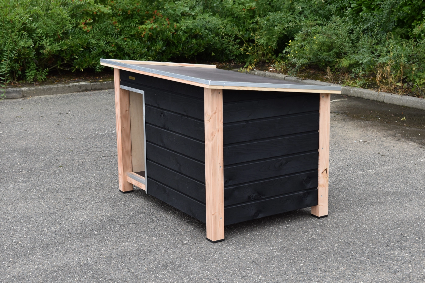 - Die Hundehütte hat schwarze Kunststofffüße, die das Bewegen erleichtern und die Hütte vor Feuchtigkeit schützen