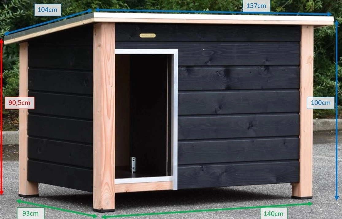 Isolierte Hundehütte Wolf Schwarz/Douglasien ist ein schöne Platz für Ihre Hund. Weil es ein isolierte Hütte ist, kann Ihre Hund im Sommer und Winter draußen bleiben. Diese Hütte wird durch unsere Zimmerleute hergestellt in Holland. Es ist ein Hütte von Top-qualität. Es benötigt kein weitere Behandlung. Diese Hundehütte ist geeignet für zB. der Deutsche Schäferhund, Rottweiler und Belgian Malinois.