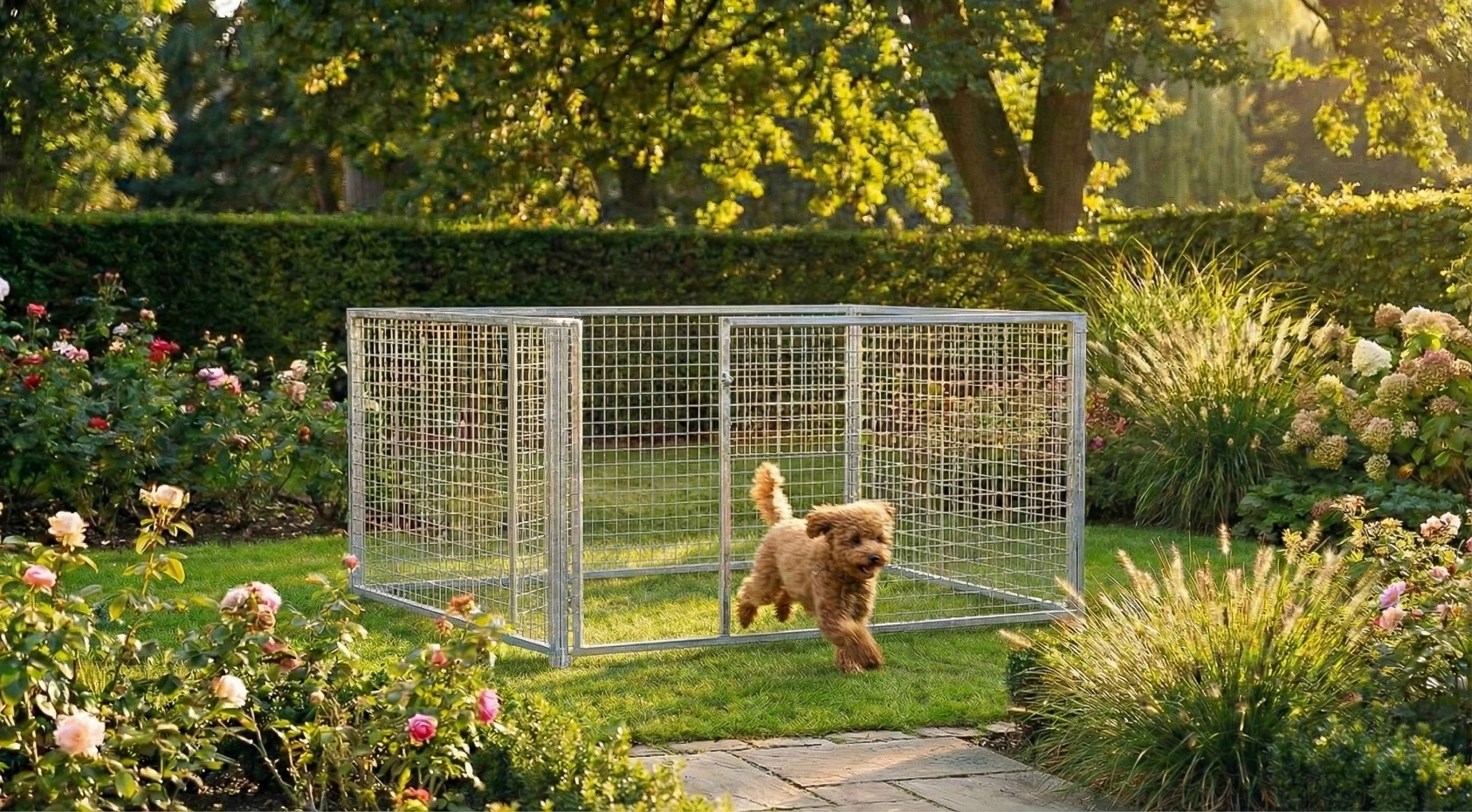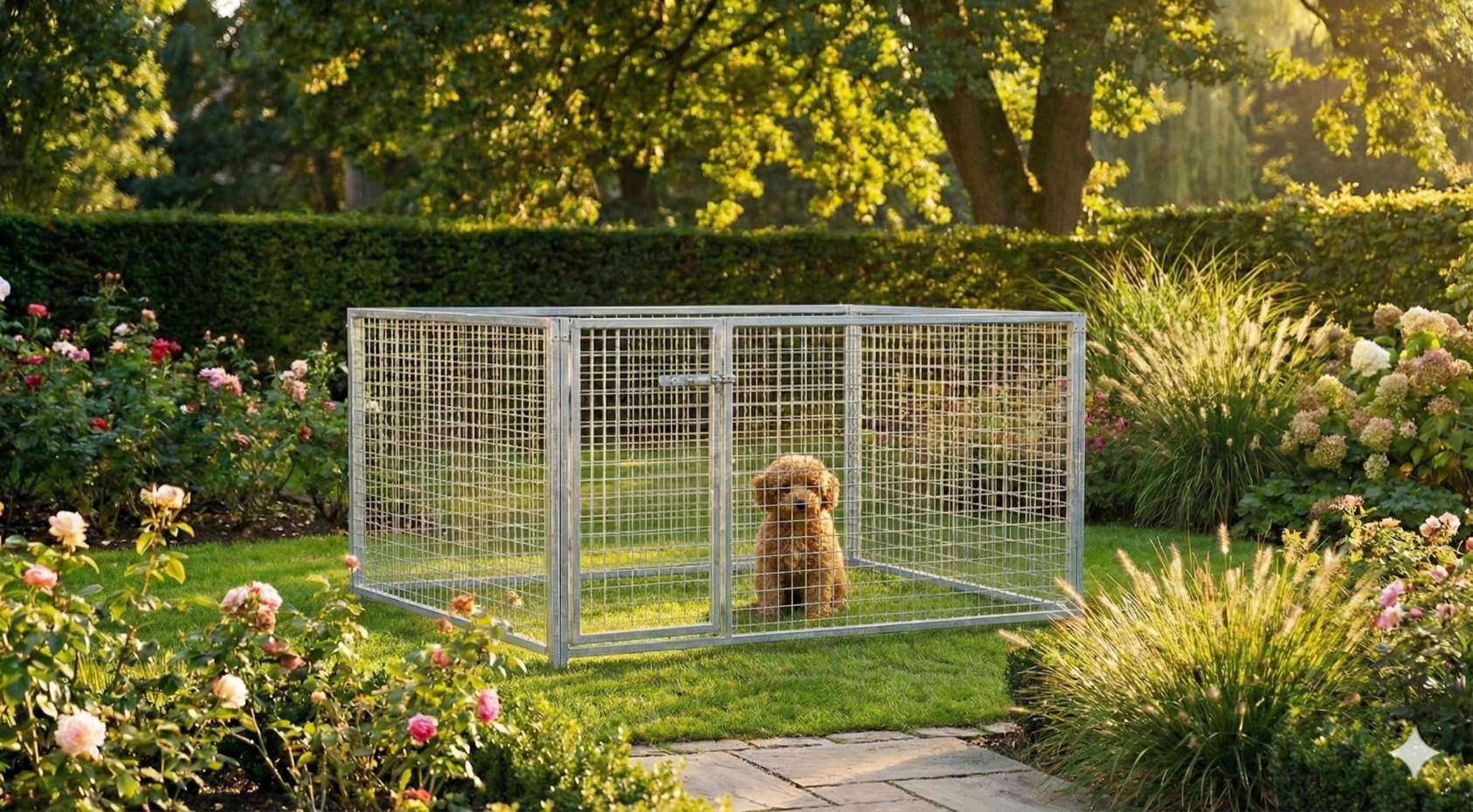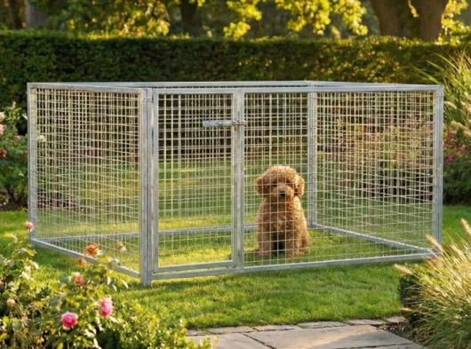 Diese galvanisierte Welpenauslauf von 2x1,5m ist ein schöne Platz für Ihre Welp! Der Auslauf besteht aus 2 Paneele von 1,5m und 2 Paneele von 2m.