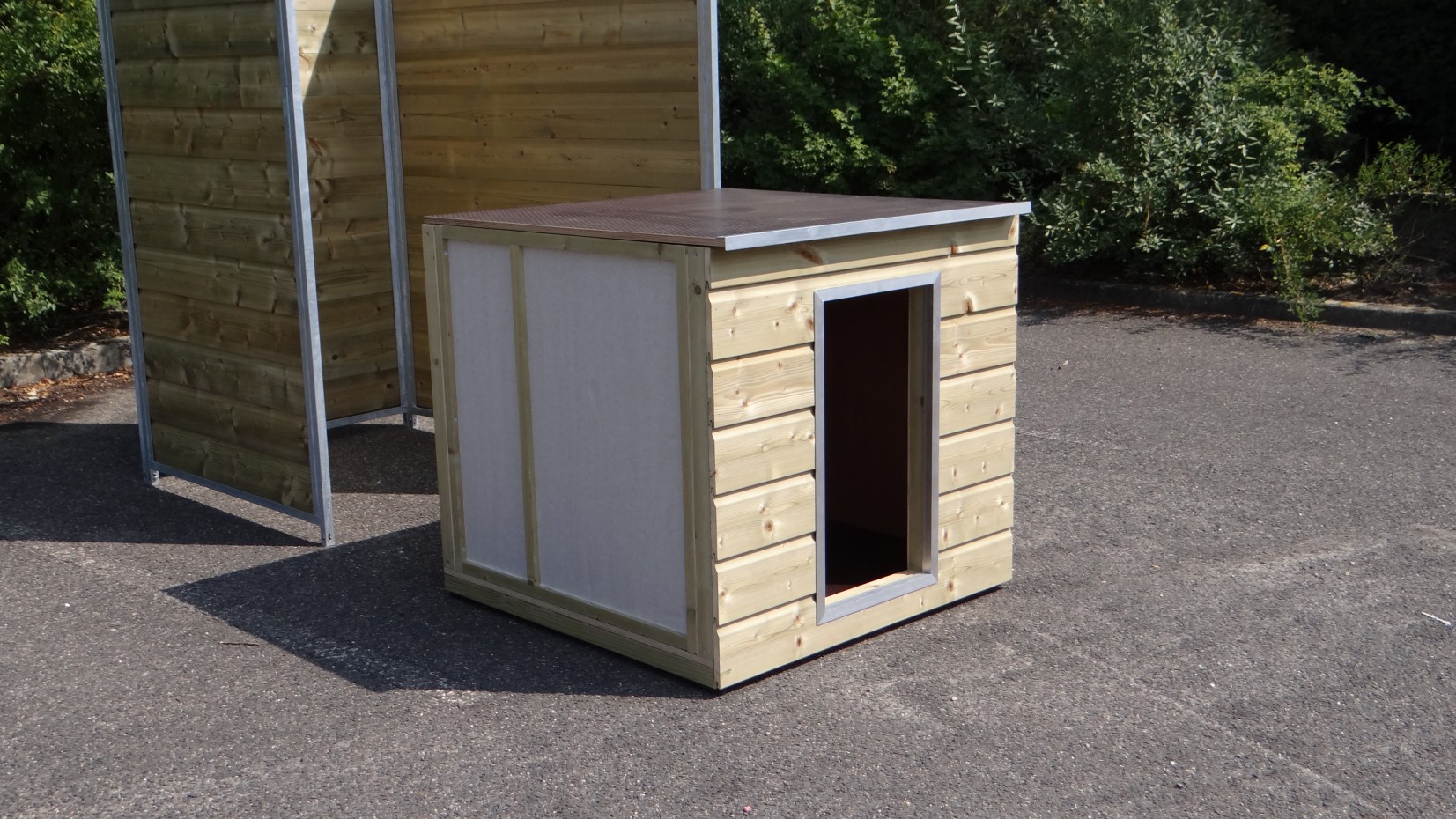 Schlafraum Easy isoliert 95x95cm ist ein Maßgefertigte Hütte um in ein Zwinger zu platzieren. Der Schlafraum hat ein Dach und Boden aus Sperrholz. Die Wanne sind isoliert mit 3cm dicke PIR-Isolation. Der Öffnung ist ausgestattet mit Aluminum Nageschutzstreifen. Der Stall hat ein praktisch Klappdach.