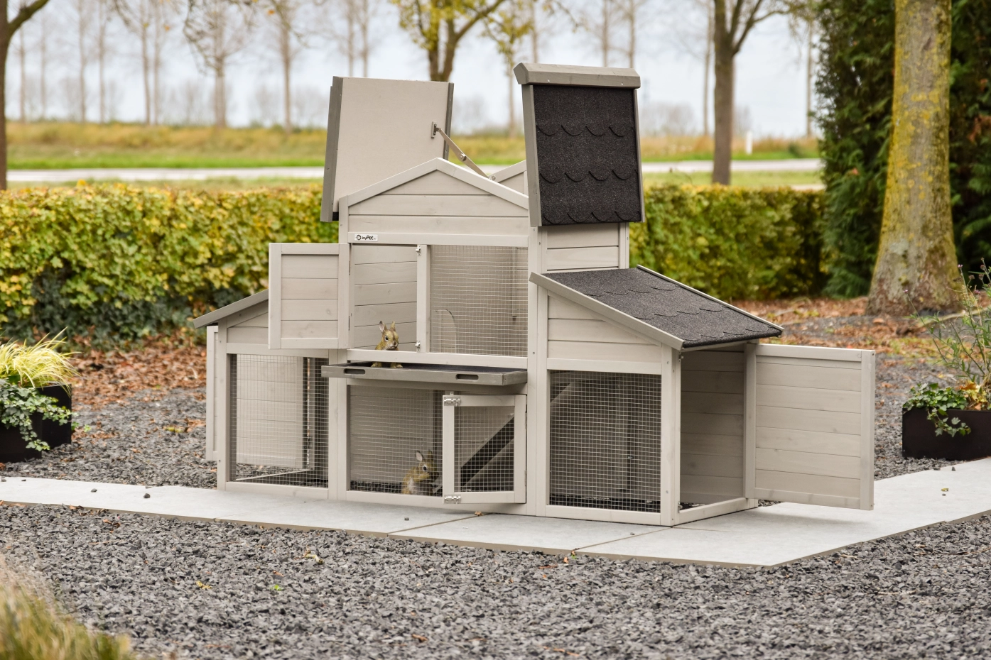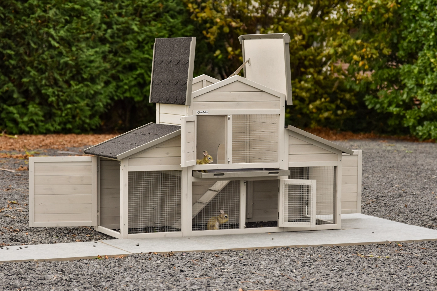 - Das Dach dieses Kaninchenstalls ist mit Dachpappe versehen.