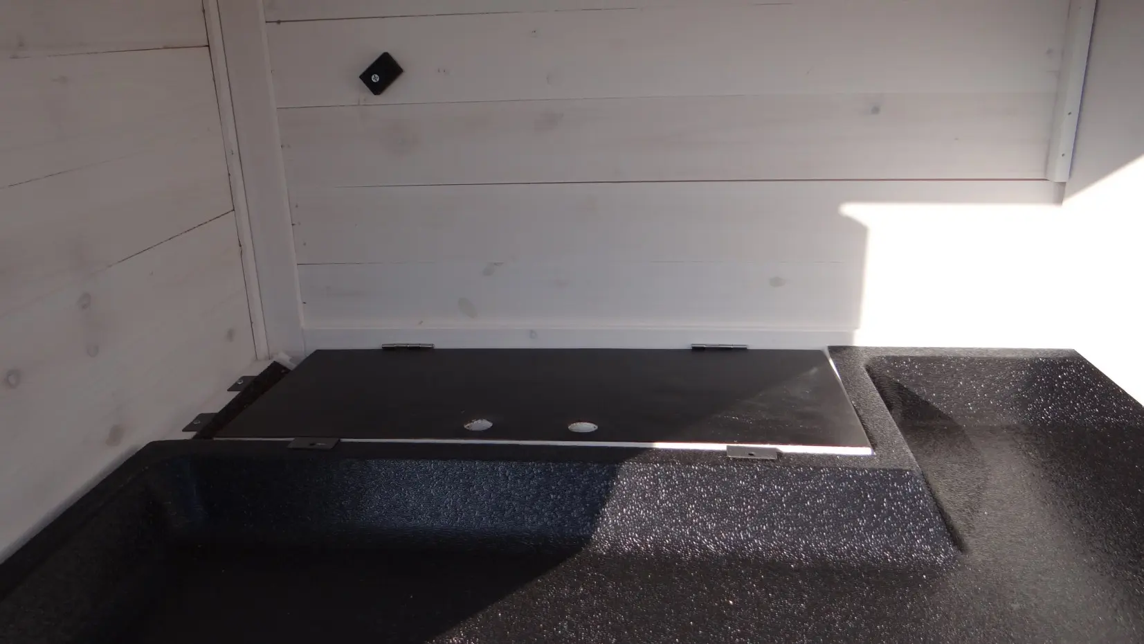 - Die Rückwand dieses Stalles ist aus massivem Vollholz.