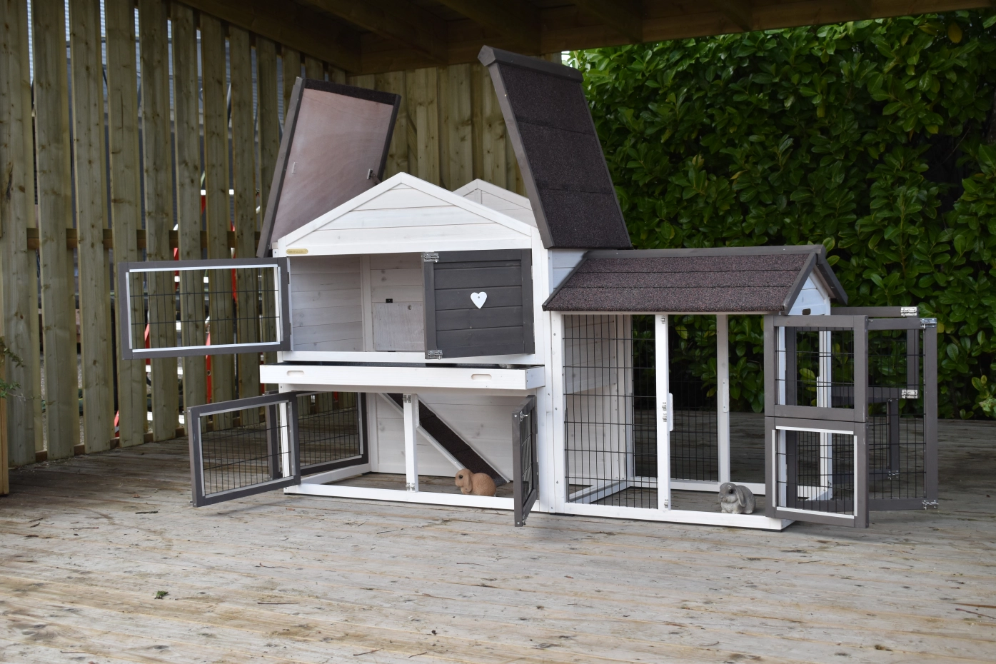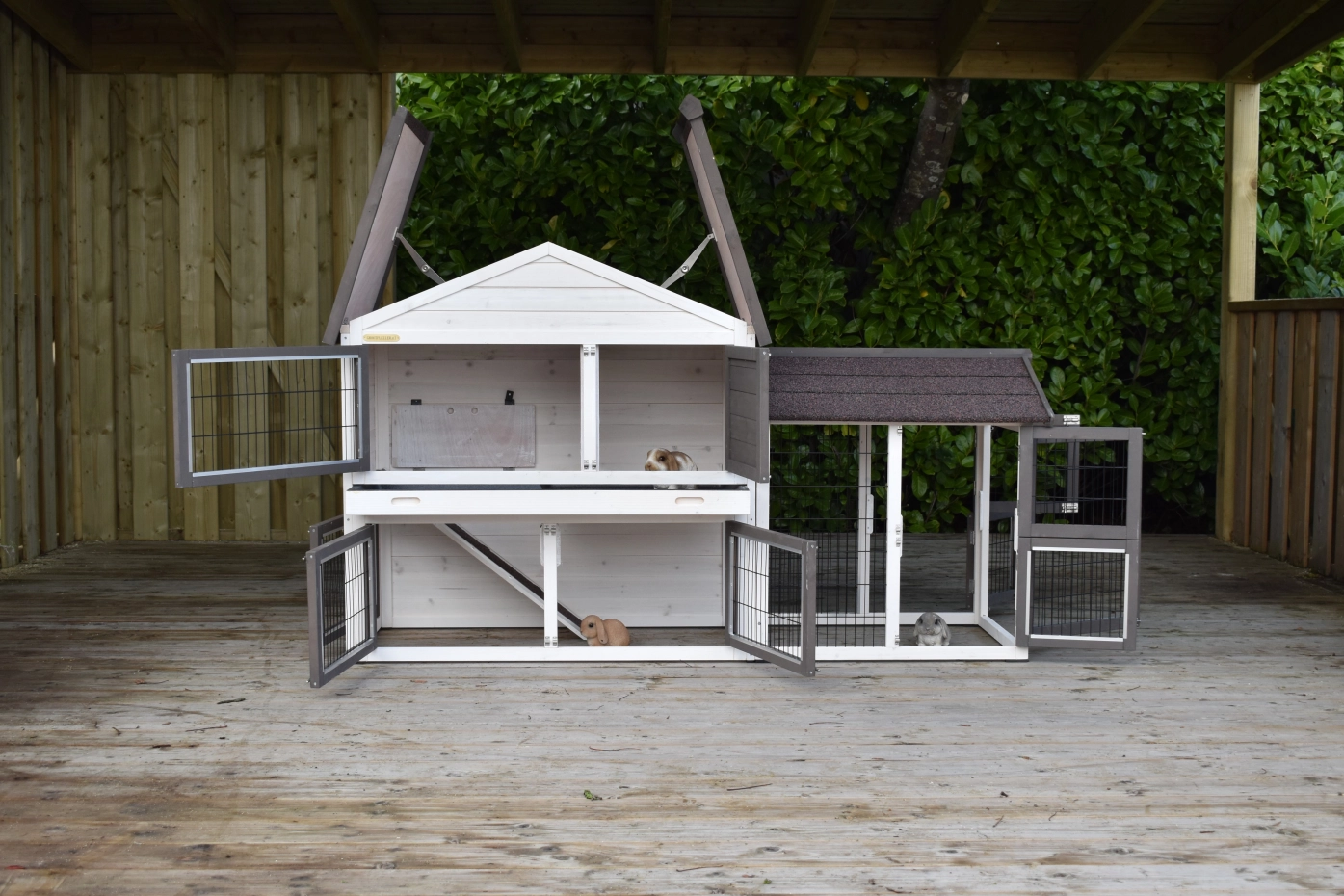 - Die Türen dieses Kaninchenstalls sind mit doppelten Schieberiegeln ausgestattet