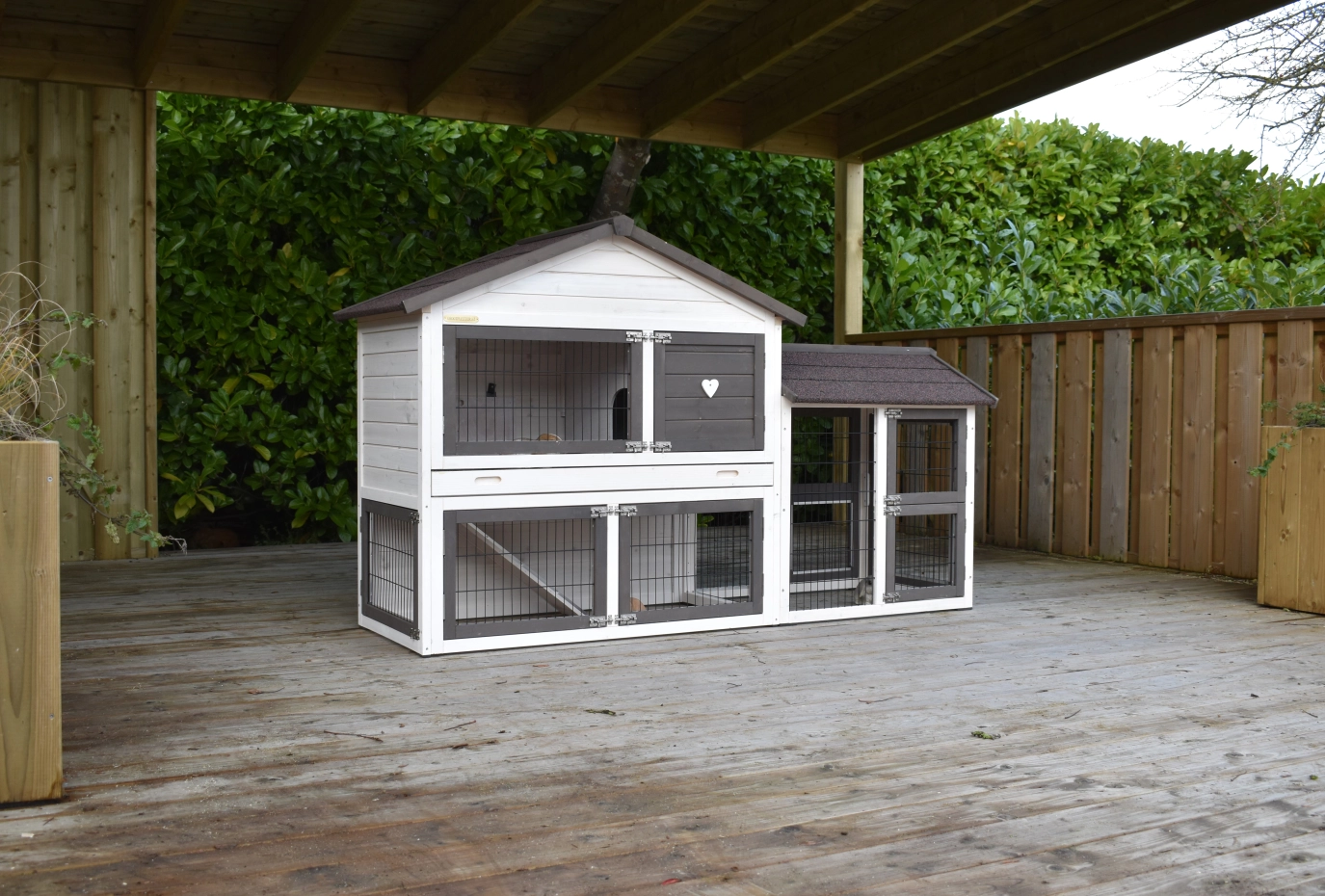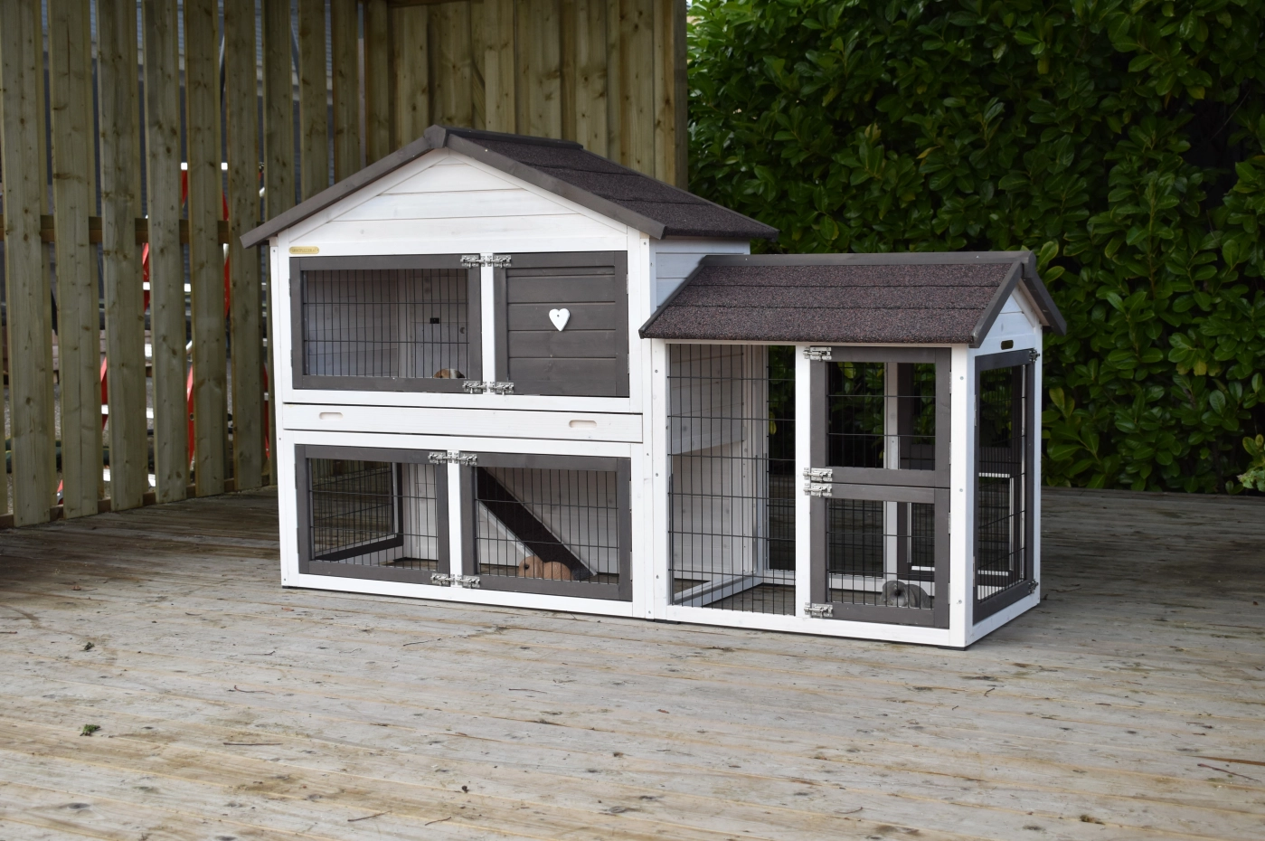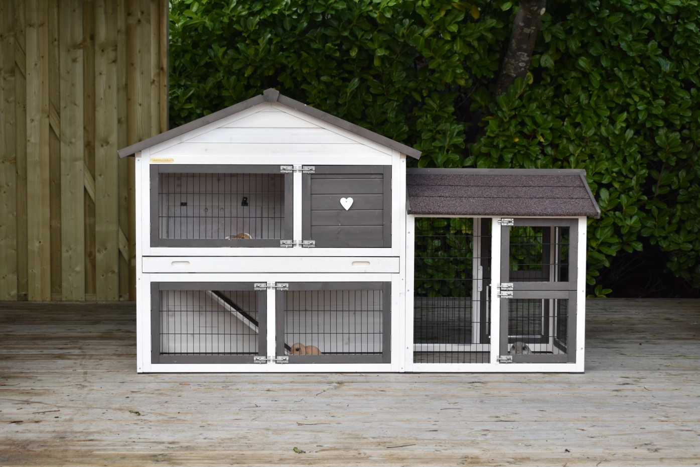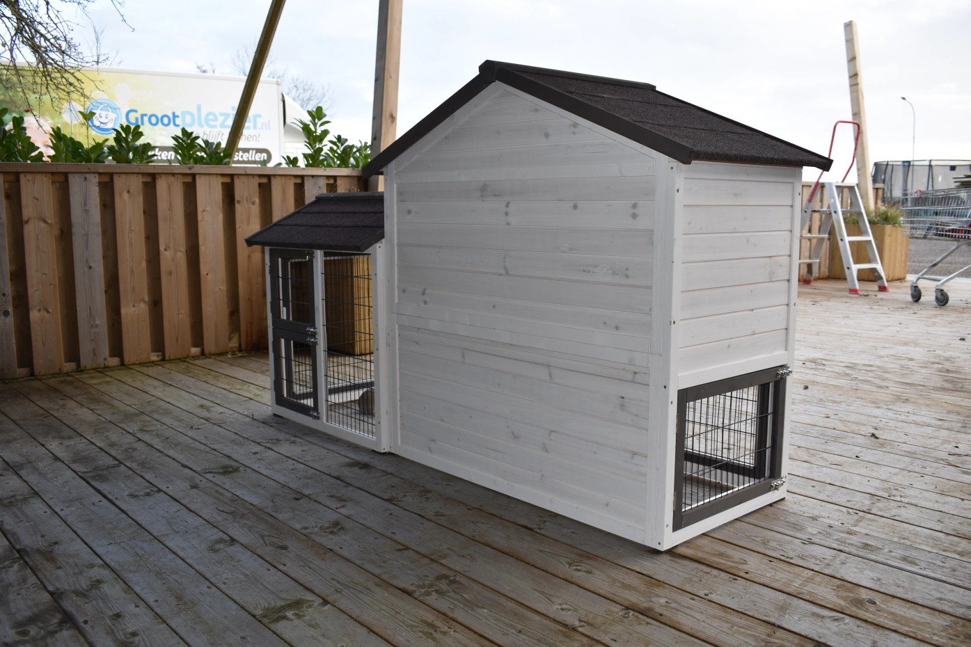 Der Kaninchenstall Regular Medium mit einem rechtsseitigen Anbauauslauf, ausgestattet mit Nageschutzstreifen, ist einzigartig und sehr praktisch. In diesem Kaninchenstall Regular Medium können die Kaninchen von oben nach unten, und der Zwischenboden ist abschließbar. Der Stall Regular Medium verfügt auch über eine Schublade, die die Reinigung erleichtert. Mit einem praktischen Dachboden zur Aufbewahrung von Zubehör ist dieser Kaninchenstall Regular Medium eine wertvolle Ergänzung für Ihren Garten!