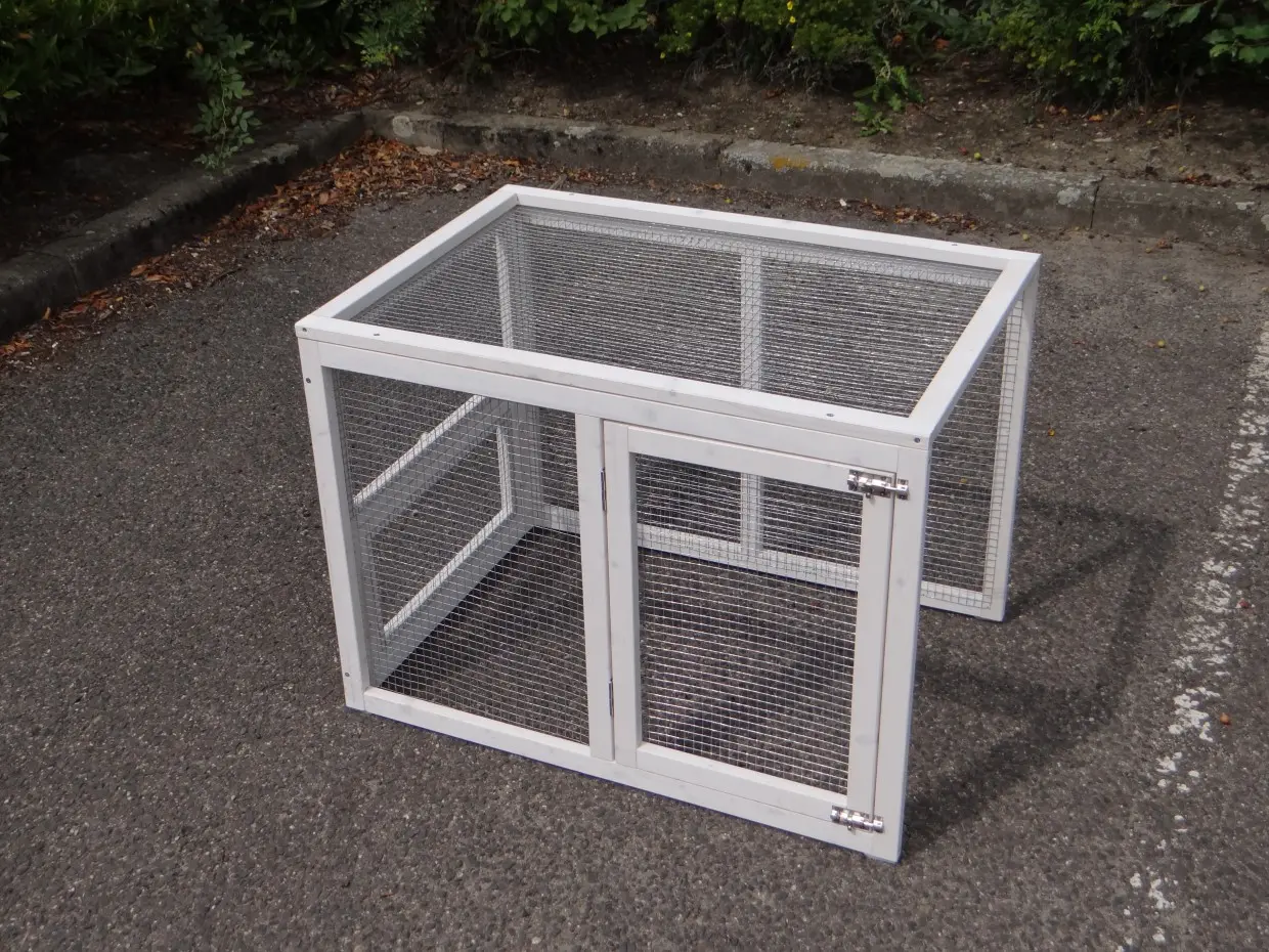 - Der Auslauf hat ein Dach aus Gitter (ca. 12x12mm)