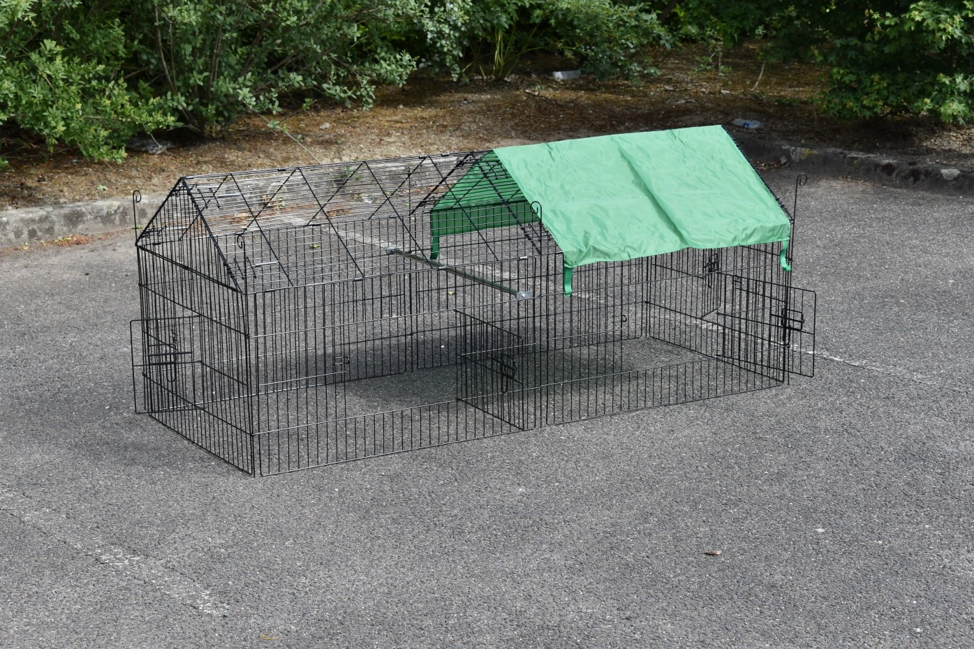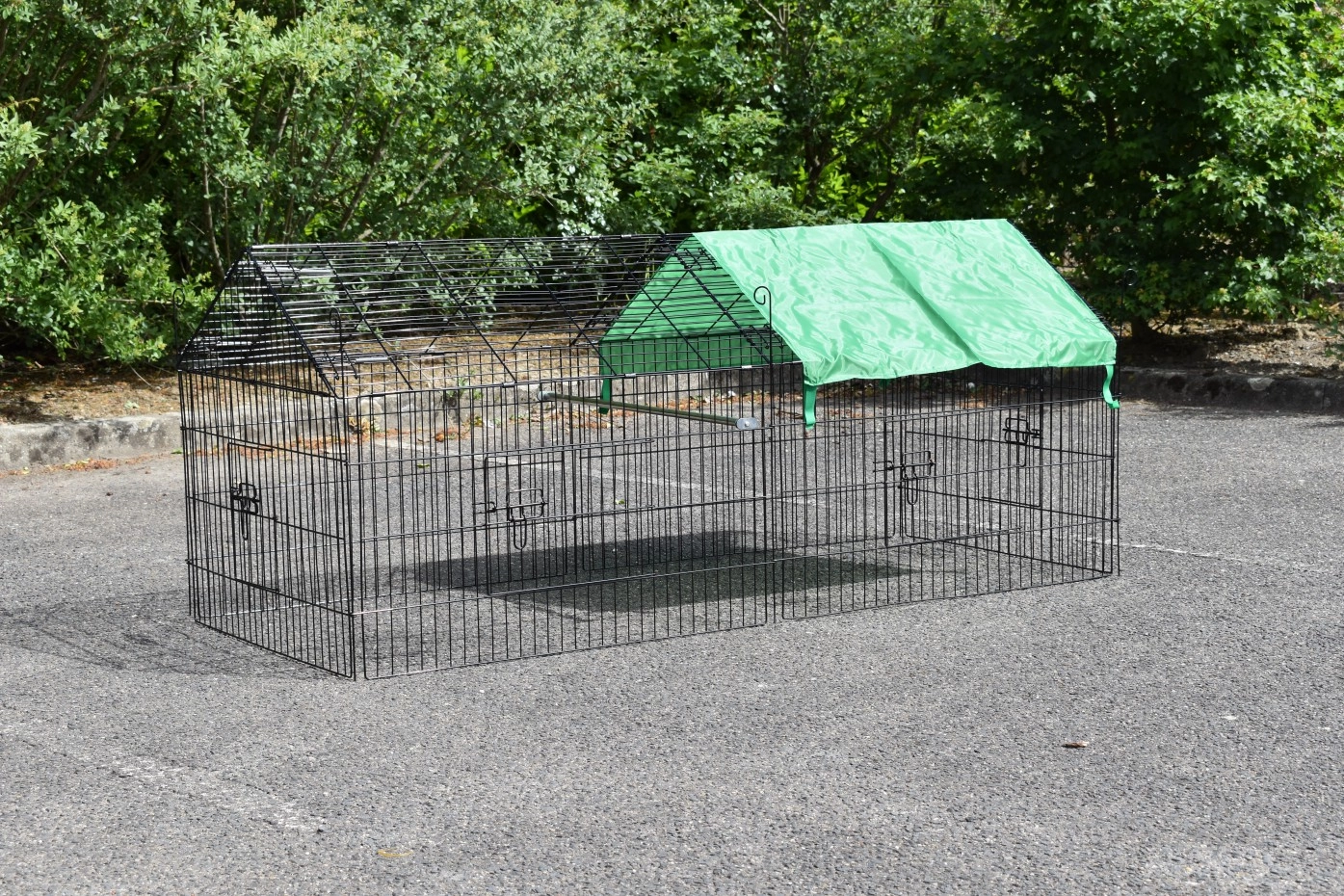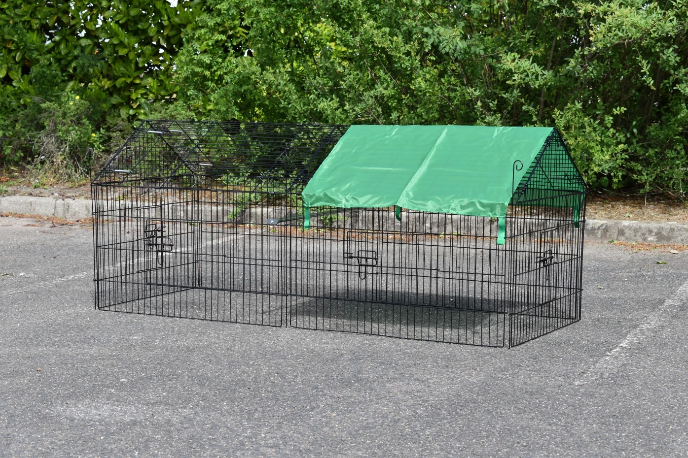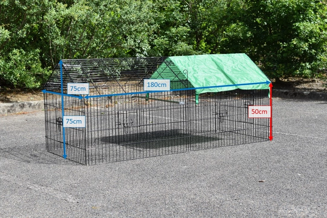 Der Freilaufgehege für Kleintiere mit Sonnenschutz ist ein Auslauf, aus schwarz pulverbeschichtetem Stahl. Der Freilaufgehege mit Sonnenschutz kann verwendet werden für Kaninchen, Hühner, Katzen und Welpen. Der günstiger Auslauf mit Sonnenschutz ist ausgestattet mit 4 Türen. Der Freilaufgehege ist endlos erweiterbar, und einfach zu kombinieren mit ein Hühner- oder Kaninchenstall. Der Seite von dieser Freilaufgehege (der Steile Teil) ist etwa 50cm höhe.
