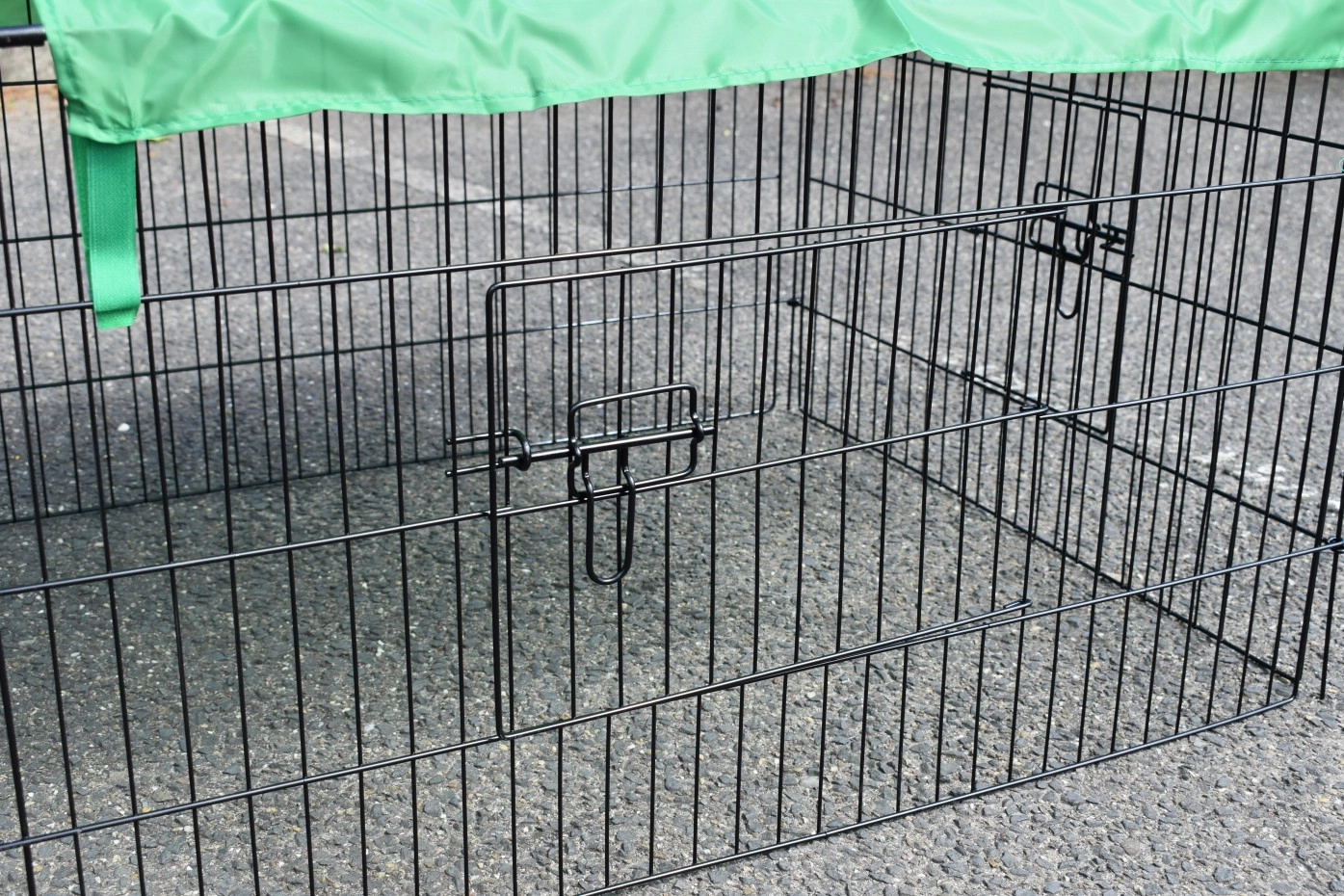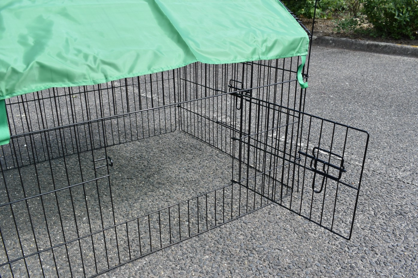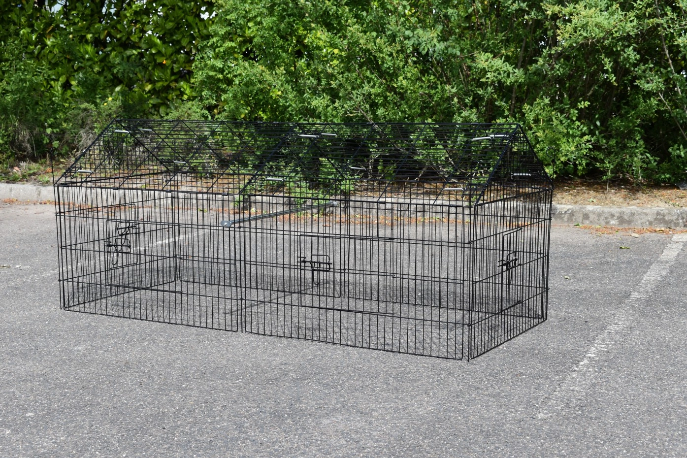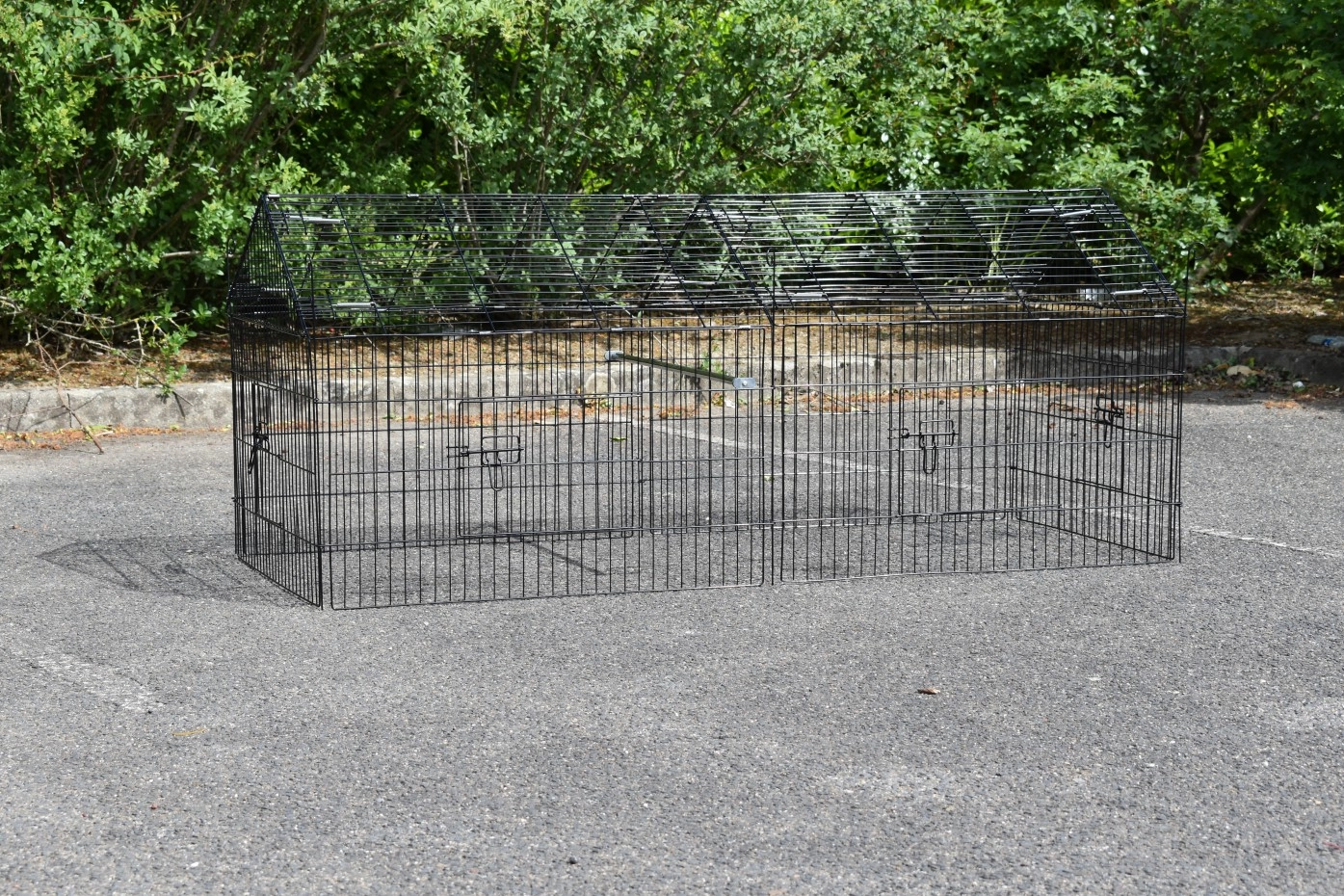 Der Freilaufgehege für Kleintiere mit Sonnenschutz ist ein Auslauf, aus schwarz pulverbeschichtetem Stahl. Der Freilaufgehege mit Sonnenschutz kann verwendet werden für Kaninchen, Hühner, Katzen und Welpen. Der günstiger Auslauf mit Sonnenschutz ist ausgestattet mit 4 Türen. Der Freilaufgehege ist endlos erweiterbar, und einfach zu kombinieren mit ein Hühner- oder Kaninchenstall. Der Seite von dieser Freilaufgehege (der Steile Teil) ist etwa 50cm höhe.