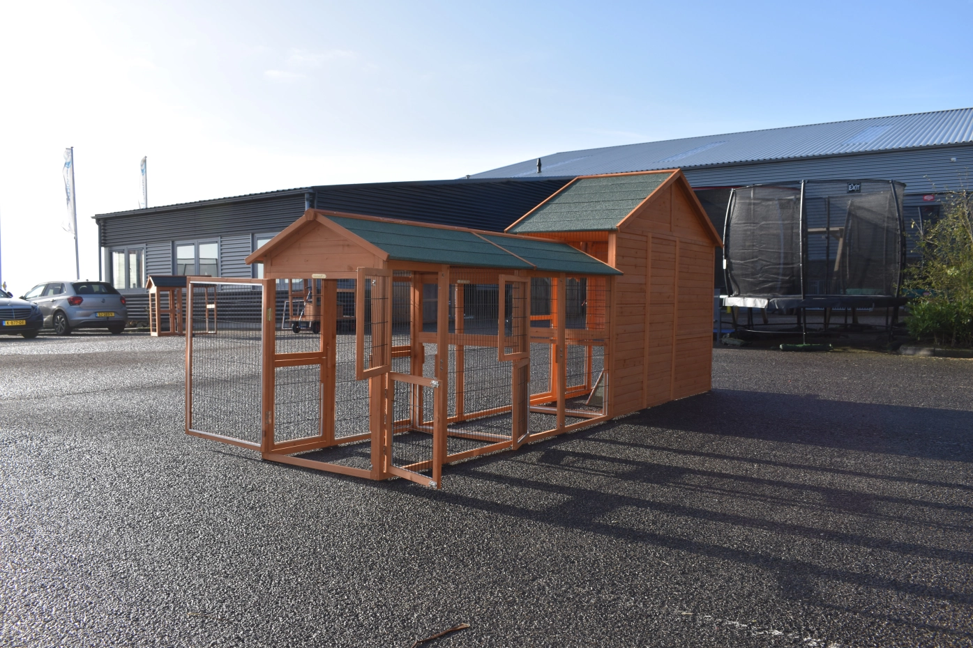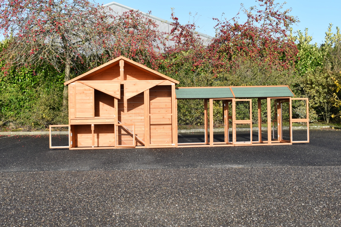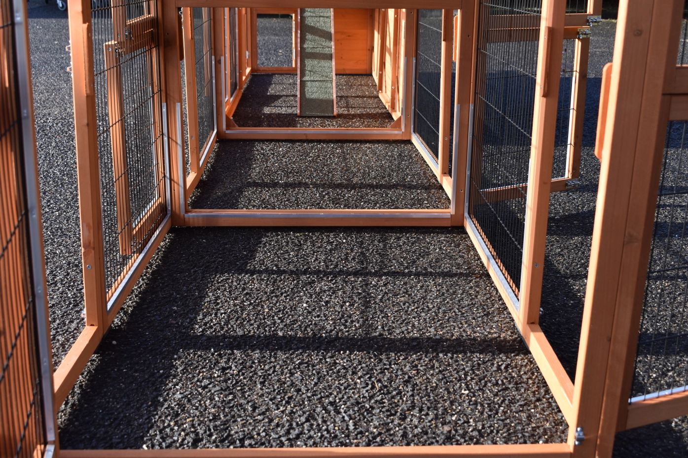 - Um diesen Stall mit einem Auslauf zu kombinieren, muss eine Tür oder ein Gitterteil entfernt werden.