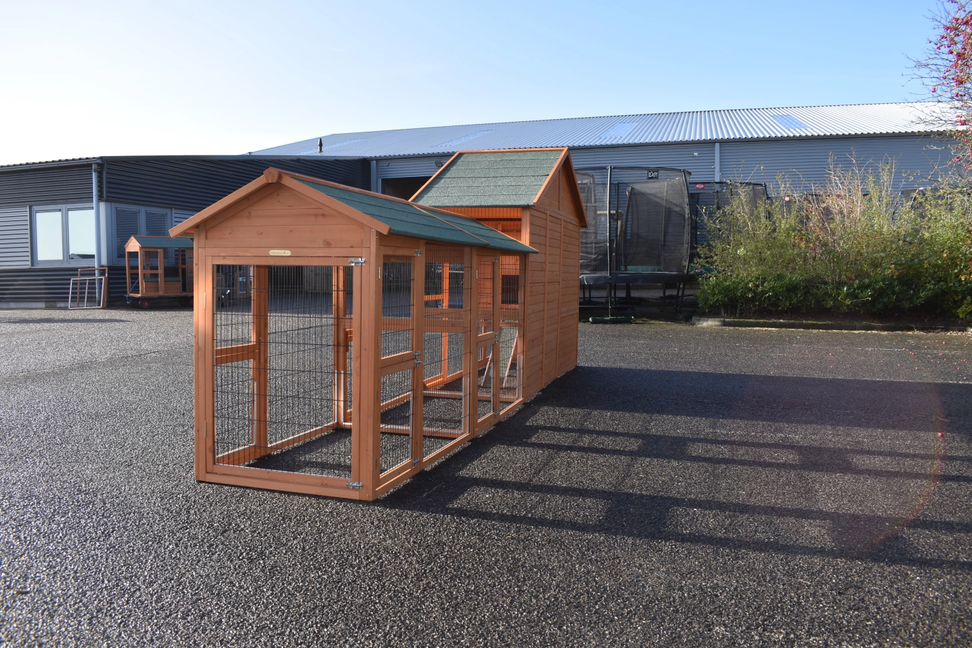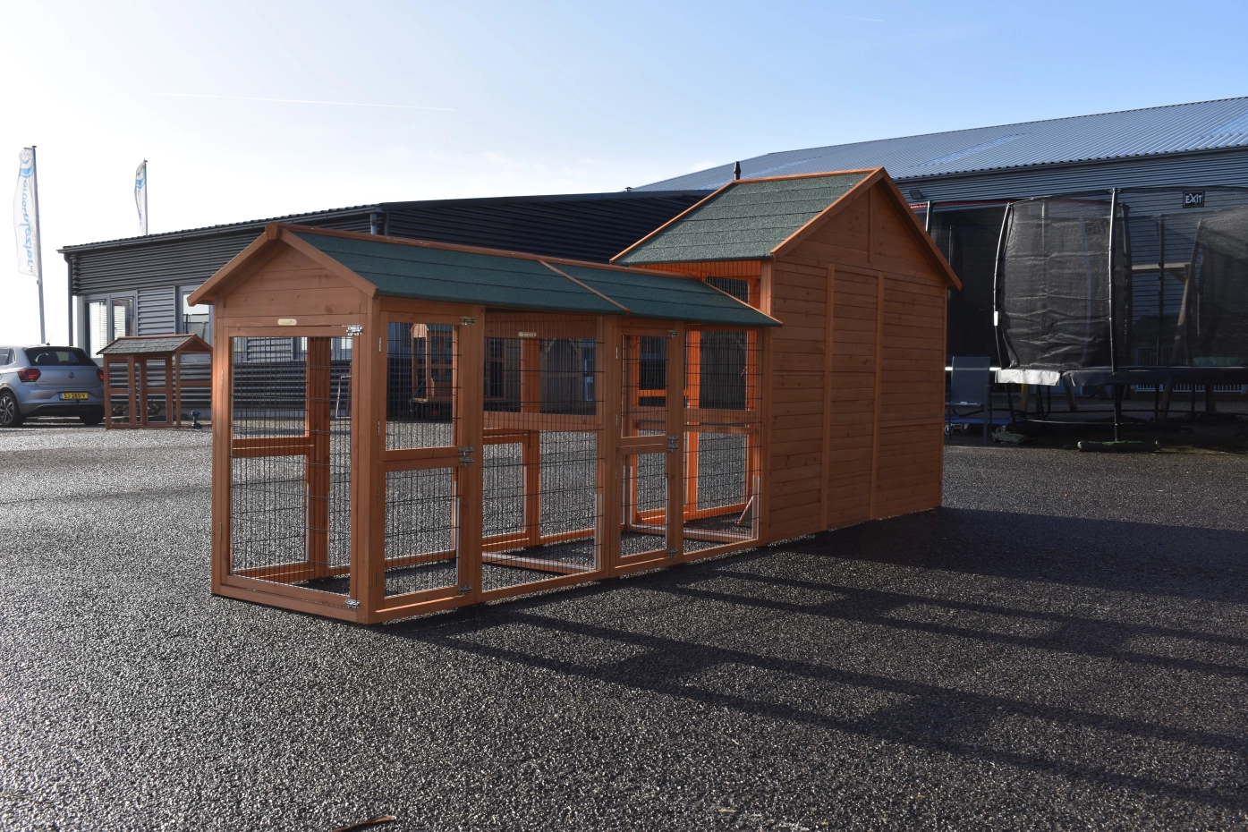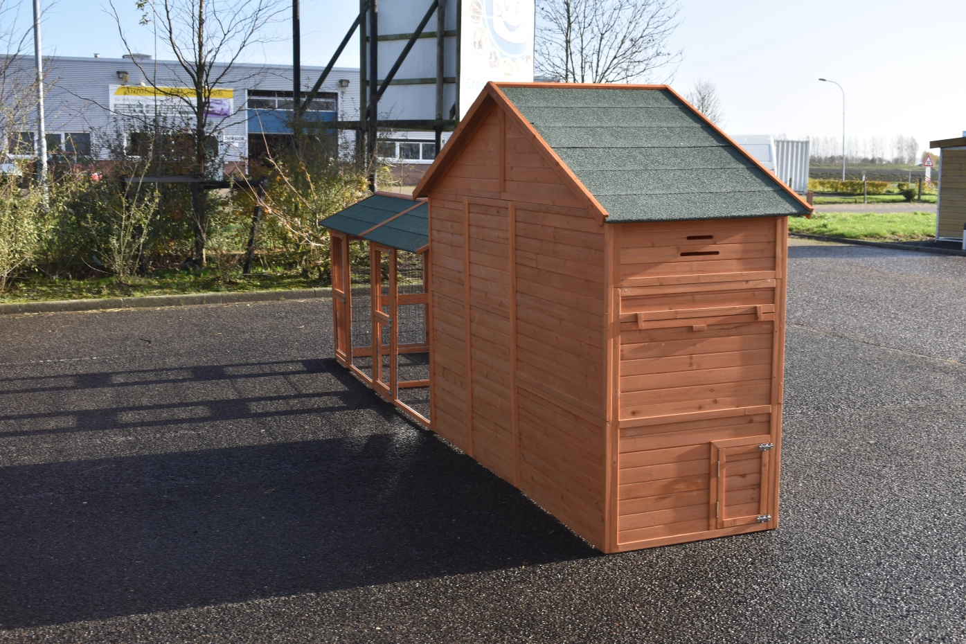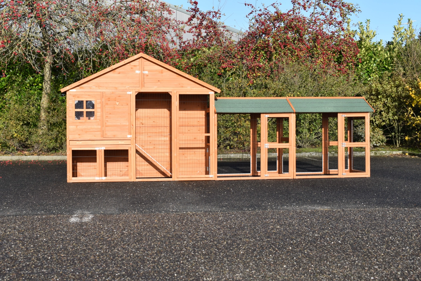 - Um diesen Stall mit einem Auslauf zu kombinieren, muss eine Tür oder ein Gitterteil entfernt werden.