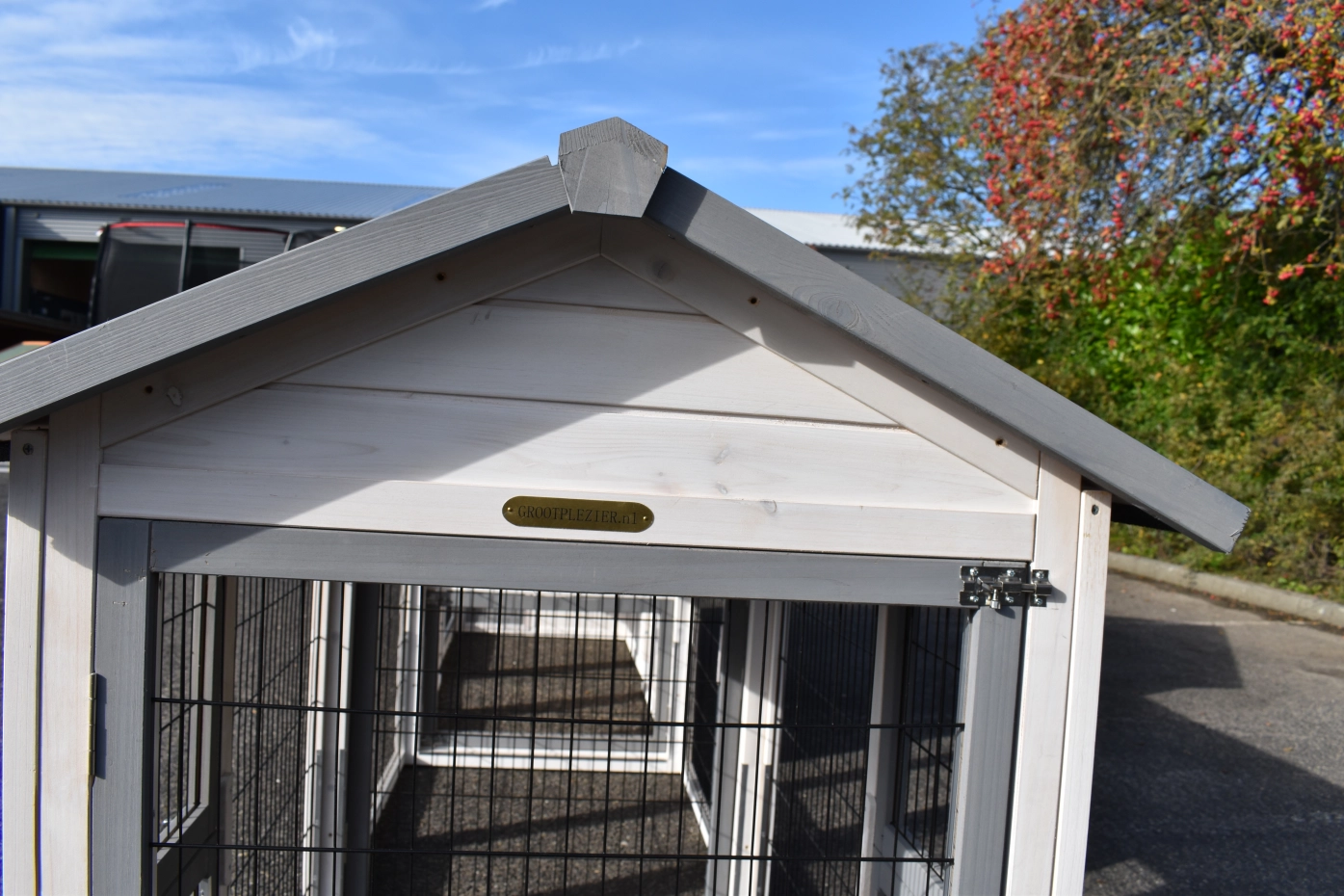 - Um diesen Stall mit einem Auslauf zu kombinieren, muss eine Tür oder ein Gitterteil entfernt werden.