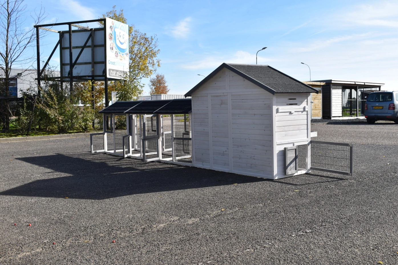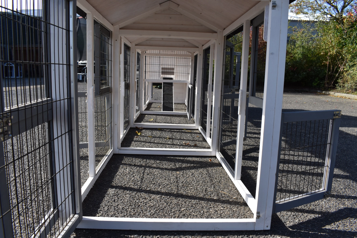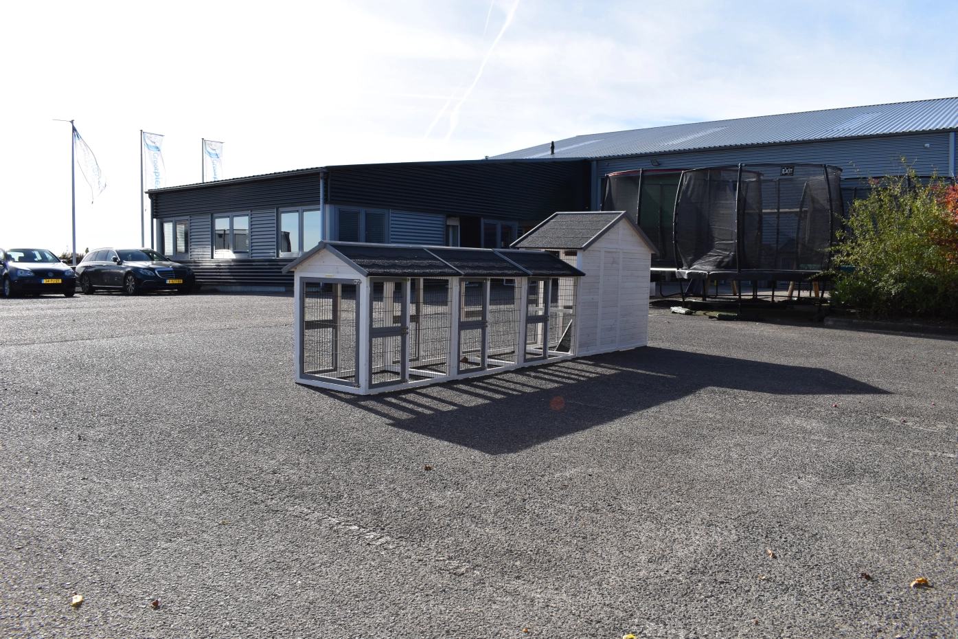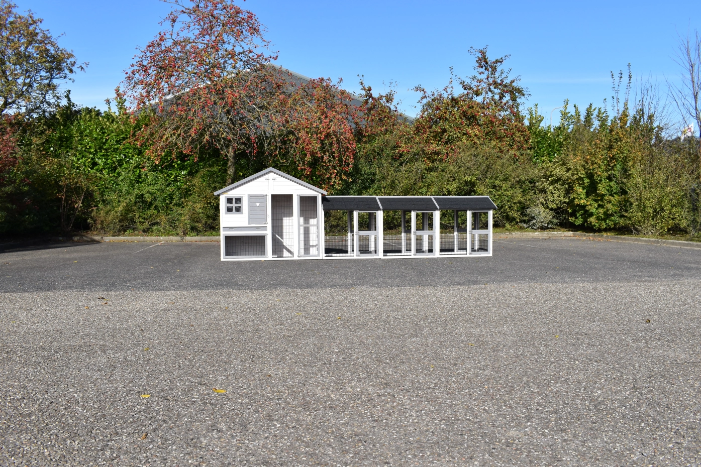 - Um diesen Stall mit einem Auslauf zu kombinieren, muss eine Tür oder ein Gitterteil entfernt werden.