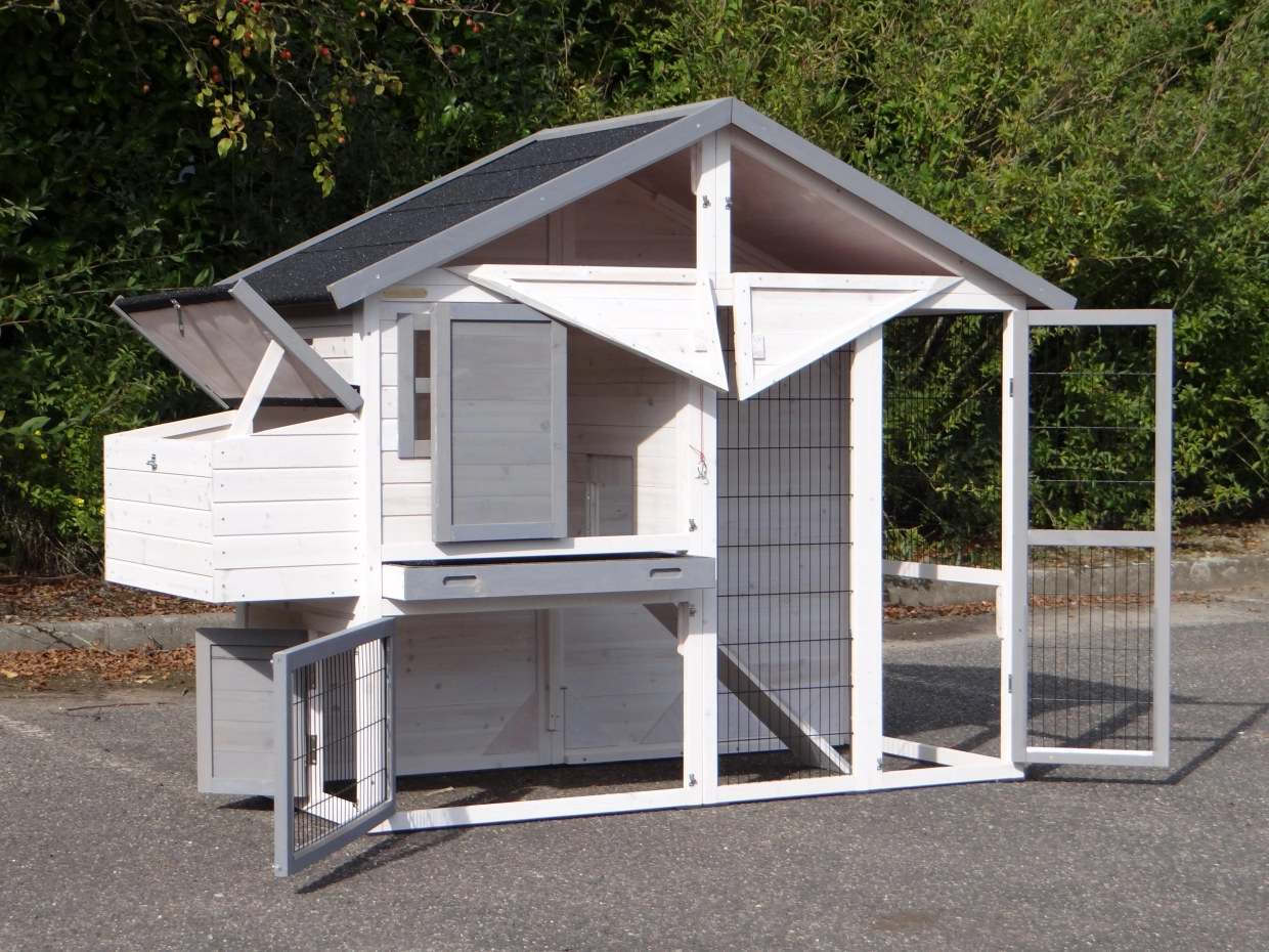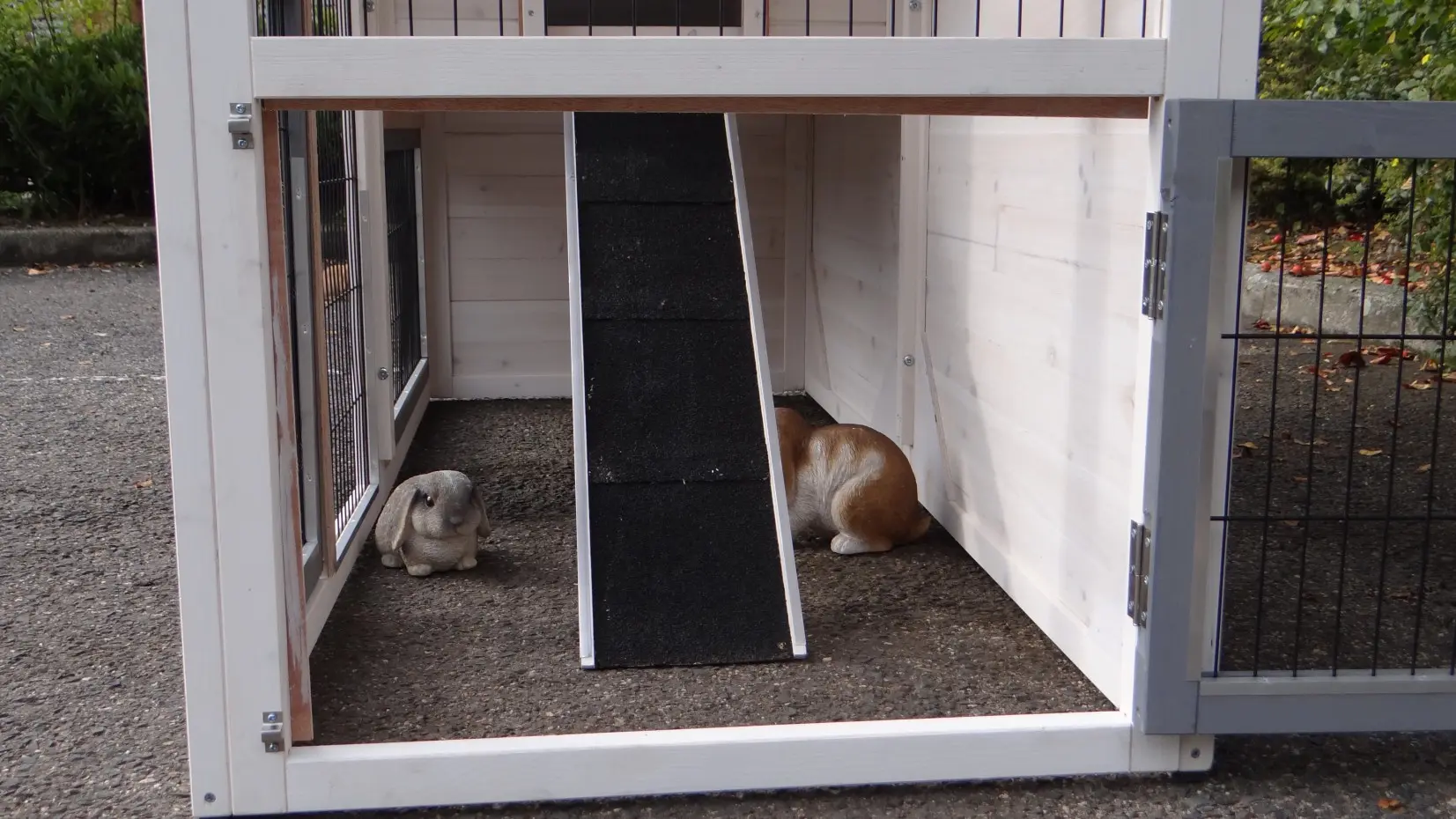 - Die Türen dieses Kaninchenstalls sind mit doppelten Schieberiegeln ausgestattet
