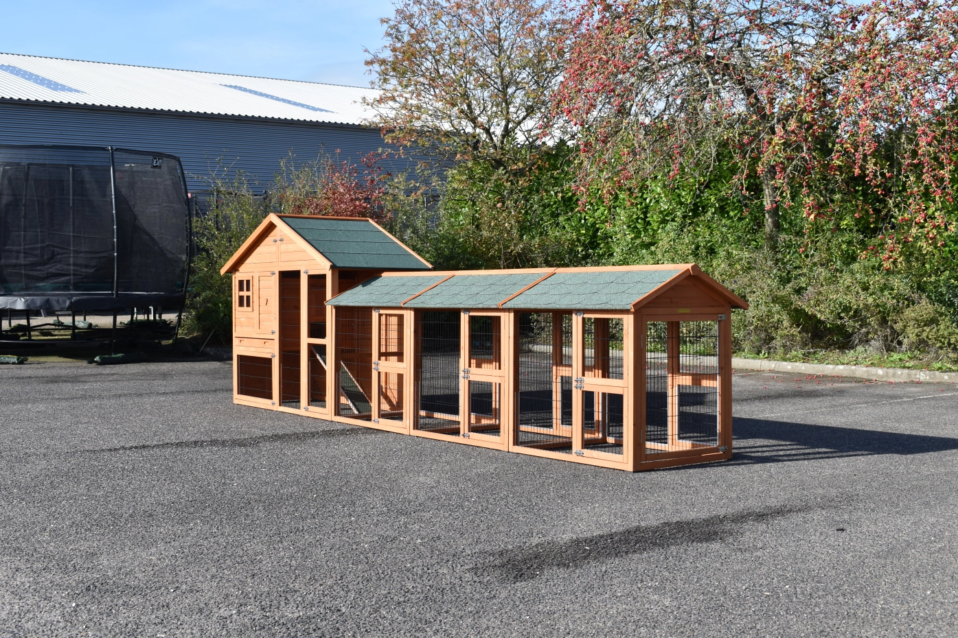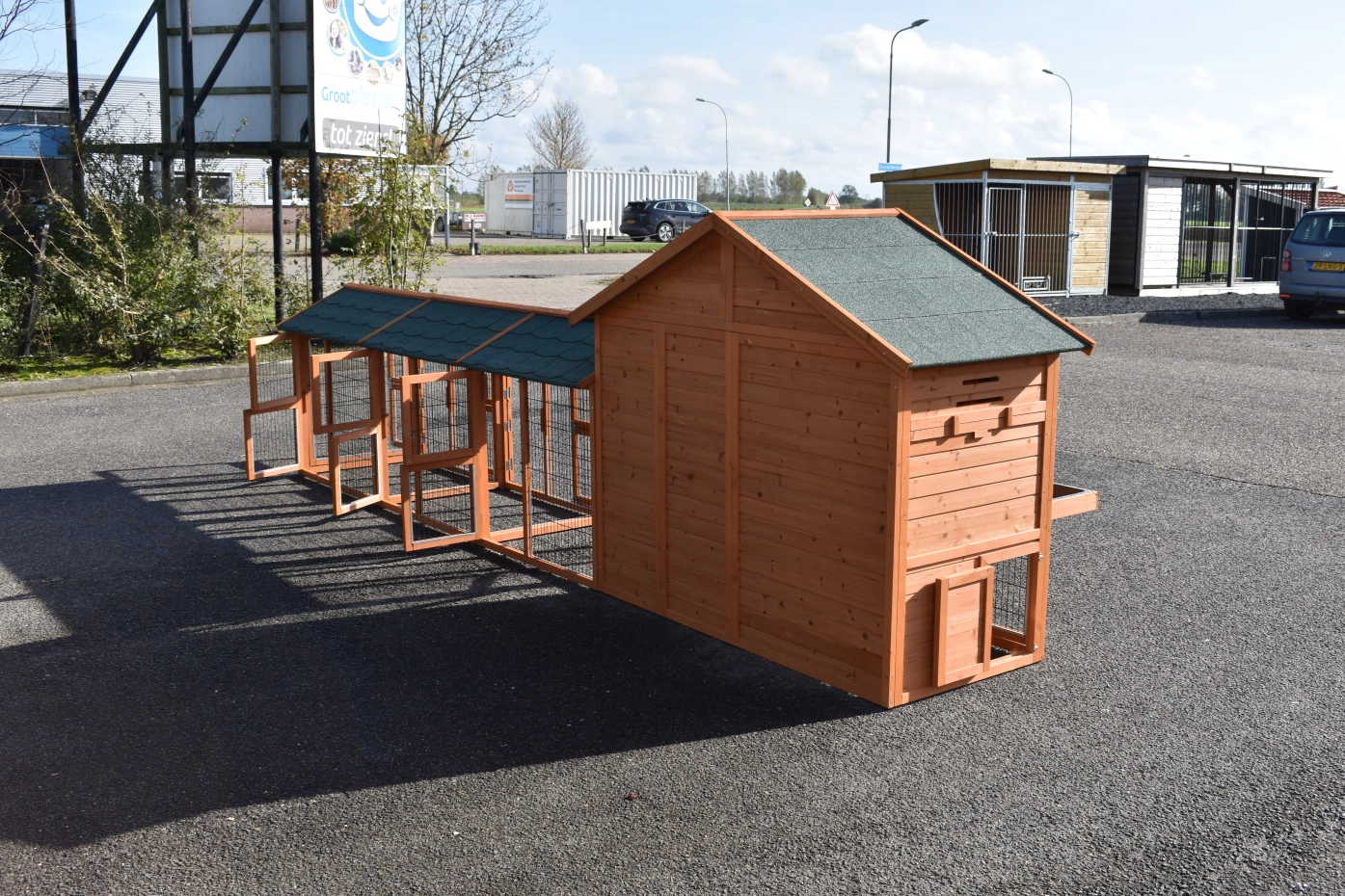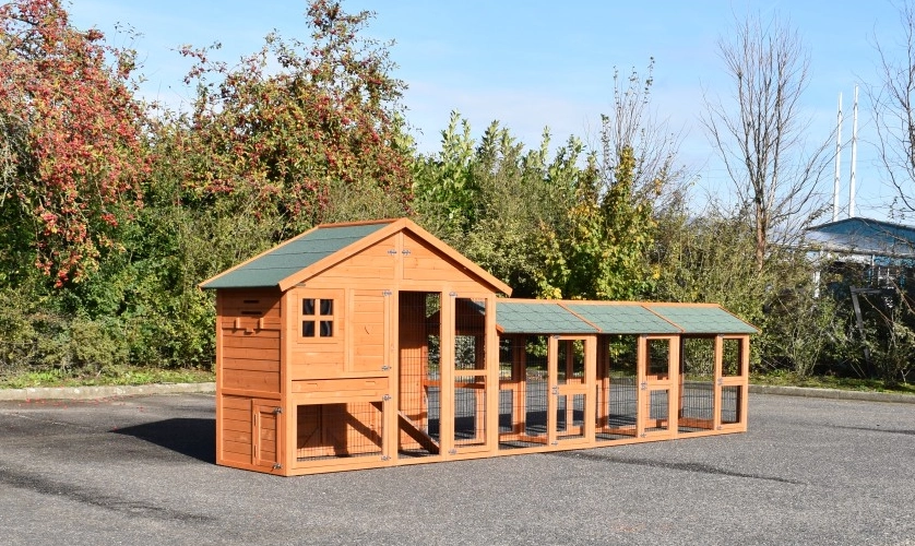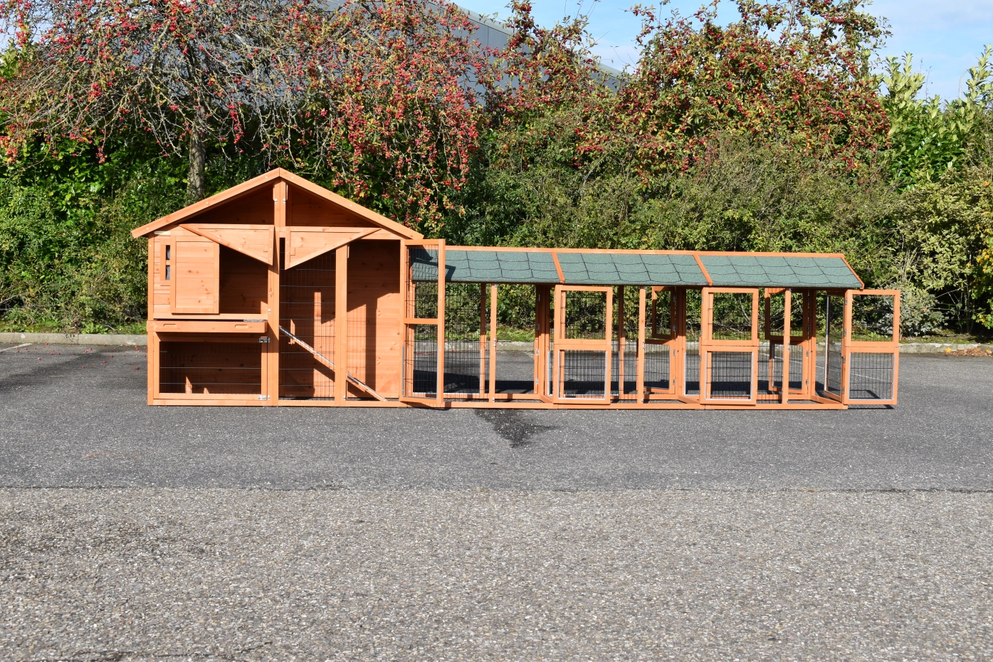 - Um diesen Stall mit einem Auslauf zu kombinieren, muss eine Tür oder ein Gitterteil entfernt werden.