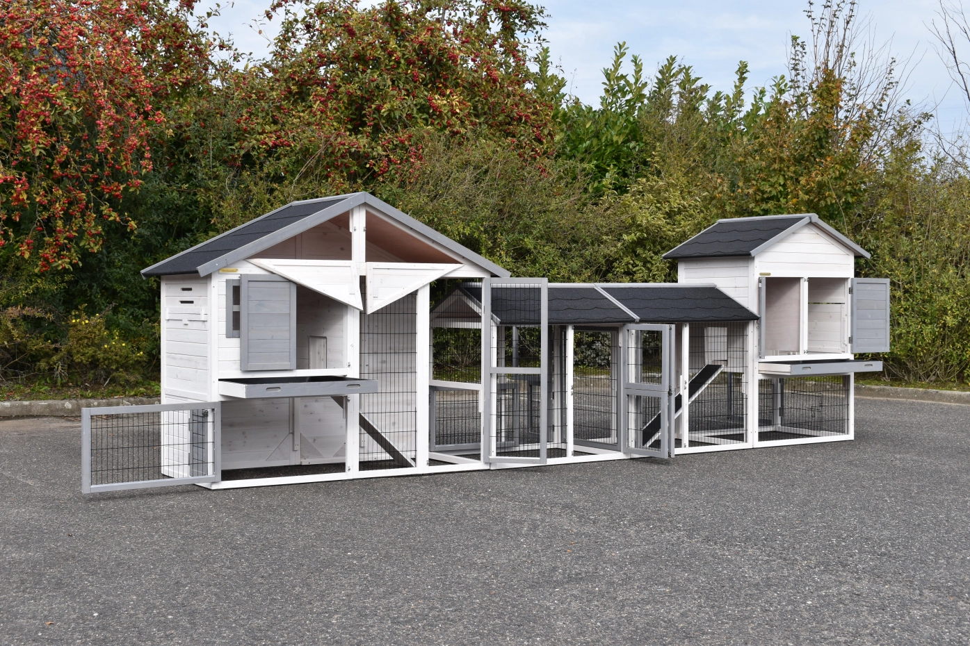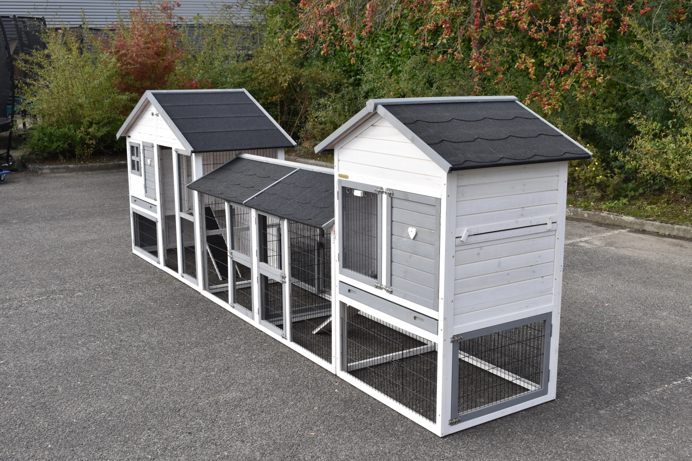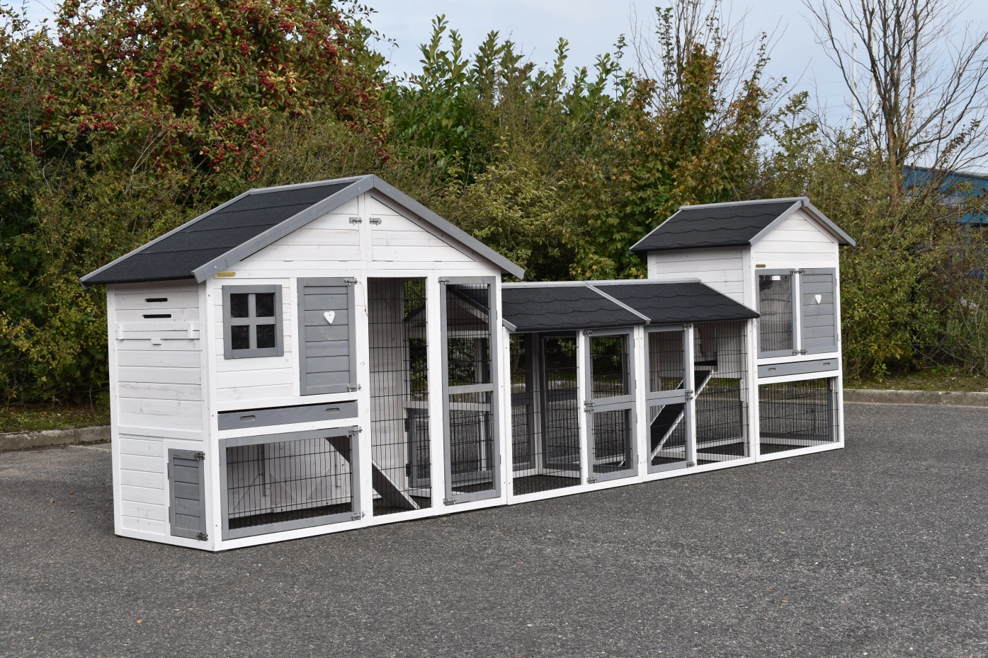 Kaninchenstall Holiday Medium wurde um das Prestige Medium Haus und 2 Gehege erweitert. Die große Kombination eignet sich für 4 bis 8 Kaninchen. Beide Häuser verfügen über eine Schublade und einen Dachboden.