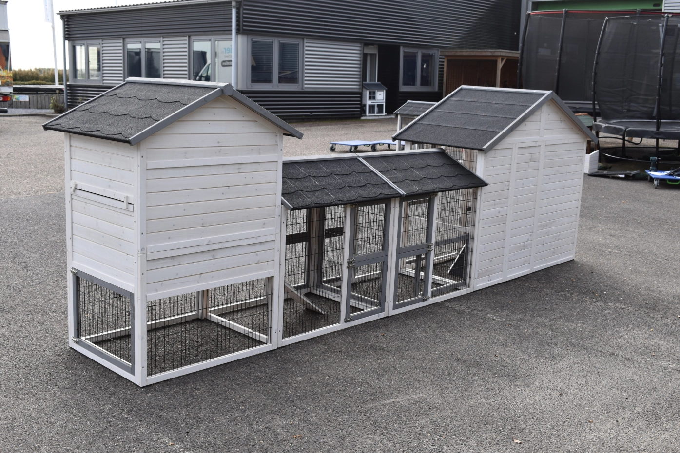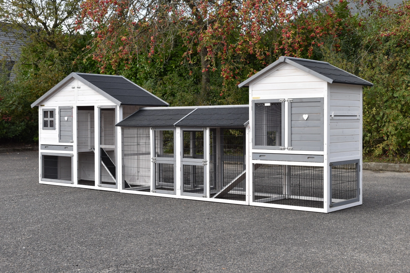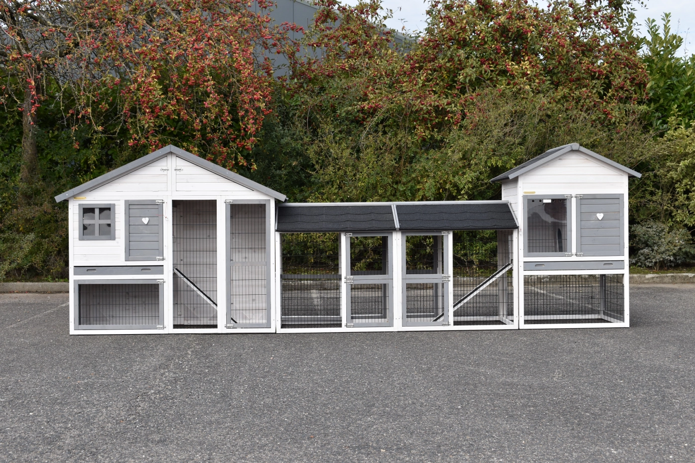 Kaninchenstall Holiday Medium wurde um das Prestige Medium Haus und 2 Gehege erweitert. Die große Kombination eignet sich für 4 bis 8 Kaninchen. Beide Häuser verfügen über eine Schublade und einen Dachboden.