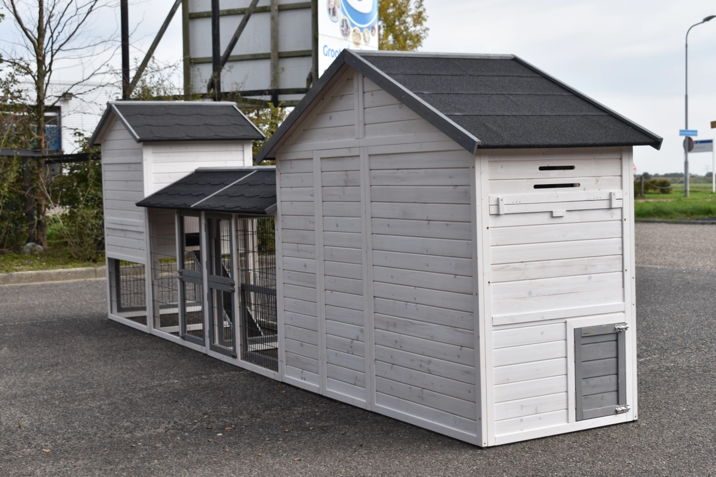 - Um diesen Stall mit einem Auslauf zu kombinieren, muss eine Tür oder ein Gitterteil entfernt werden.