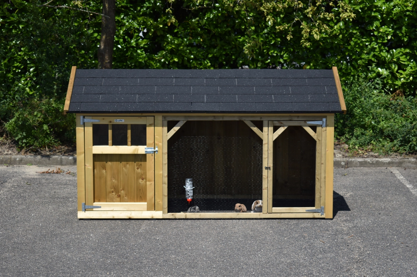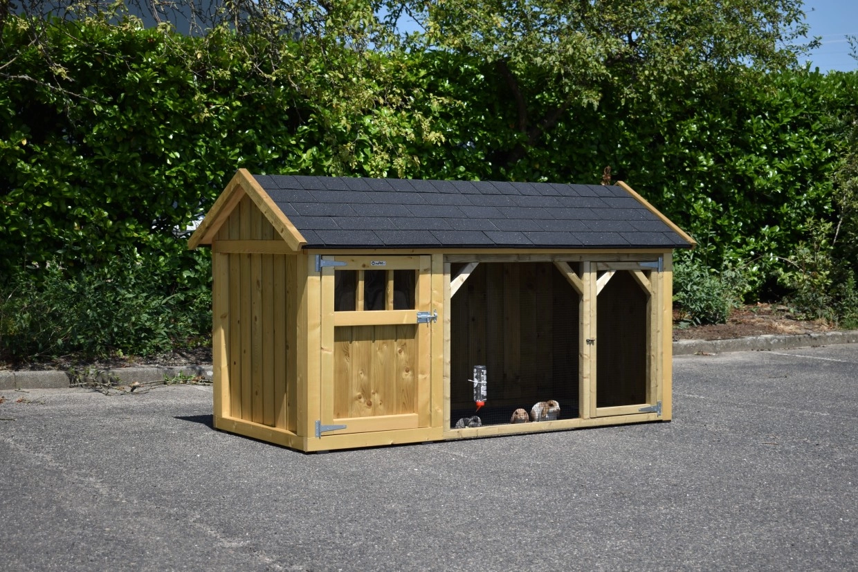 Kaninchenstall Belle 1 mit ein Spitzdach ist ein schöne Kaninchenstall mit ein überdachte Auslauf. Der Schlafraum ist ausgestat mit ein Boden aus imprägniertes Fichtenholz. Wir herstellen diese Stall selbst! Durch die Verwendung von hochwertiger Materialien ist sie sehr wartungsfrei.