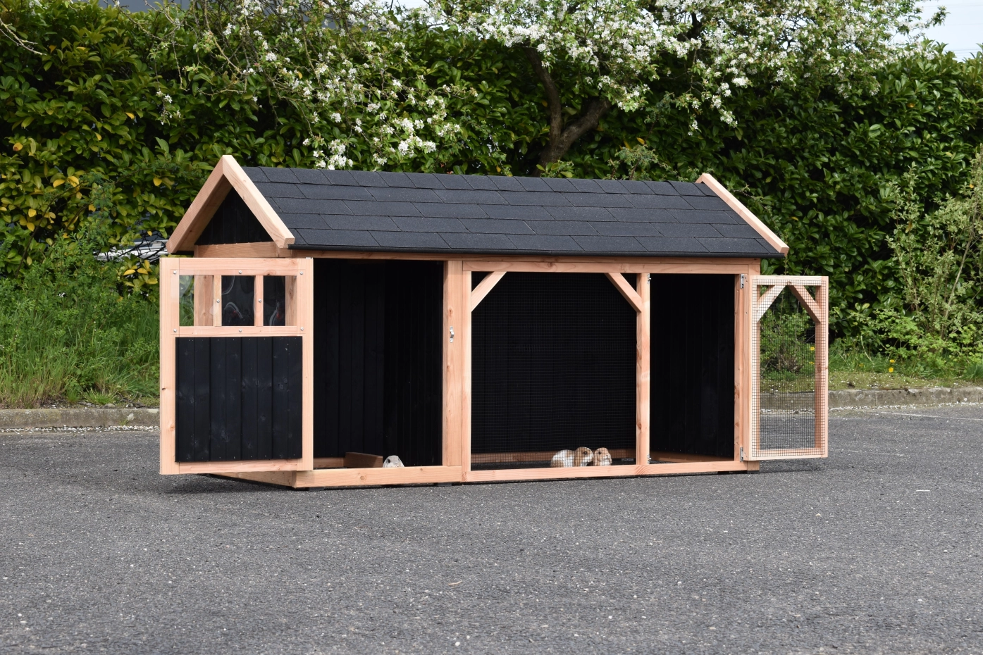 Kaninchenstall Belle 1 mit ein Spitzdach ist ein schöne Kaninchenstall mit ein überdachte Auslauf. Der Schlafraum ist ausgestat mit ein Boden aus Douglasien Holz. Wir herstellen diese Stall selbst! Durch die Verwendung von hochwertiger Materialien ist sie sehr wartungsfrei.