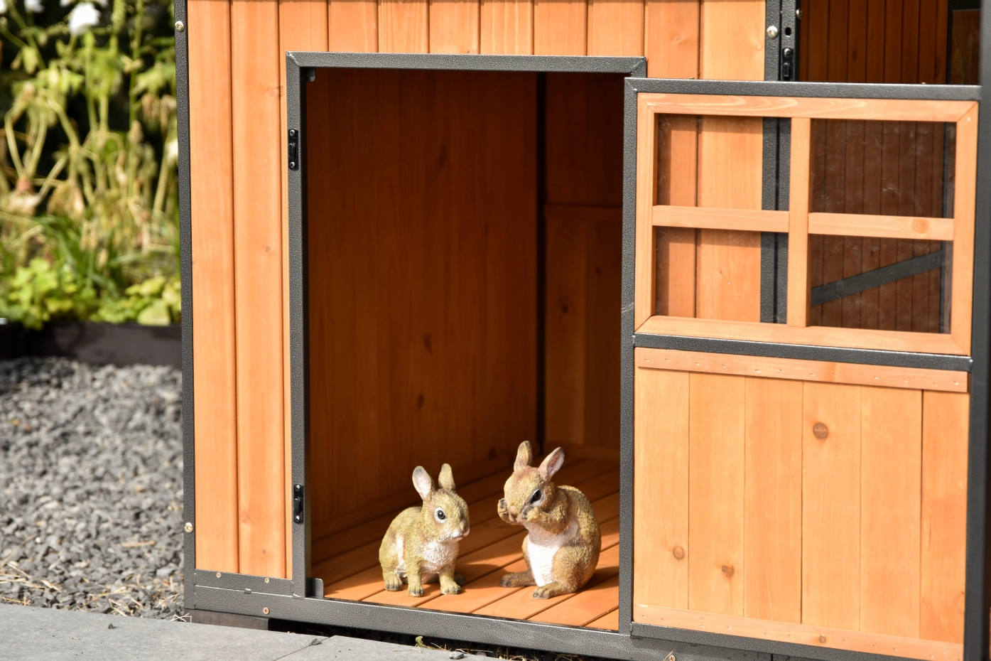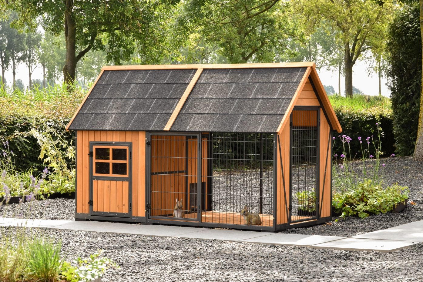 Kaninchenstall Danielle ist sowohl praktisch als auch komfortabel, mit einem markanten Spitzdach, drei Türen und einem Holzboden. Das Schlafhaus von Kaninchenstall Danielle bietet Schutz und Ruhe, während der große Auslauf viel Platz zum Hoppeln bietet. Geeignet für 6 kleine, 4 mittelgroße oder 2 große Kaninchen. Kaninchenstall Danielle ist ein ideales Zuhause für jedes Kaninchen.