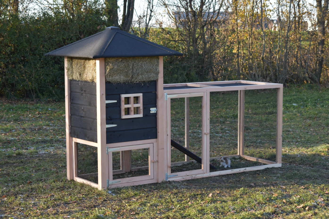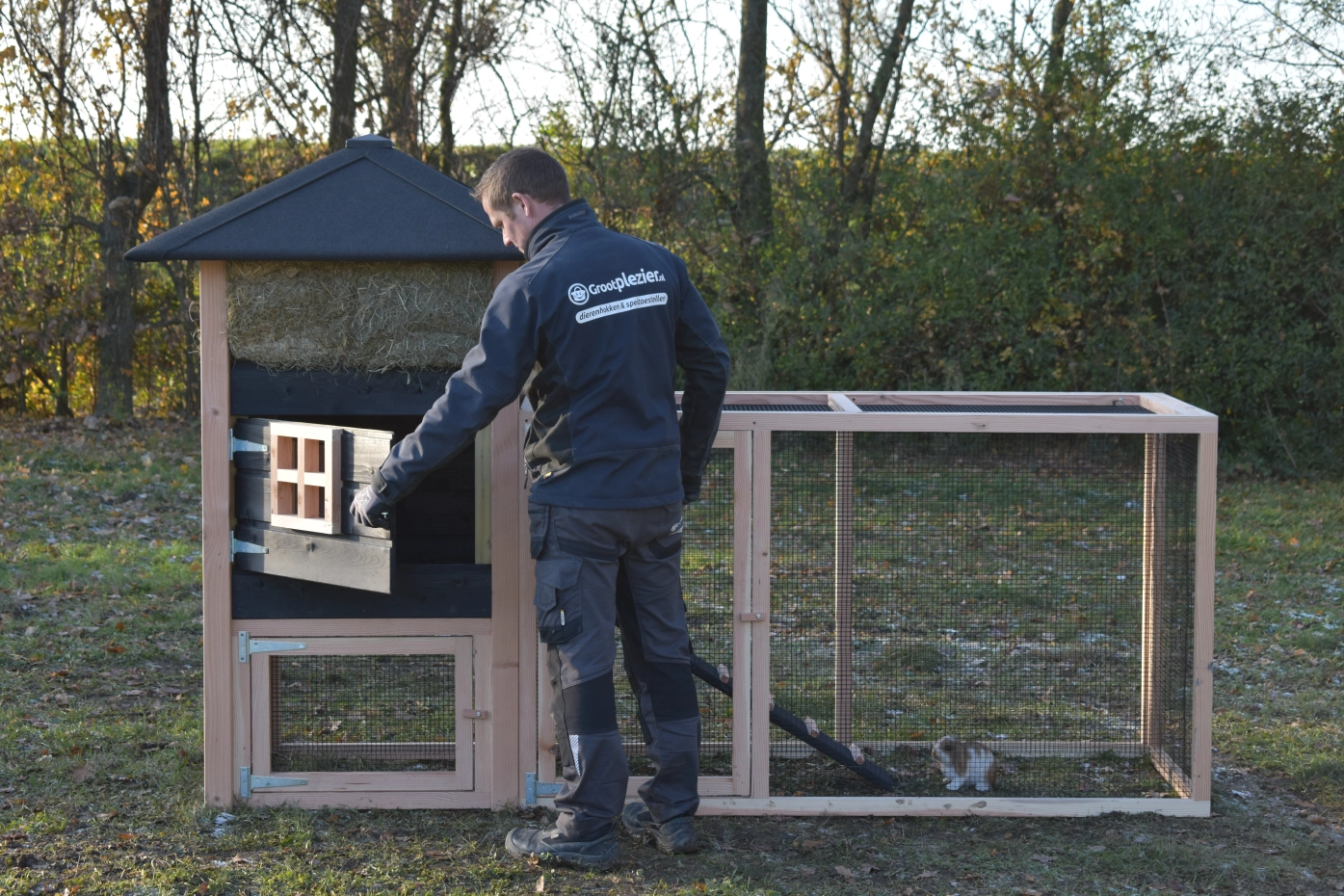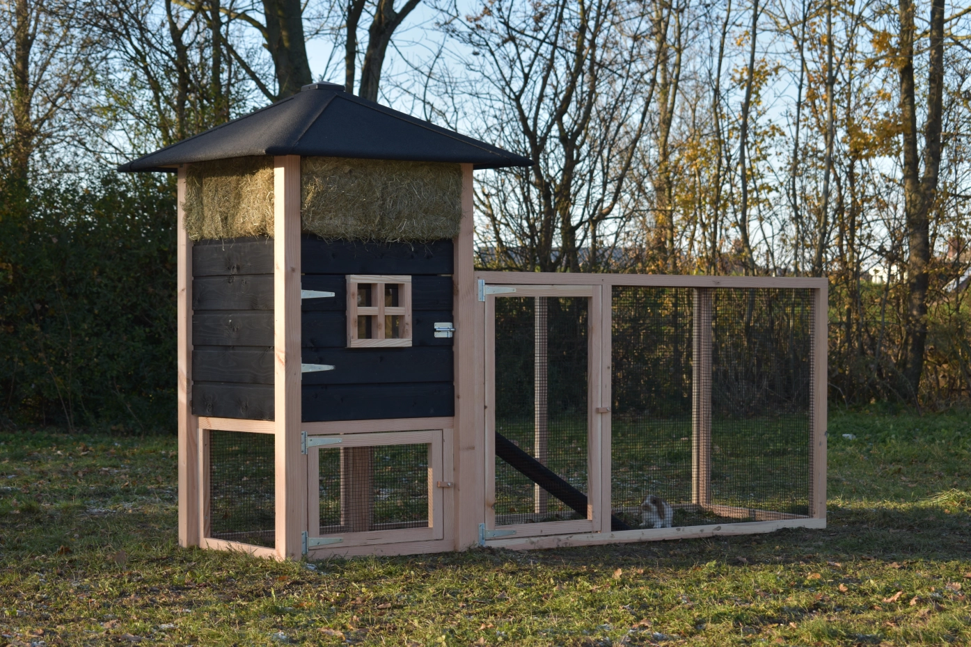Kaninchenstall Heuhaufen Rosanne ist erweitert mit ein Anbau-Auslauf. Wir bieten Ihre Kaninchen ein schöne Platz! Durch das viele Gitter können Sie Ihre Kaninchen gut sehen. Durch der große Türen können Sie der Schlafraum leicht reinigen. Ein schöne Stall für ein gute Preise!