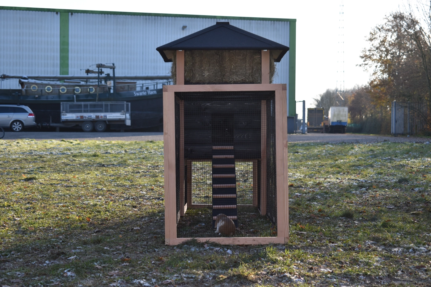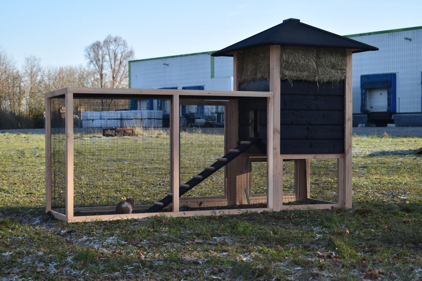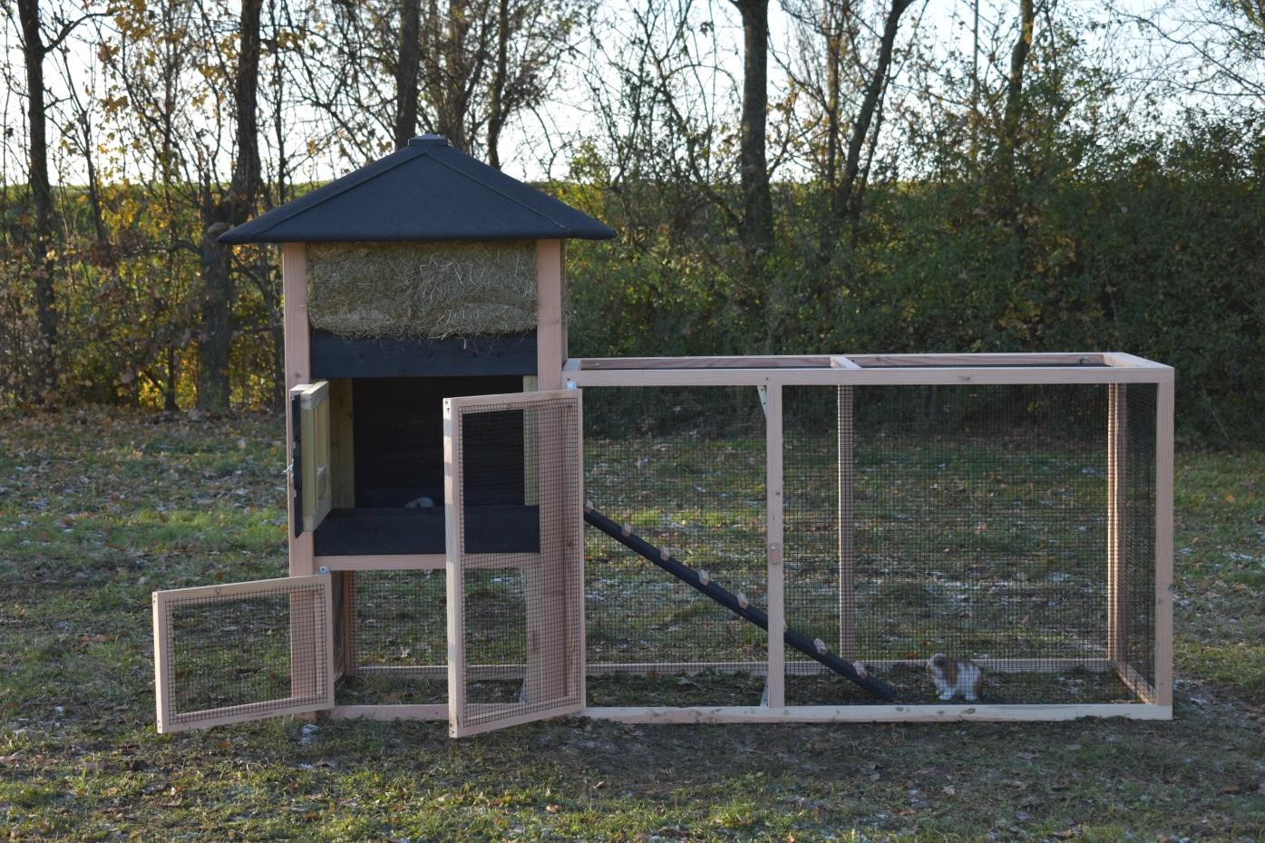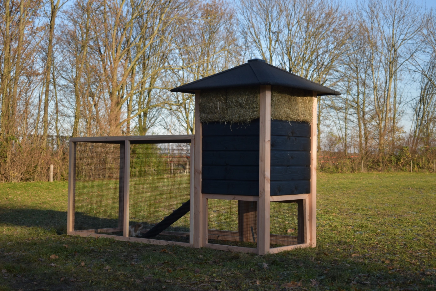 Kaninchenstall Heuhaufen Rosanne ist erweitert mit ein Anbau-Auslauf. Wir bieten Ihre Kaninchen ein schöne Platz! Durch das viele Gitter können Sie Ihre Kaninchen gut sehen. Durch der große Türen können Sie der Schlafraum leicht reinigen. Ein schöne Stall für ein gute Preise!